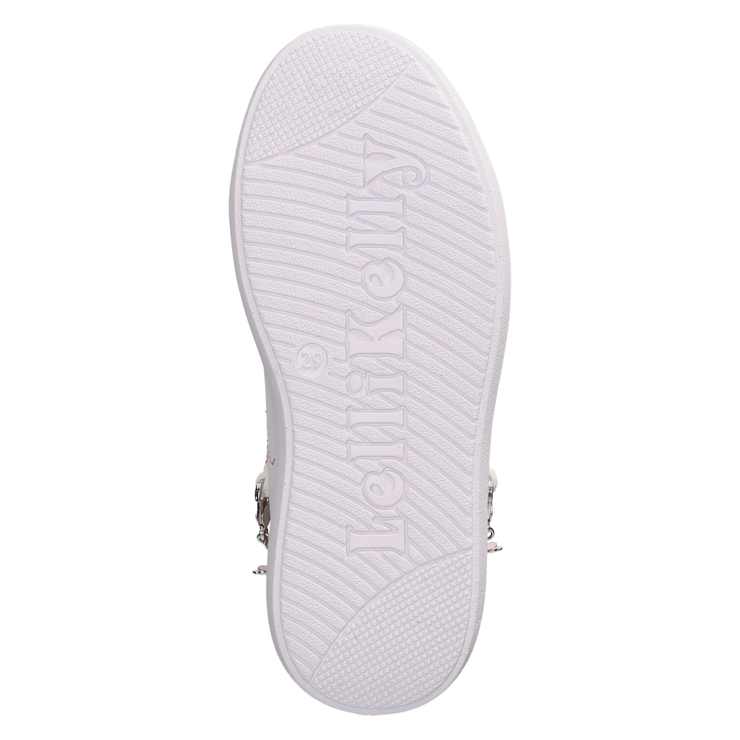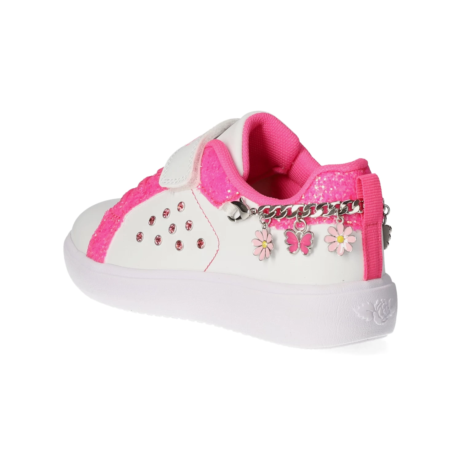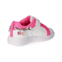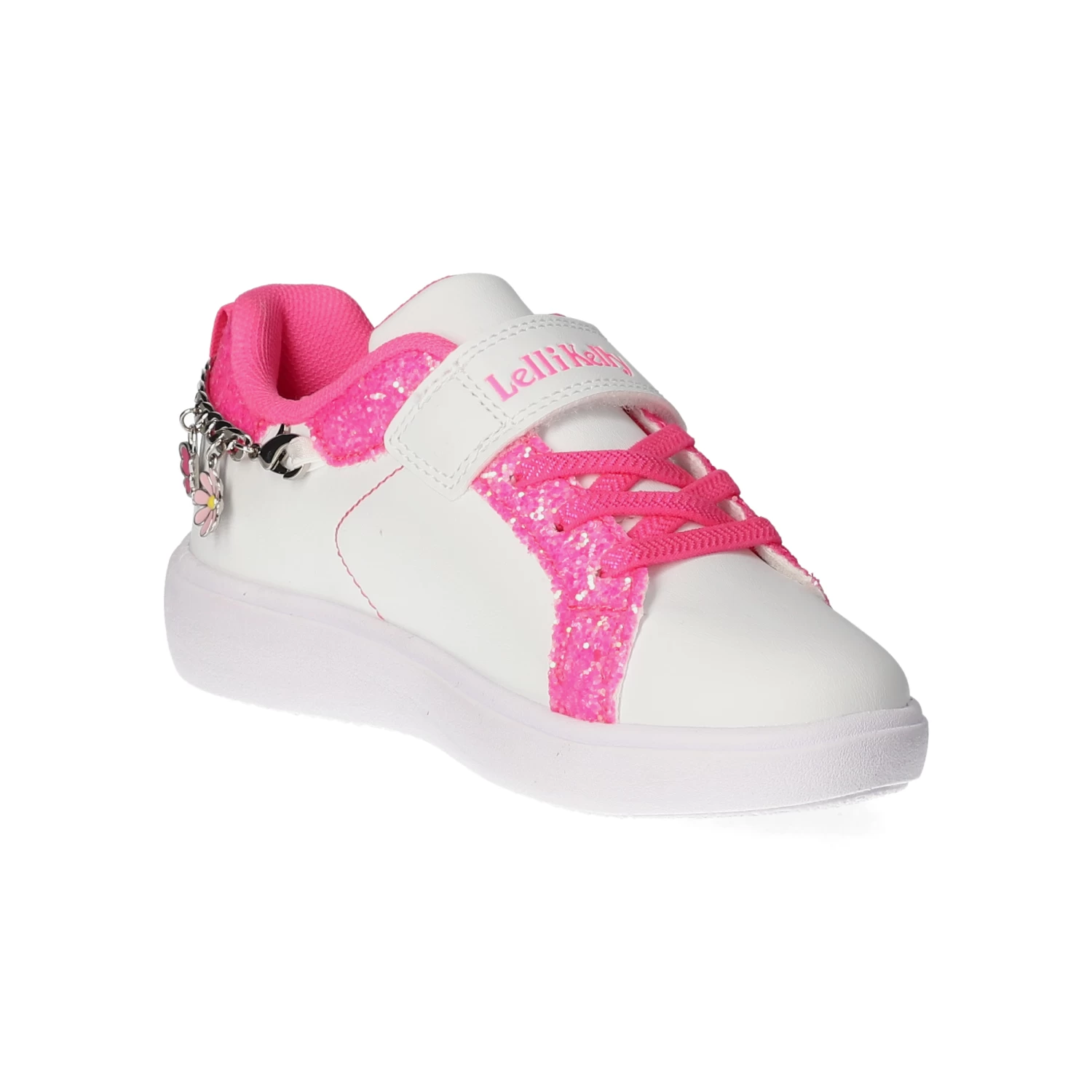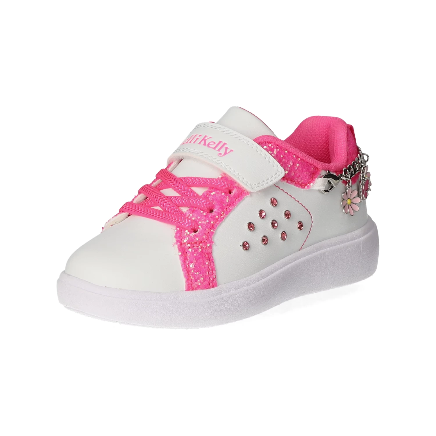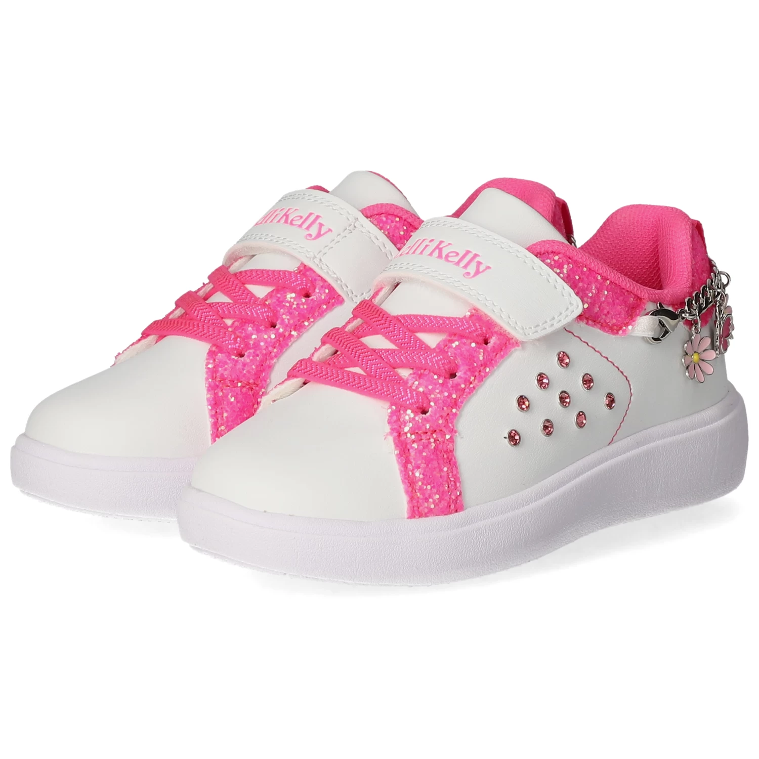 Lelli Kelly Mädchen Low Sneaker GIOIELLO WeiĂź Synthetik – sportliches Design – glitzernde Highlights – typische Markendetails – stylische Zierketten – Klettverschluss und Elastikband – gepolsterter Einstieg – leichtes Textilfutter – dezent gepolsterte Decksohle – flexible, rutschhemmende Laufsohle mit leichtem Profil