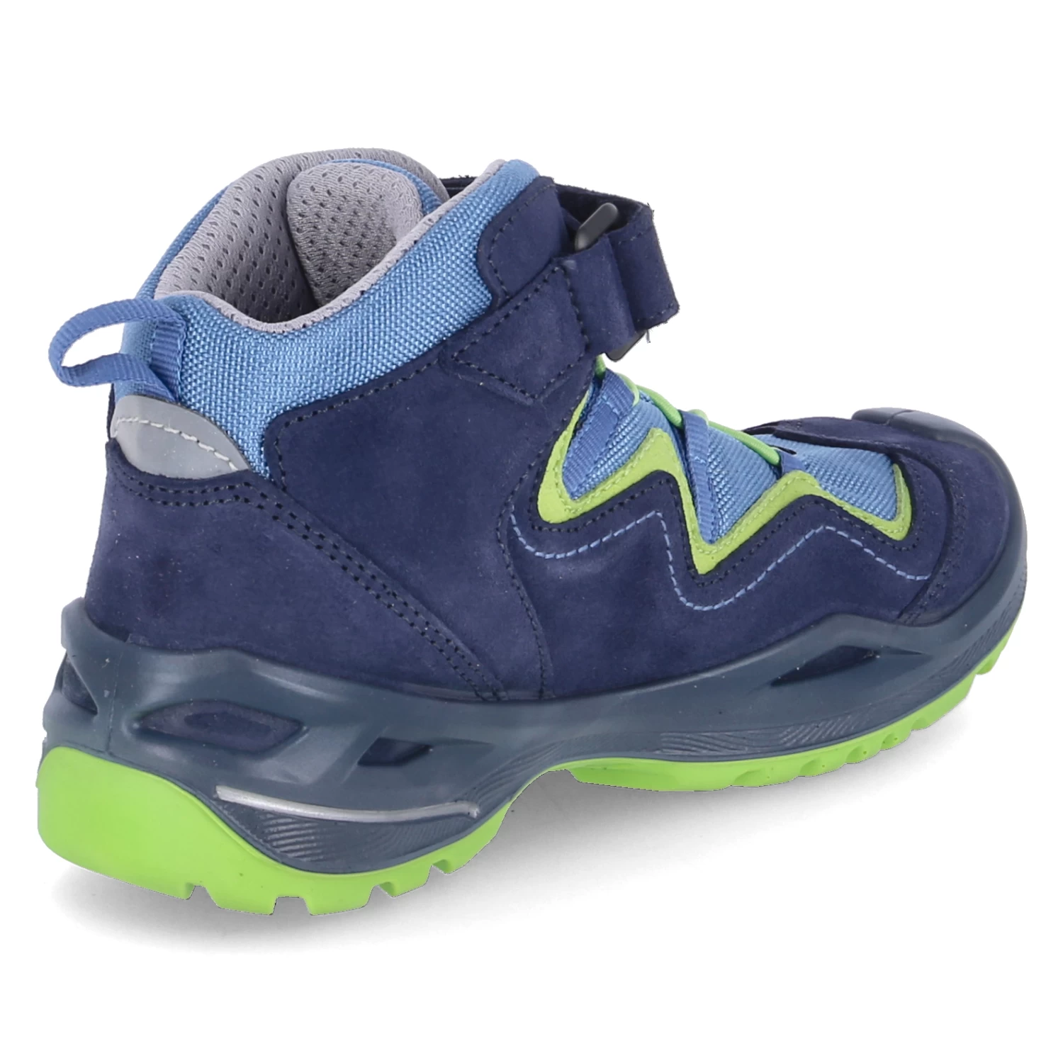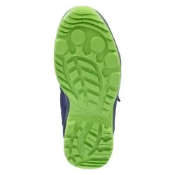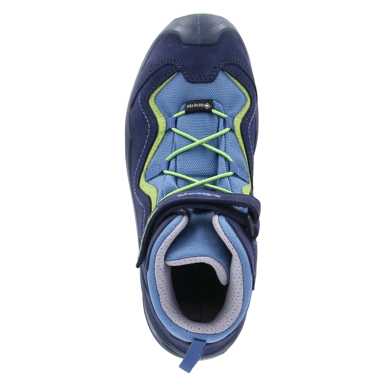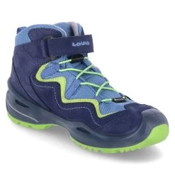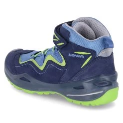 Lowa Kinder Outdoorschuhe/ Wanderschuhe ROBIN EVO Blau Leder-Synthetik-Textil-Mix – wasserfest und atmungsaktiv (Gore-Tex) – grĂĽne Highlights – sportliches Design – Klettverschluss und Elastikband – verstärkter FuĂźrahmen – Anziehlasche – gepolsterter Einstieg – gepolstertes WechselfuĂźbett – flexible, rutschhemmende Profilsohle