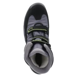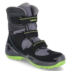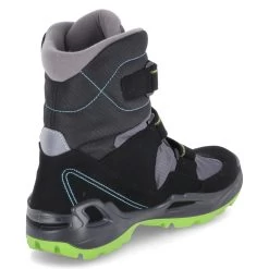 LOWA Jungen Stiefeletten/ Winterboots/ Snowboots MILO GTX Schwarz-Grau Textil-Synthetik-Mix – Goretex (wasserdicht, atmungsaktiv, isolierend) – grüne und blaue Ziernähte – drei Klettriemen – gepolsterter Einstieg – warmes Textilfutter – Wechselfußbett – verstärkter Zehen- und Fersenbereich – flexible, rutschhemmende Profillaufsohle – reflektierende Details