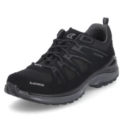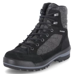 LOWA Jungen Stiefeletten/ Winterboots/ Snowboots MILO GTX Schwarz-Grau Textil-Synthetik-Mix – Goretex (wasserdicht, atmungsaktiv, isolierend) – grüne und blaue Ziernähte – drei Klettriemen – gepolsterter Einstieg – warmes Textilfutter – Wechselfußbett – verstärkter Zehen- und Fersenbereich – flexible, rutschhemmende Profillaufsohle – reflektierende Details
