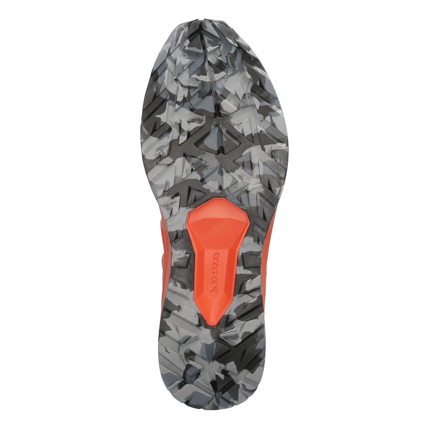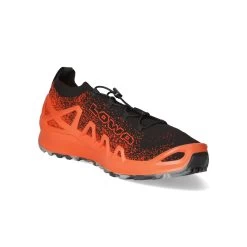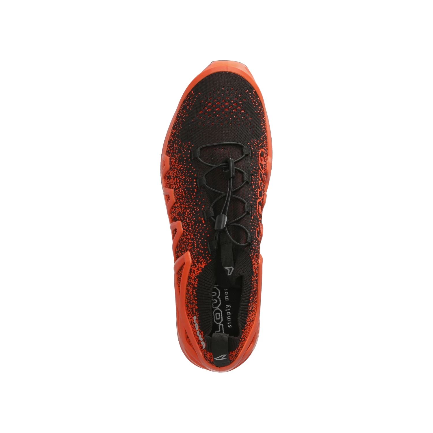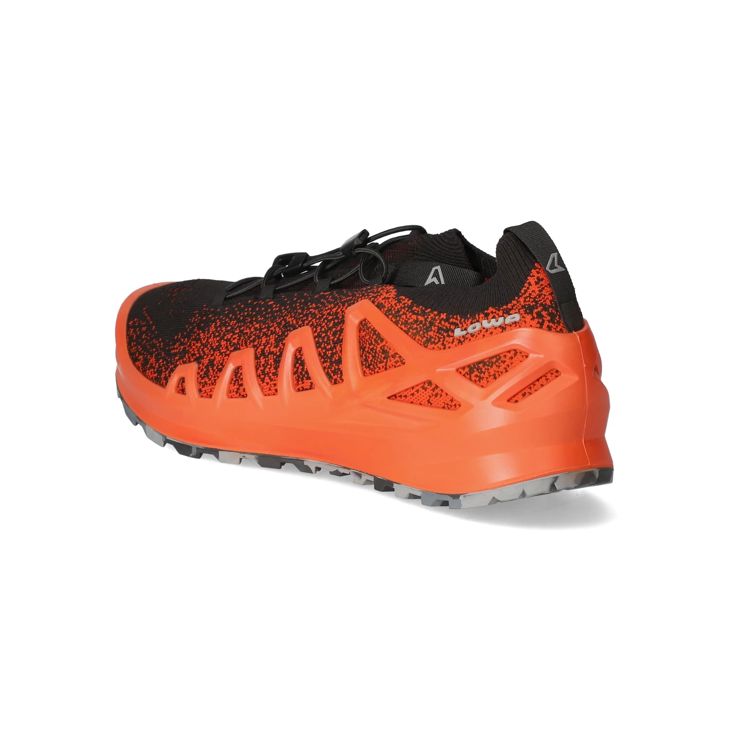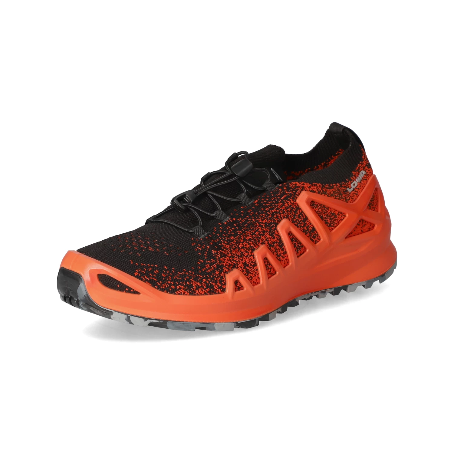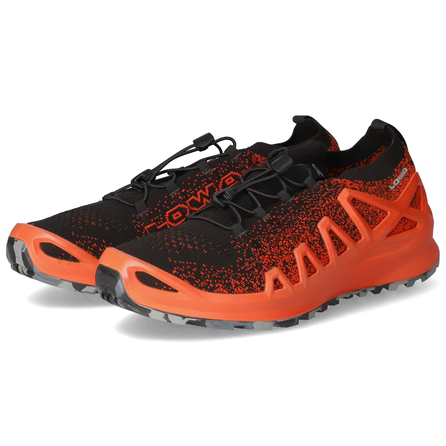 LOWA Herren Trailrunningschuhe/ Outdoorschuhe FUSION Schwarz/Orange Textil-Synthetik-Mix – praktische Anziehlaschen – elastischer Einstiegsbund und Schnellverschluss – dezente Markendetails – sportlicher Print – seitliche Verstärkung – gepolstertes WechselfuĂźbett – verstärkter Fersen- und Zehenbereich – flexible, rutschhemmende Profilsohle