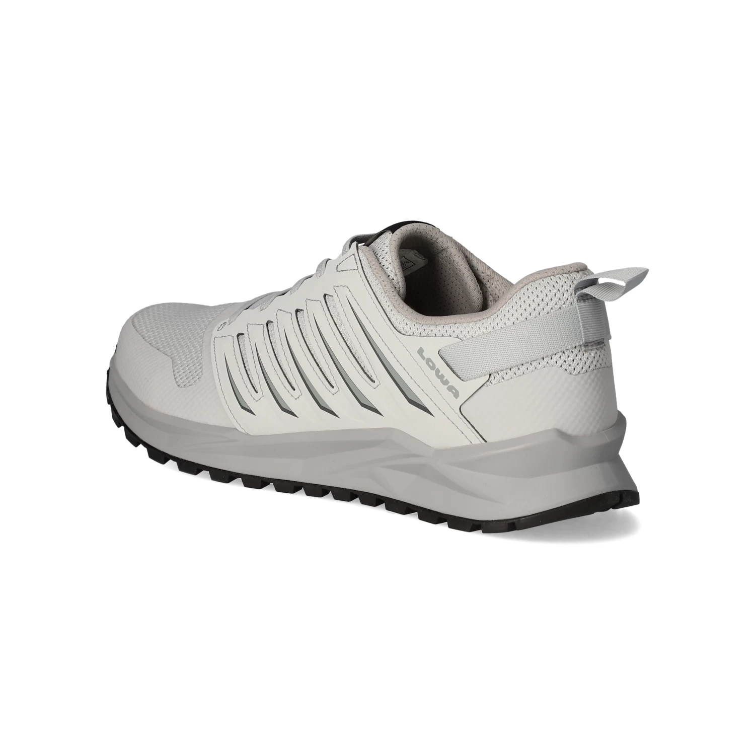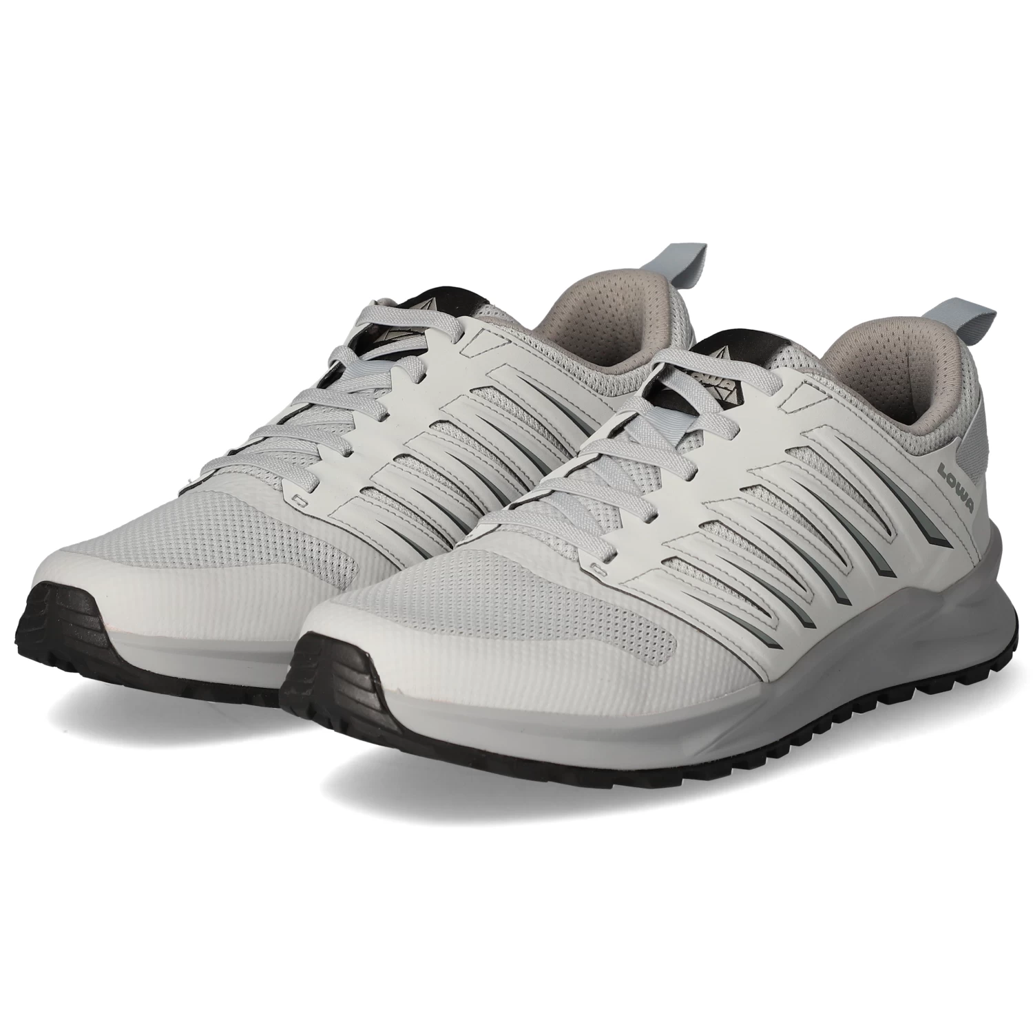 LOWA Herren Trailrunningschuhe/ Outdoorschuhe VENTO Grau Textil-Synthetik-Mix – klassischer SchnĂĽrverschluss – Anziehlasche – seitliche Verstärkung mit sportlichen Zierstreifen – gepolsterter Einstieg – verstärkter Fersen- und Zehenbereich – dezente Markendetails – gepolstertes WechselfuĂźbett – angenehmes Textilfutter – flexible, rutschhemmende Profilslaufsohle