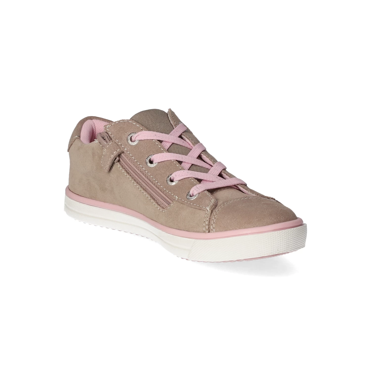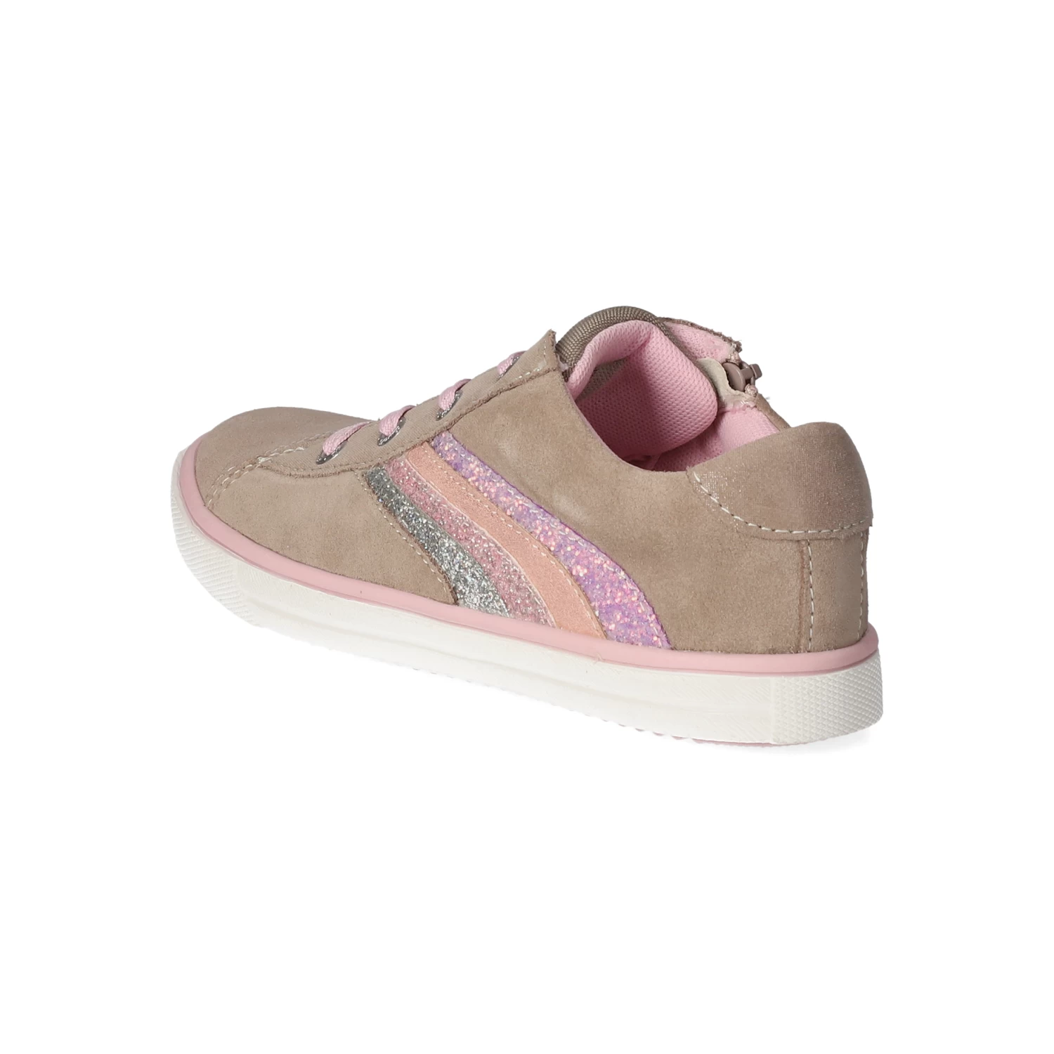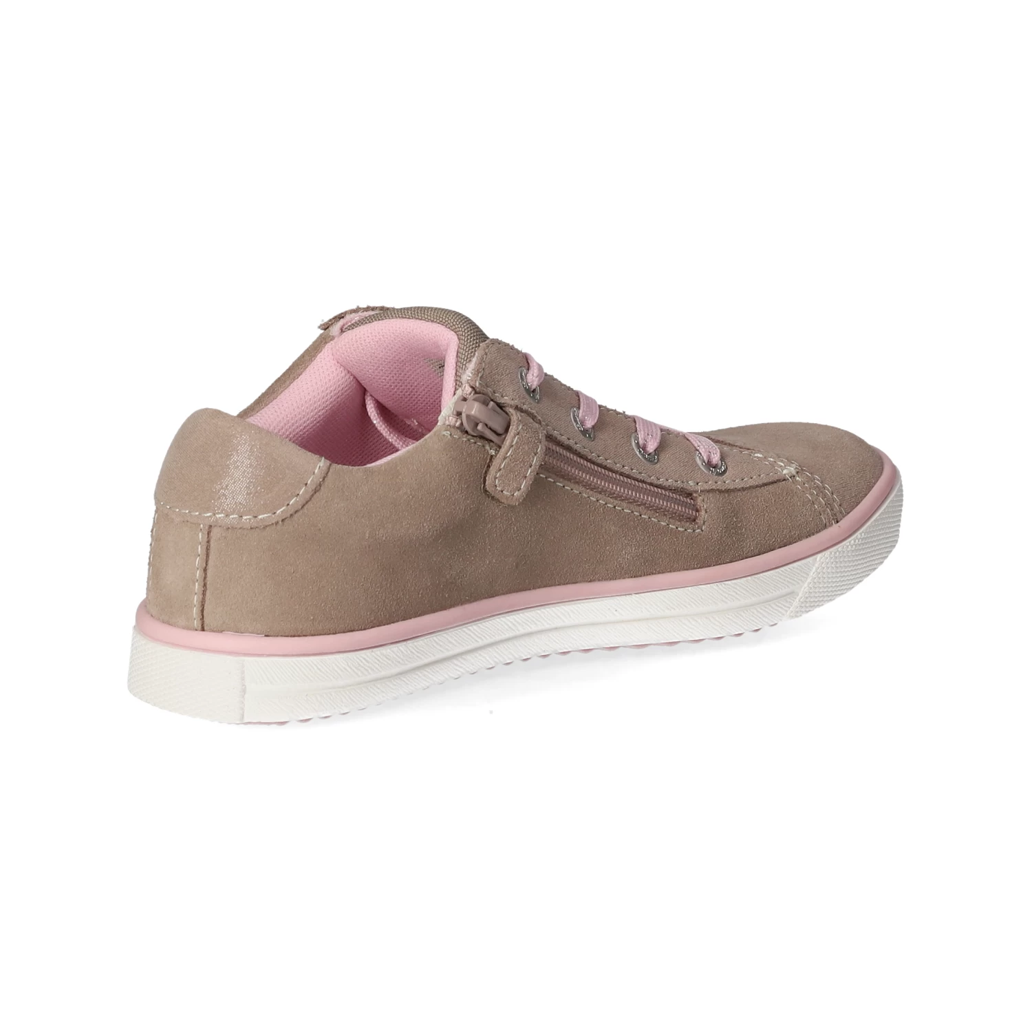 Lurchi Mädchen Low Sneaker SANITA Taupe Rauleder – sportliches Design – glitzernde Zierstreifen – SchnĂĽrung und ReiĂźverschluss – rosa Highlights – verstärkter Zehen- und Fersenbereich – gepolsterter Einstieg – leichtes Textilfutter – herausnehmbare Decksohle – flexible, rutschhemmende Profilsohle