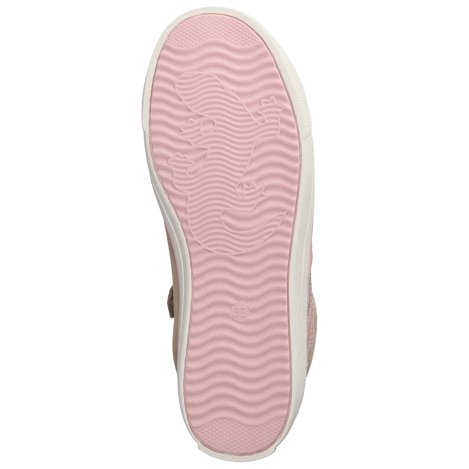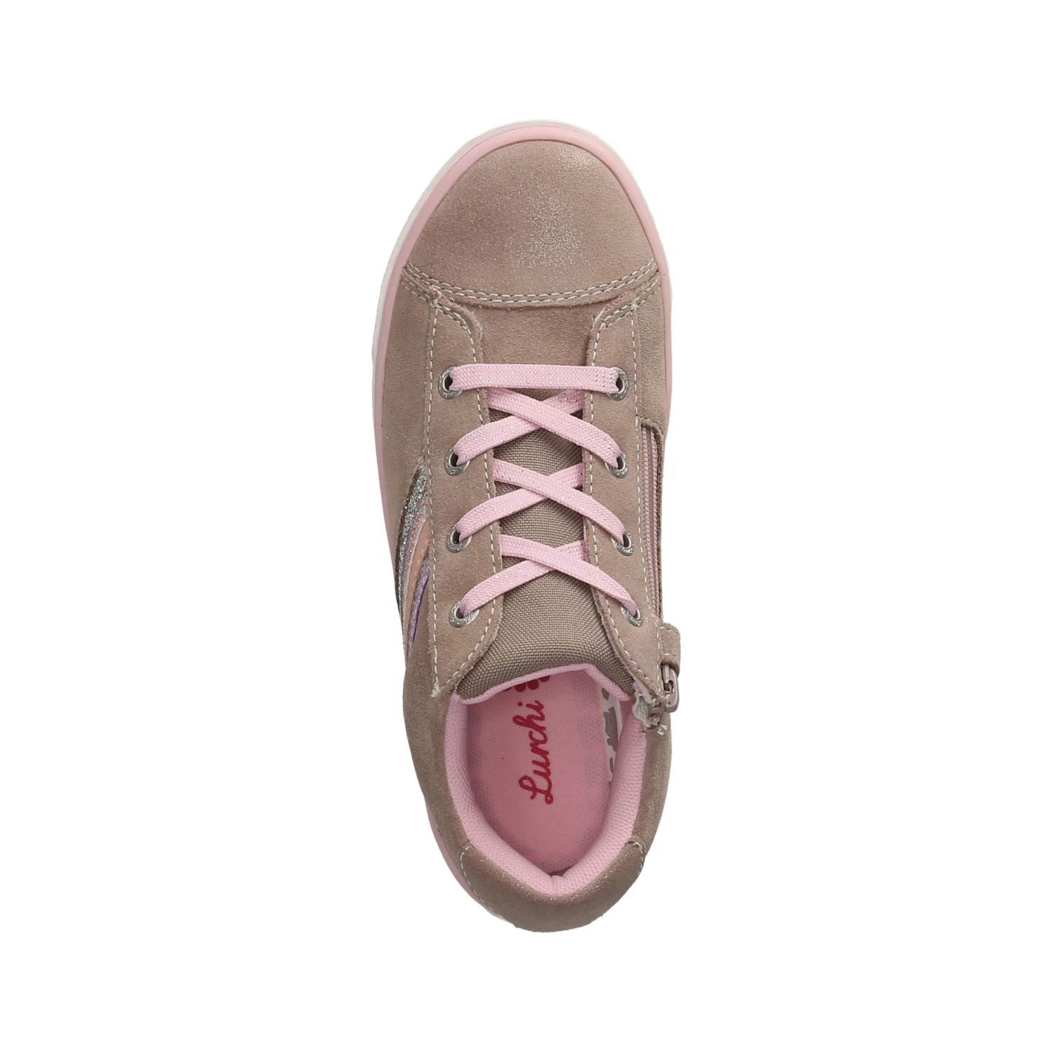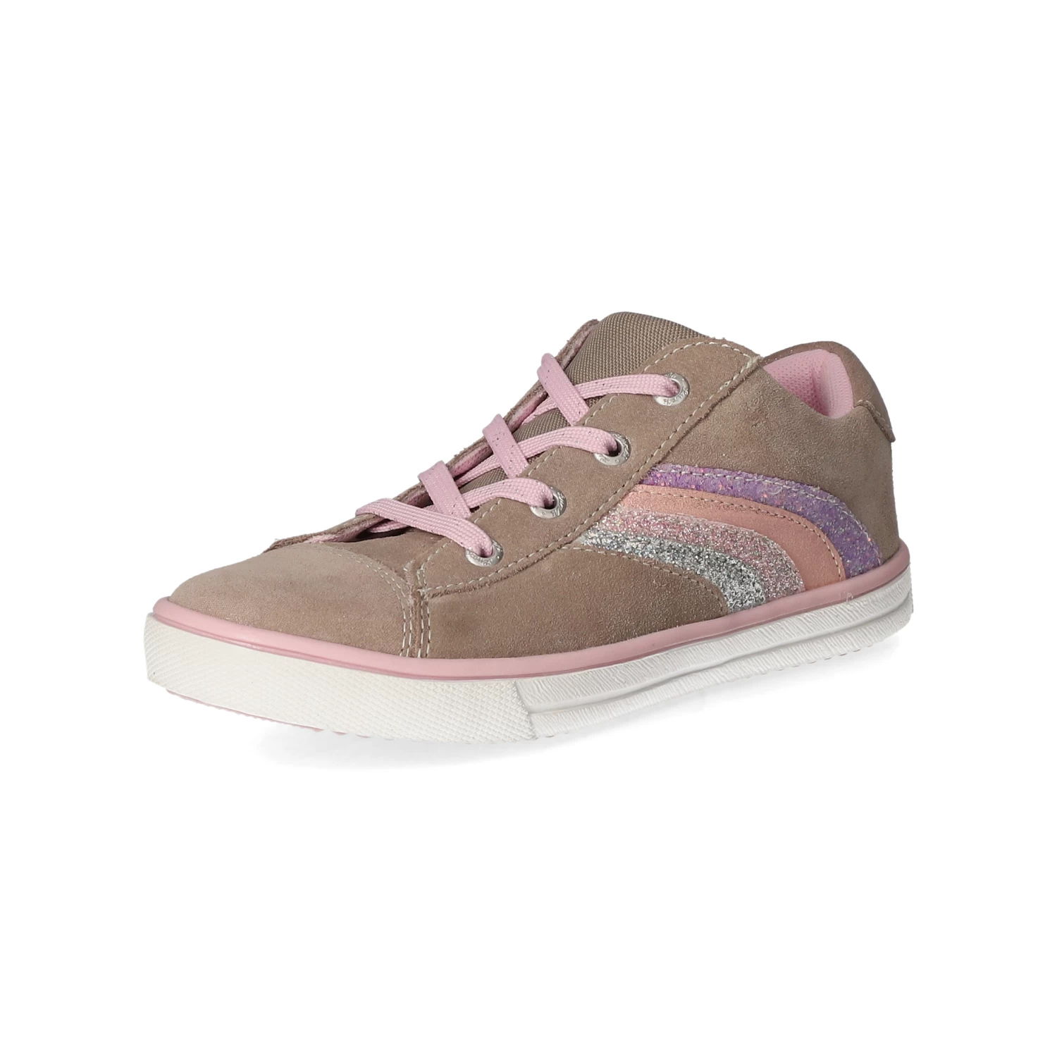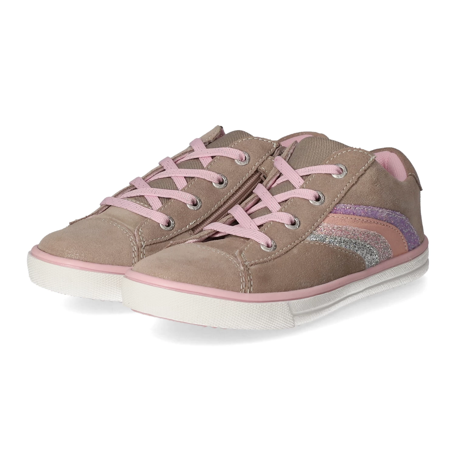 Lurchi Mädchen Low Sneaker SANITA Taupe Rauleder – sportliches Design – glitzernde Zierstreifen – SchnĂĽrung und ReiĂźverschluss – rosa Highlights – verstärkter Zehen- und Fersenbereich – gepolsterter Einstieg – leichtes Textilfutter – herausnehmbare Decksohle – flexible, rutschhemmende Profilsohle