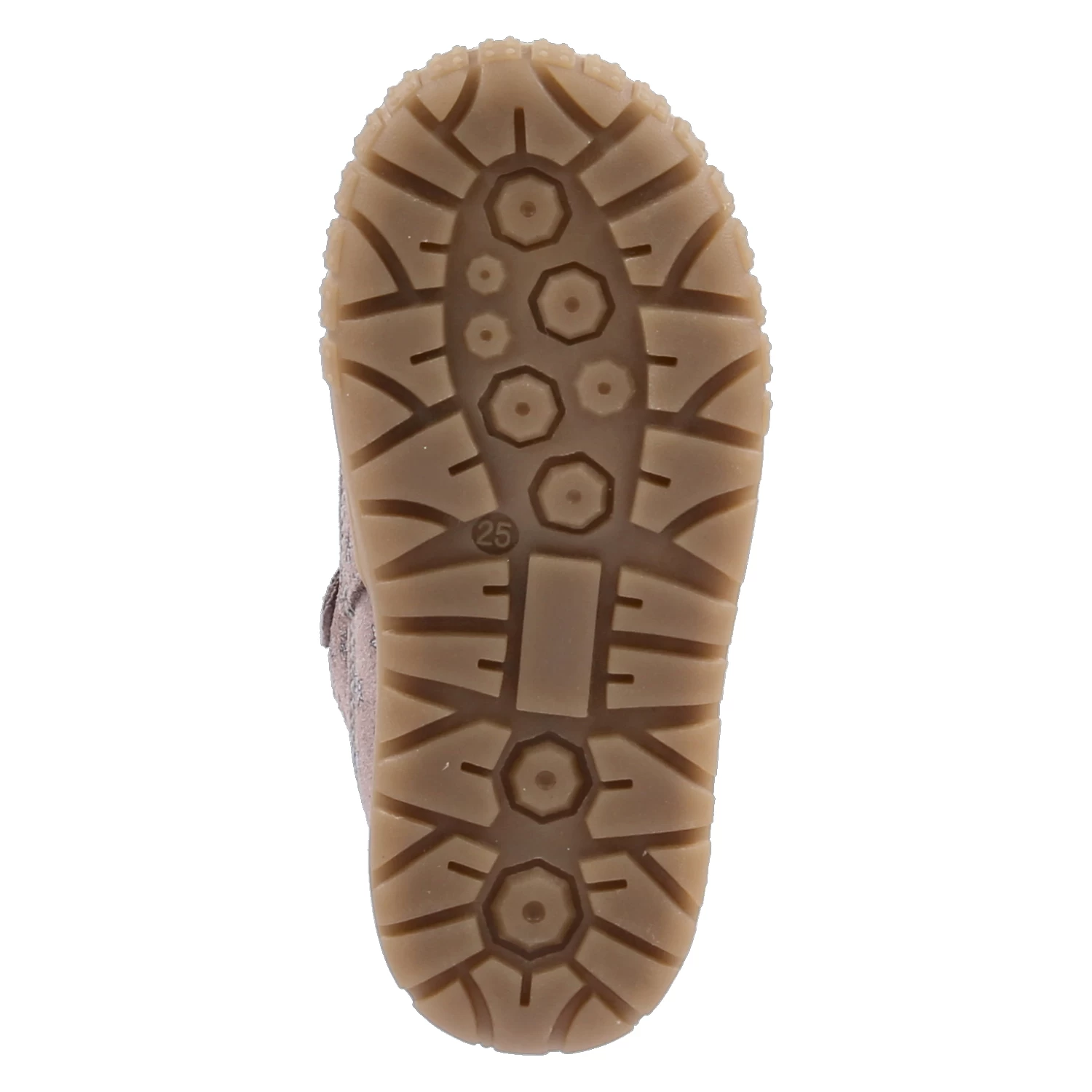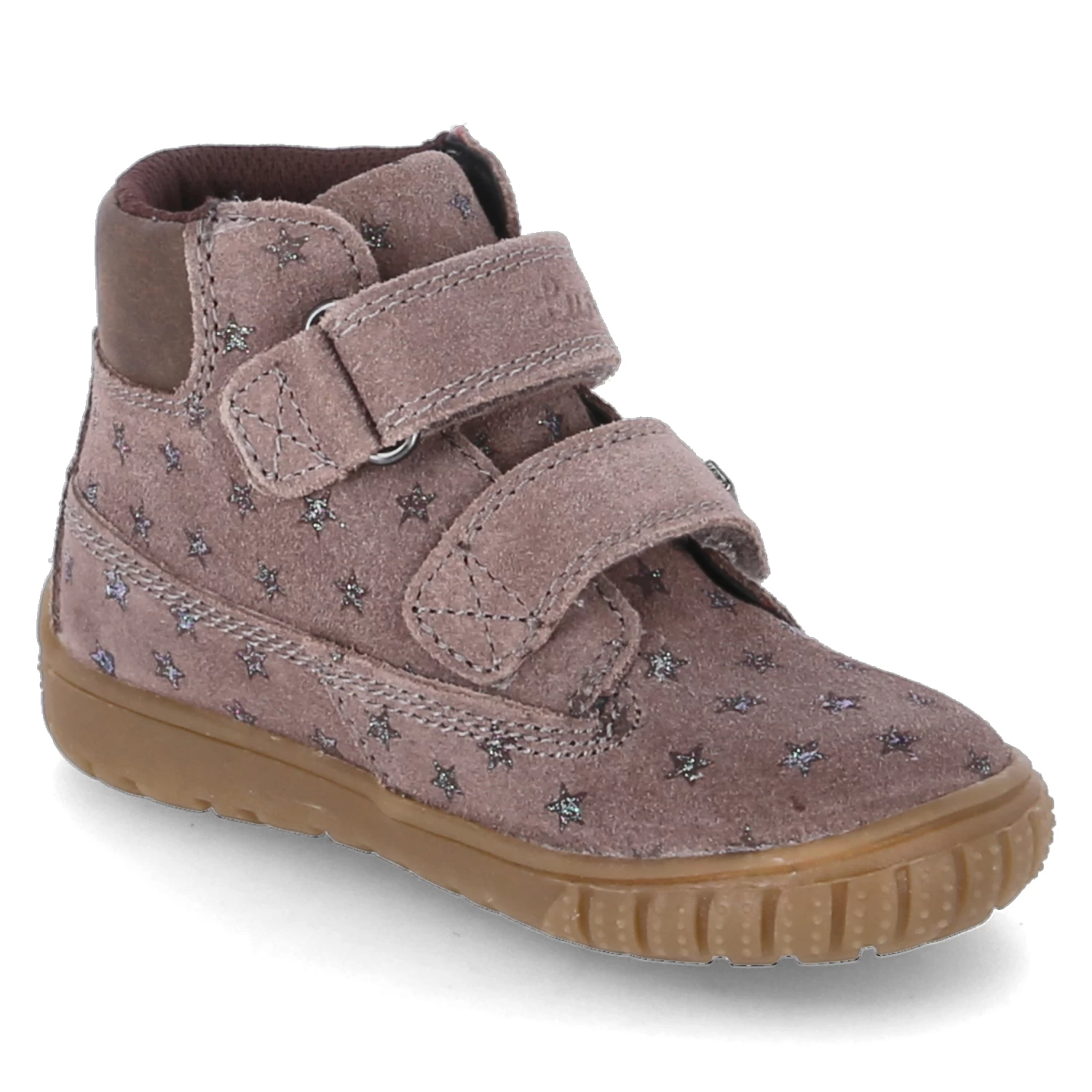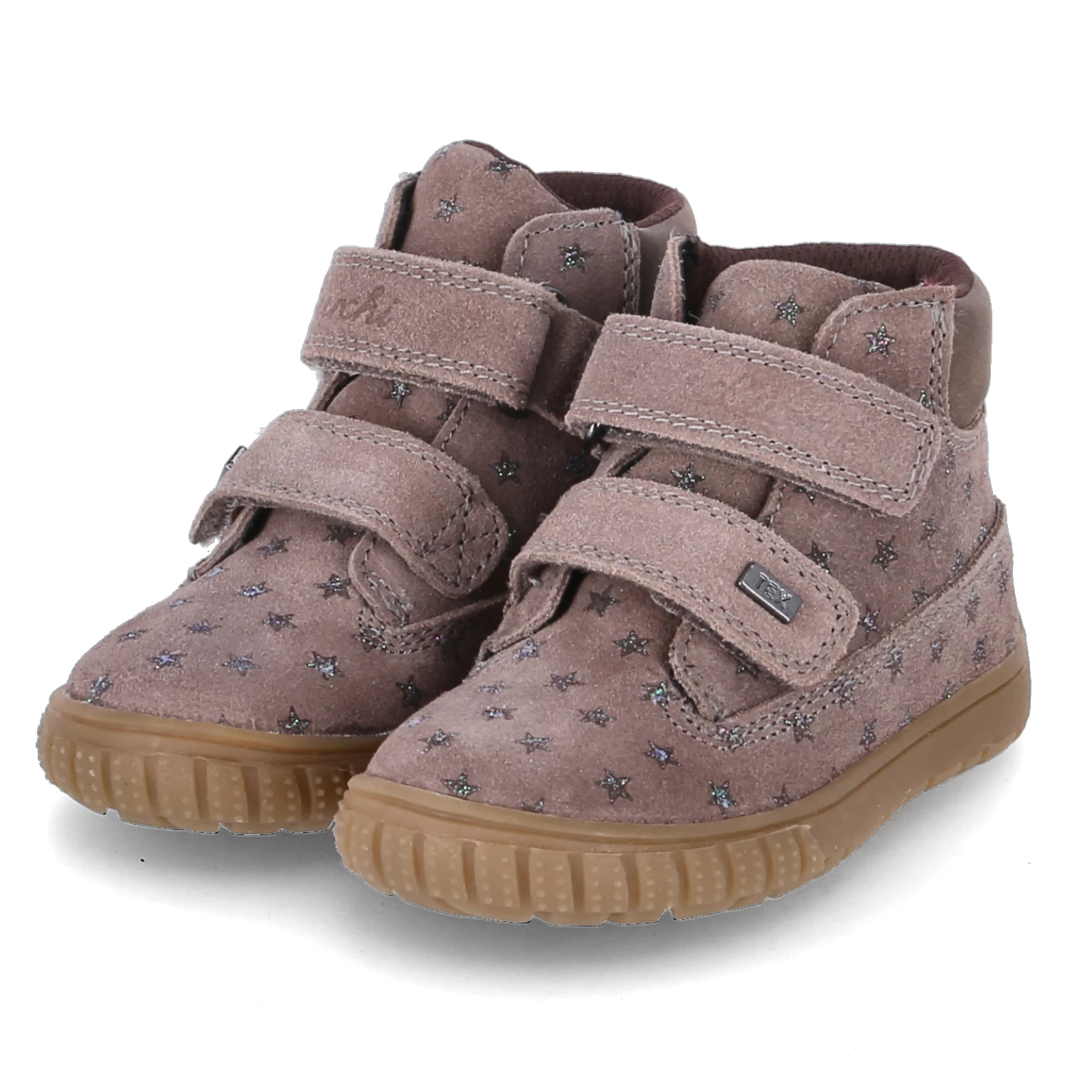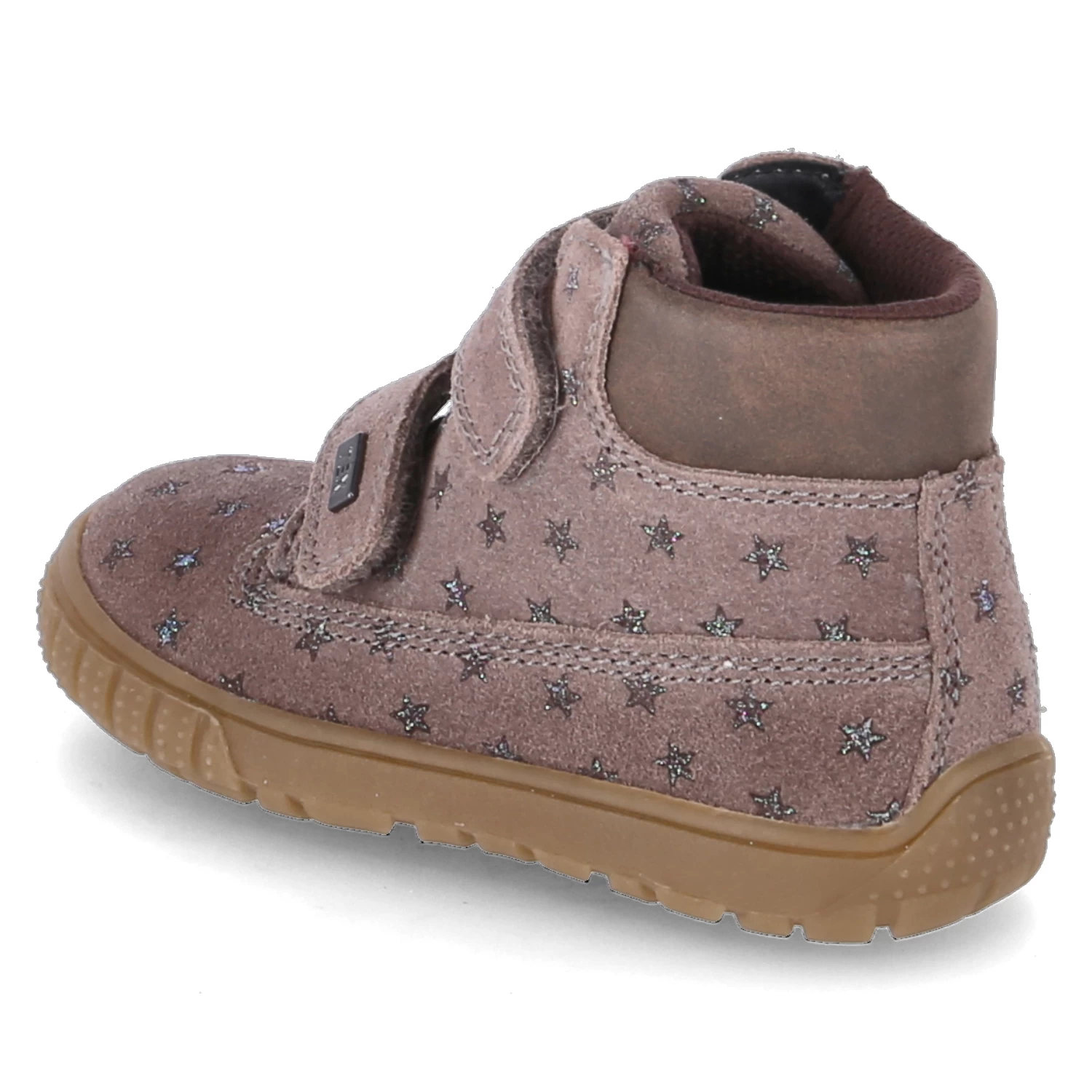 Lurchi Mädchen Klettschuhe/ Stiefeletten/ Lauflernschuhe JULIANO-TEX Braun Rauleder-Synthetik-Mix – TexMembran (wasserdicht, atmungsaktiv) – zwei Klettriemen – all over Glitzerstern-Print – gepolsterter Einstieg – seitliche Zierstreifen und -nähte – verstärkter Zehen- und Fersenbereich – flexible, rutschhemmende Laufsohle