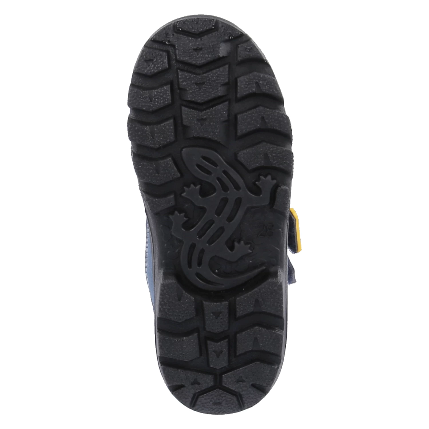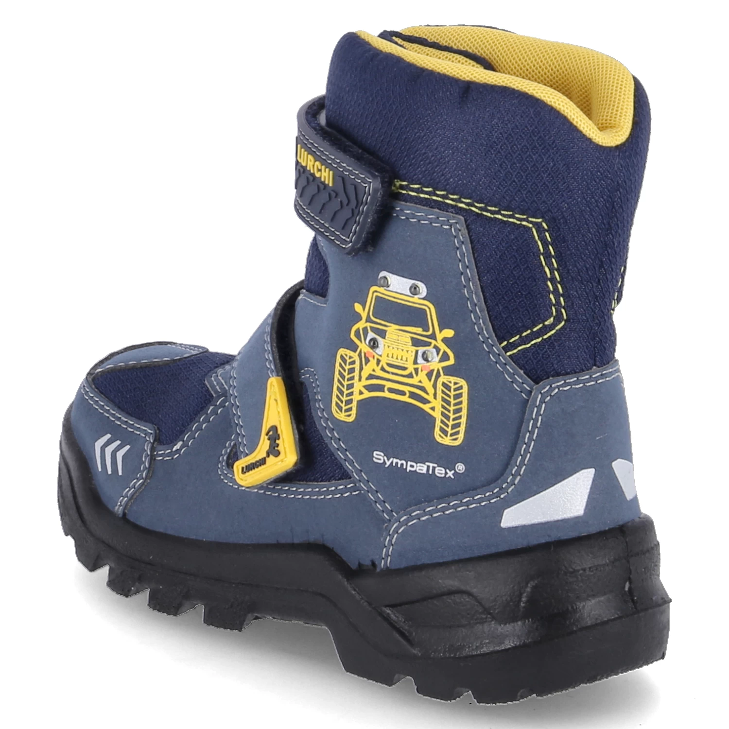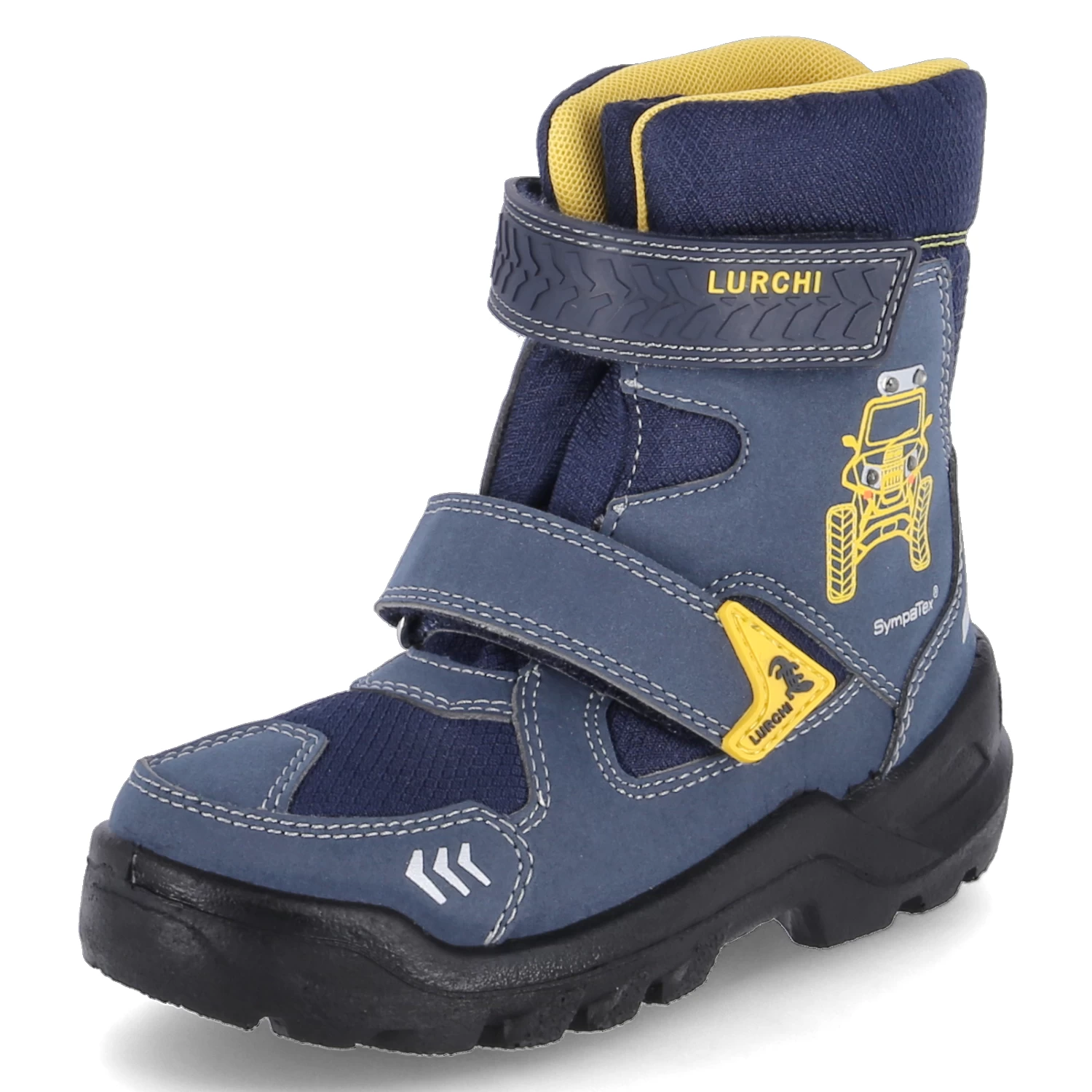 Lurchi Kinder Winterstiefel KAZIM Blau Textil-Synthetik-Mix – Klettverschluss – wasserfest, atmungsaktiv (Sympatex) – verstärkter Fersen- und Zehenbereich – Truck-Print mit vier blinkenden LEDs (nicht schaltbar) – gepolsterter Schaft – flexible Profillaufsohle – warmes Teddyfutter – WechselfuĂźbett