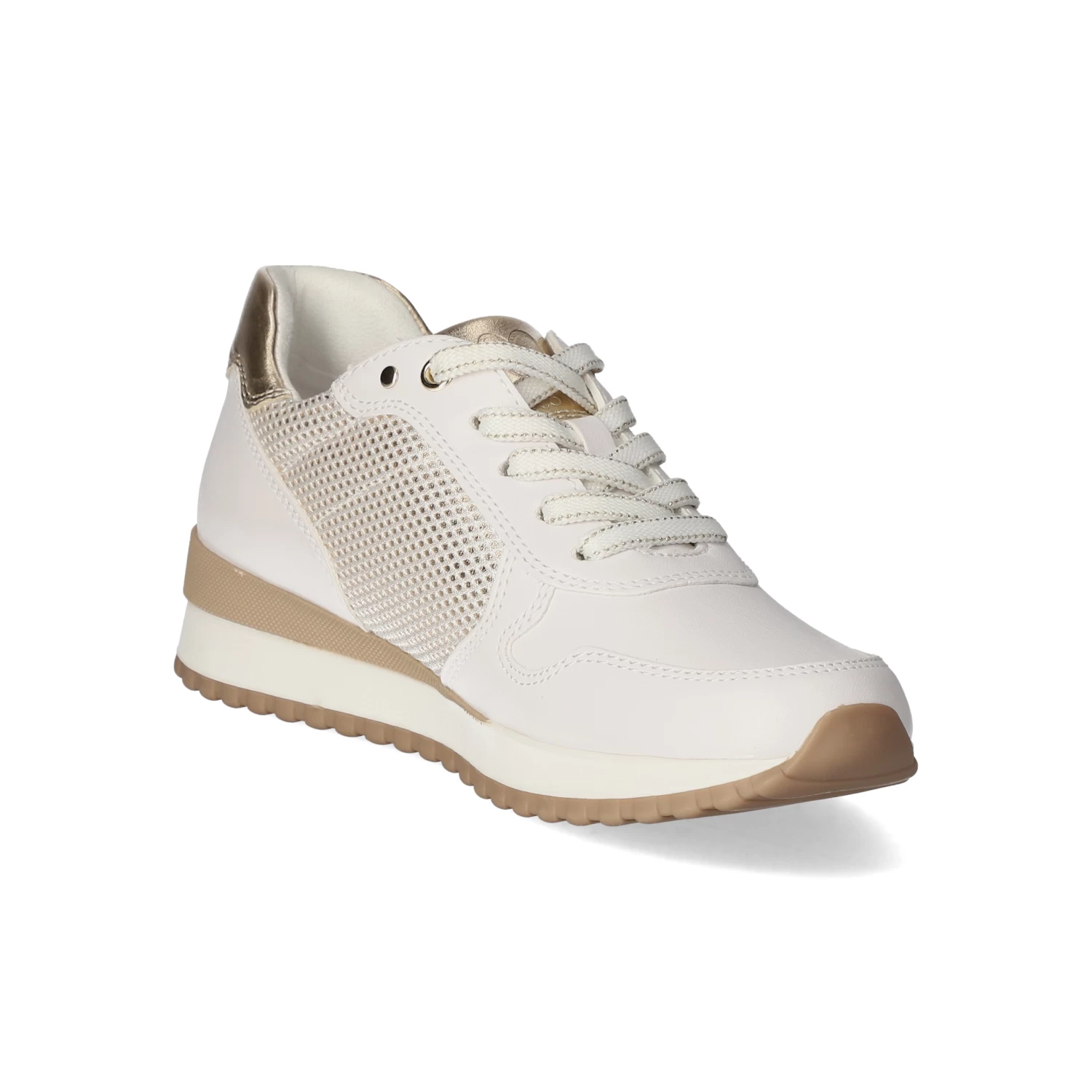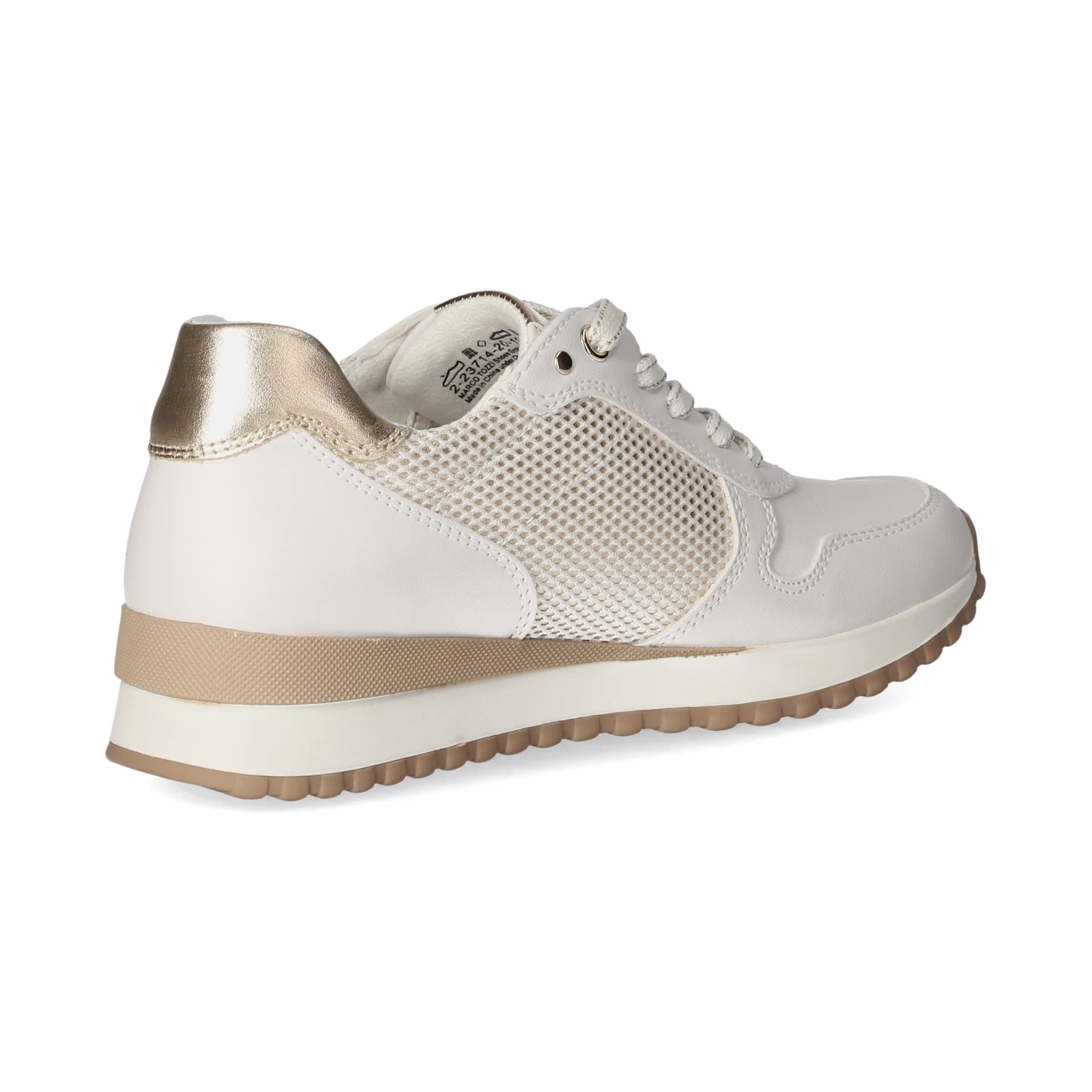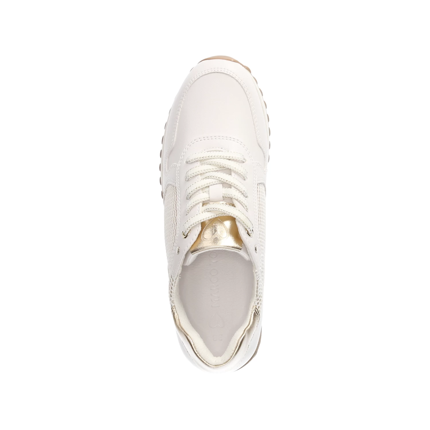 Marco Tozzi Damen Low Sneaker Weiß Textil-Synthetik-Mix – sportliches Design – goldglänzende Details – Teile in Netzoptik – Schnürung – verstärkter Zehen- und Fersenbereich – gepolsterter Einstieg – leichtes Textilfutter – gepolsterte Wechseldecksohle – flexible, rutschhemmende Profilsohle