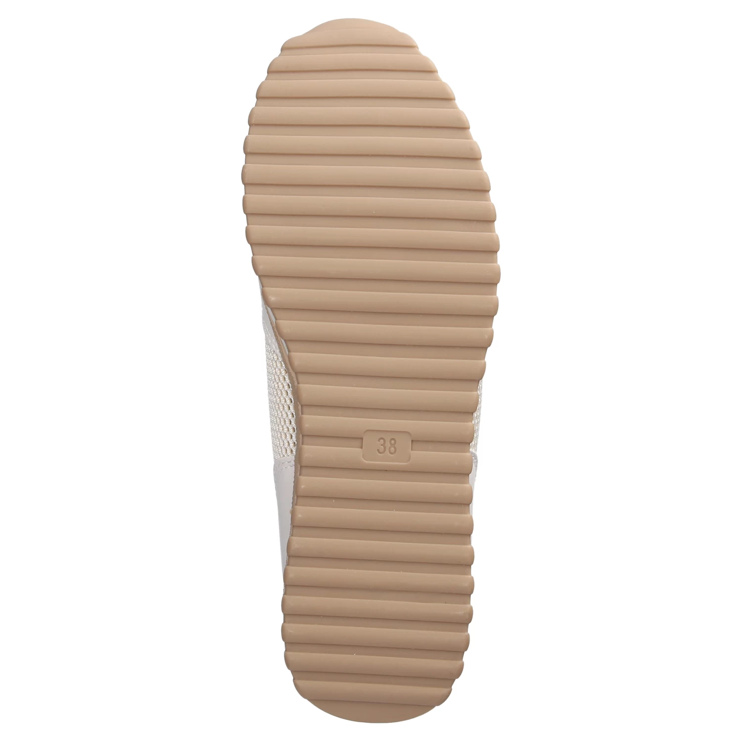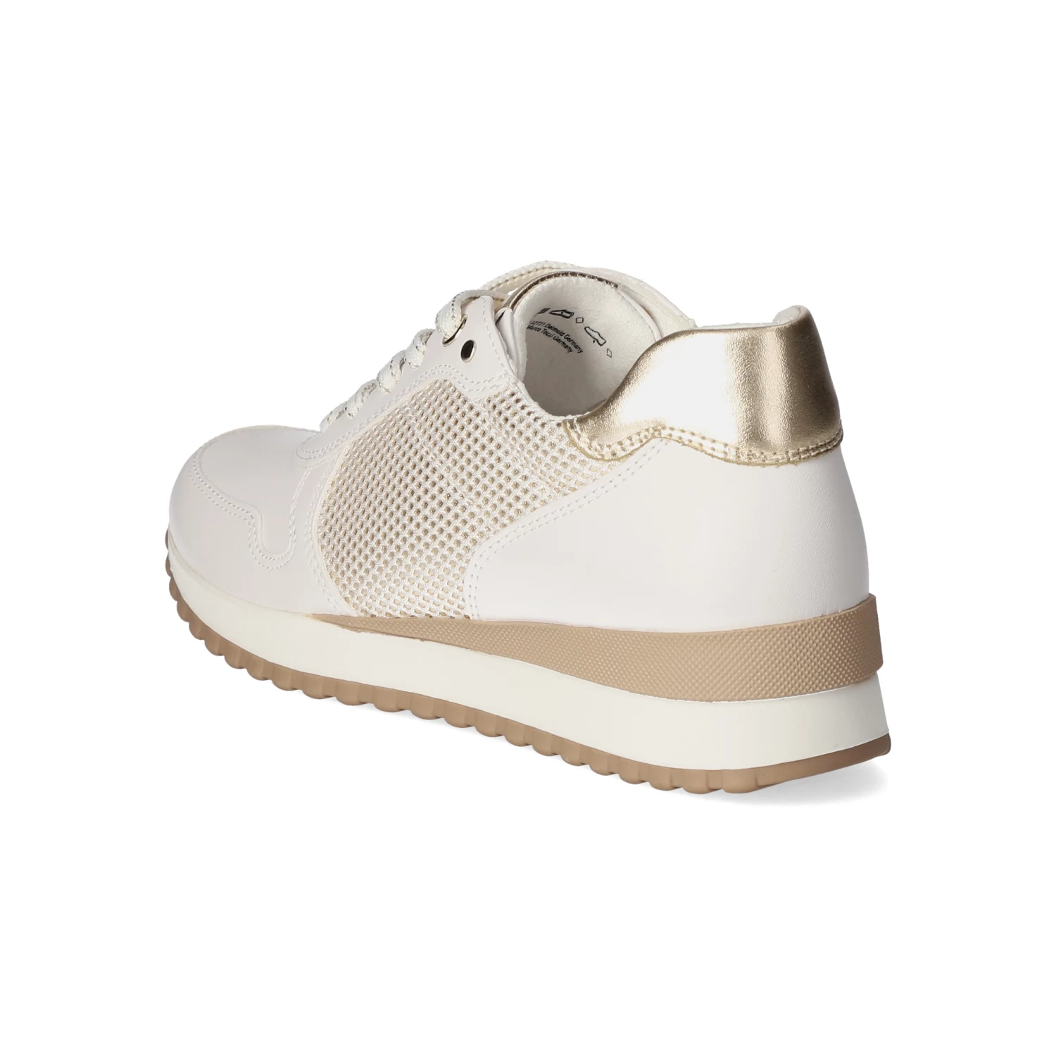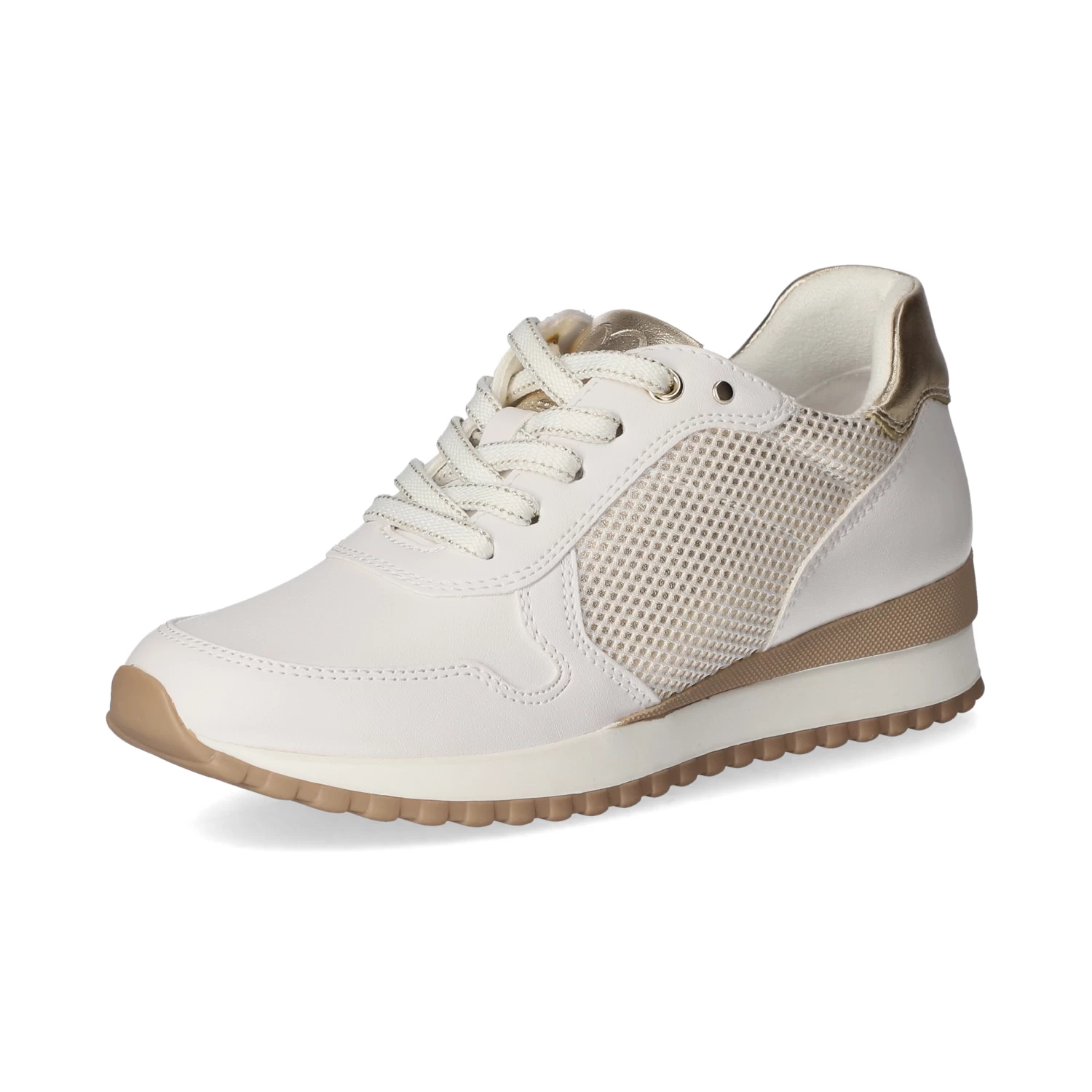 Marco Tozzi Damen Low Sneaker Weiß Textil-Synthetik-Mix – sportliches Design – goldglänzende Details – Teile in Netzoptik – Schnürung – verstärkter Zehen- und Fersenbereich – gepolsterter Einstieg – leichtes Textilfutter – gepolsterte Wechseldecksohle – flexible, rutschhemmende Profilsohle