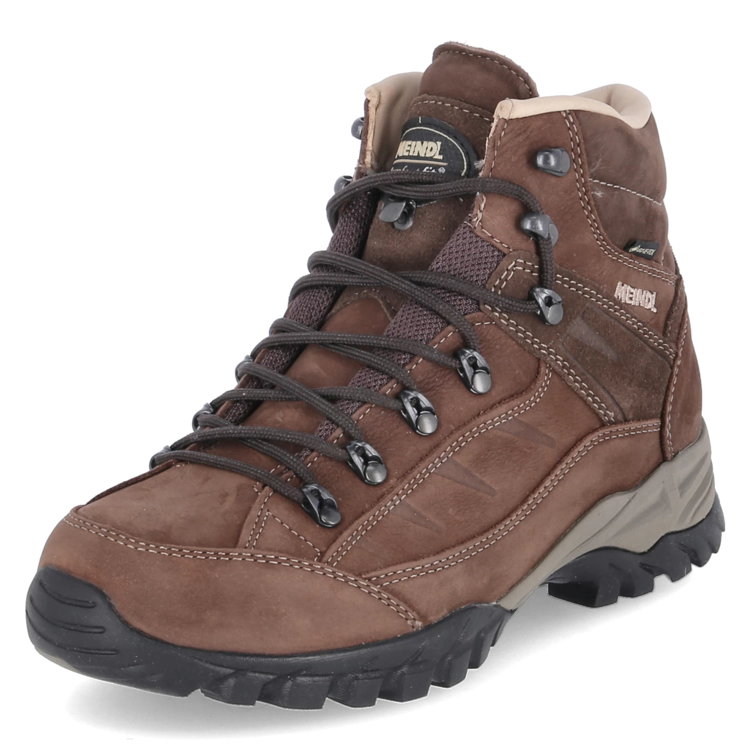 Meindl Damen Outdoorschuhe/ Trekkingschuhe TOBLACH LADY Braun Rauleder – SchnĂĽrung – Ziernähte – gepolsterter Einstieg – WechselfuĂźbett aus Kork mit Fersenpolster und Wollbezug – Fellfutter – verstärkter FuĂźrahmen – rutschhemmende Profillaufsohle – Anziehlasche – GoreText (wasserfest, winddicht, atmungsaktiv)
