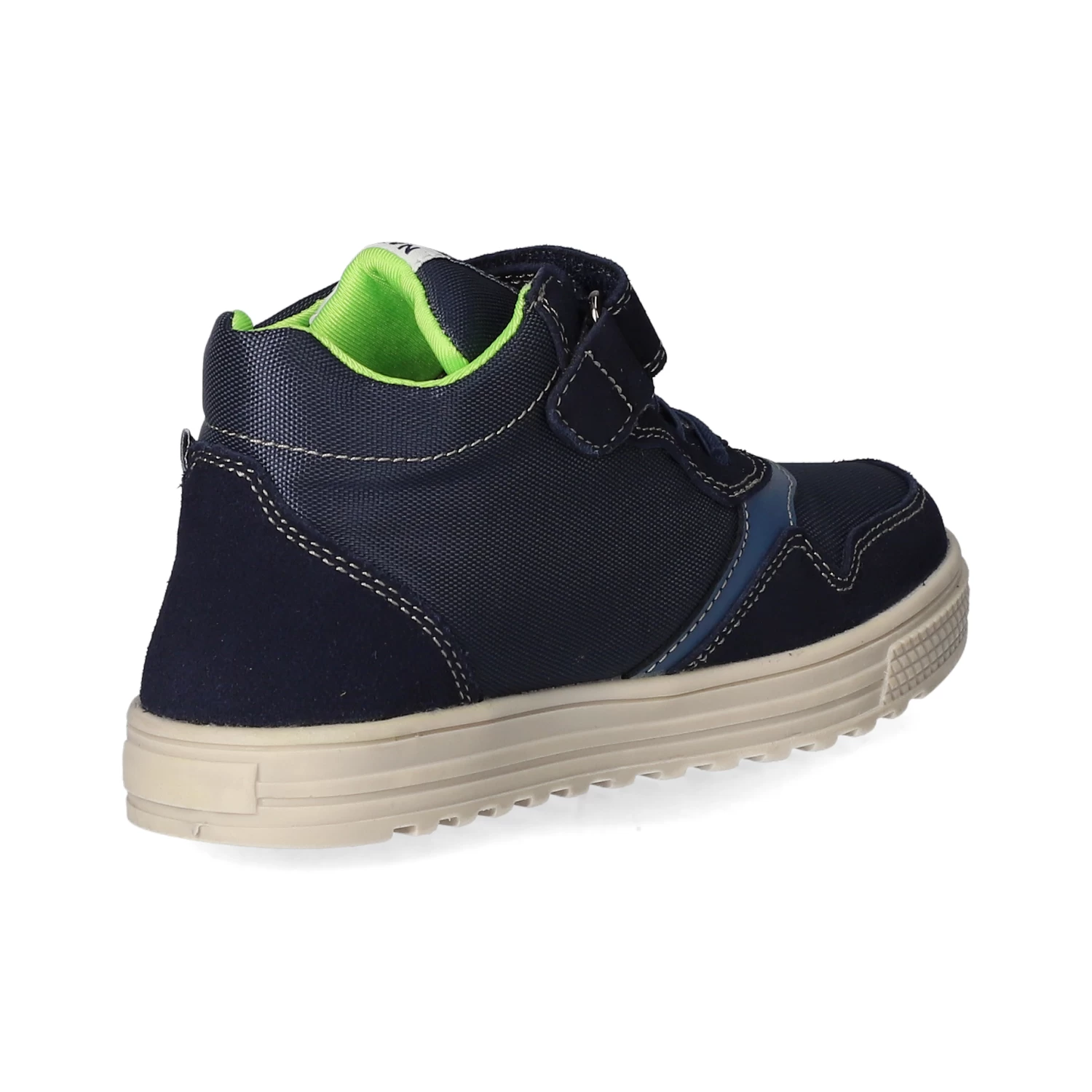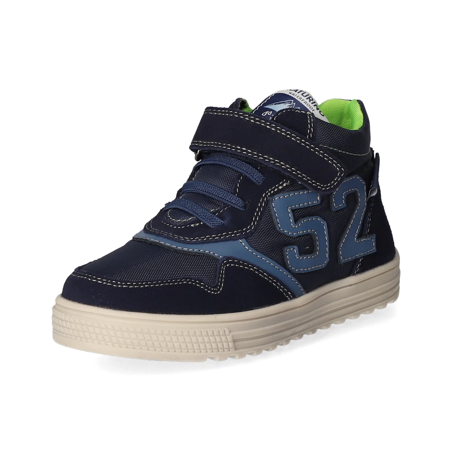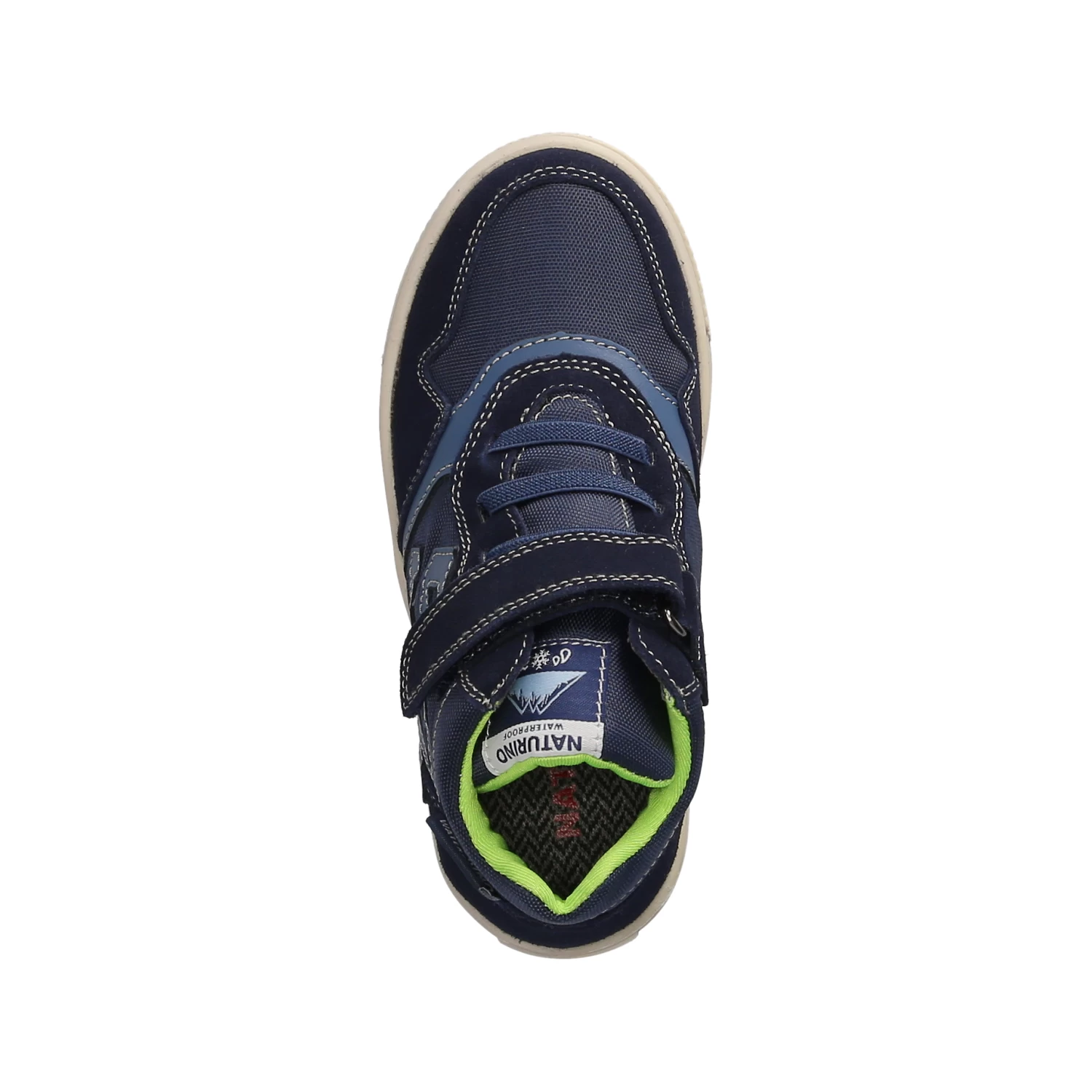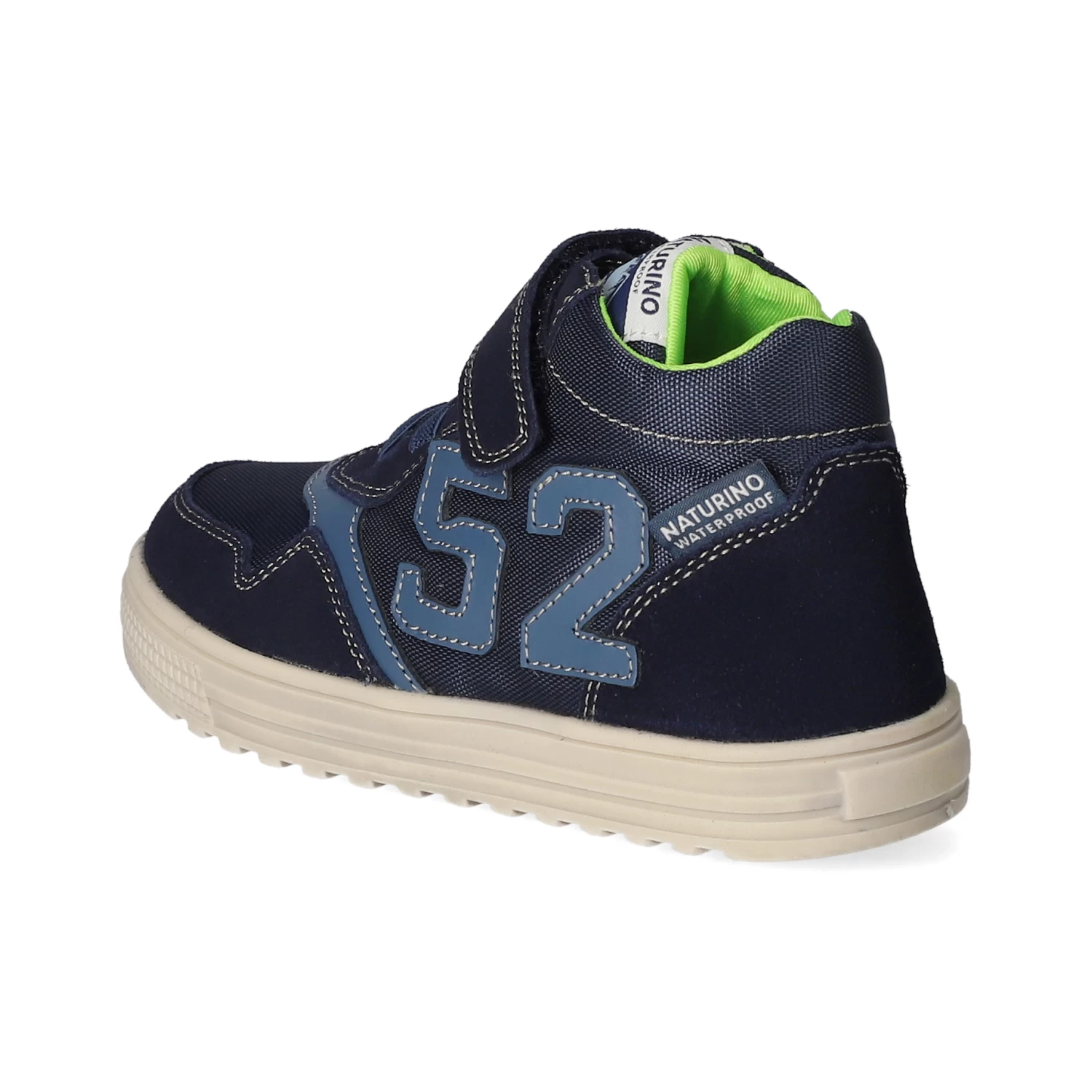 Naturino Jungen High Sneaker/ Klettschuhe YARDE WP Blau Rauleder-Textil-Mix – wasserfest und atmungsaktiv – ein Klettverschluss und ein Elastikband ĂĽber dem Spann – hellblaue Highlights – sportliche Zierstreifen – Zahlmotiv – verstärkter Zehen- und Fersenbereich – gelabelt – gepolsterter Einstieg – angenehmes Textilfutter – flexible, rutschhemmende Profilsohle