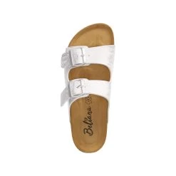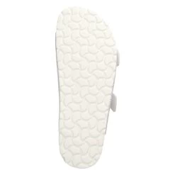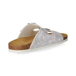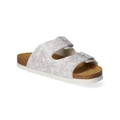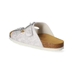 Beliana Damen Pantoletten WeiĂź Synthetik – silberfarbenes florales Design – Riemen mit Schnalle – vorgeformte Lederdecksohle – flexible, rutschhemmende Profilsohle