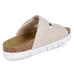 Beliana Damen Pantoletten Beige Glattleder – zwei Klettverschlussriemen mit Zierschnalle – vorgeformtes Kork-TieffuĂźbett mit Lederbezug – Profilsohle