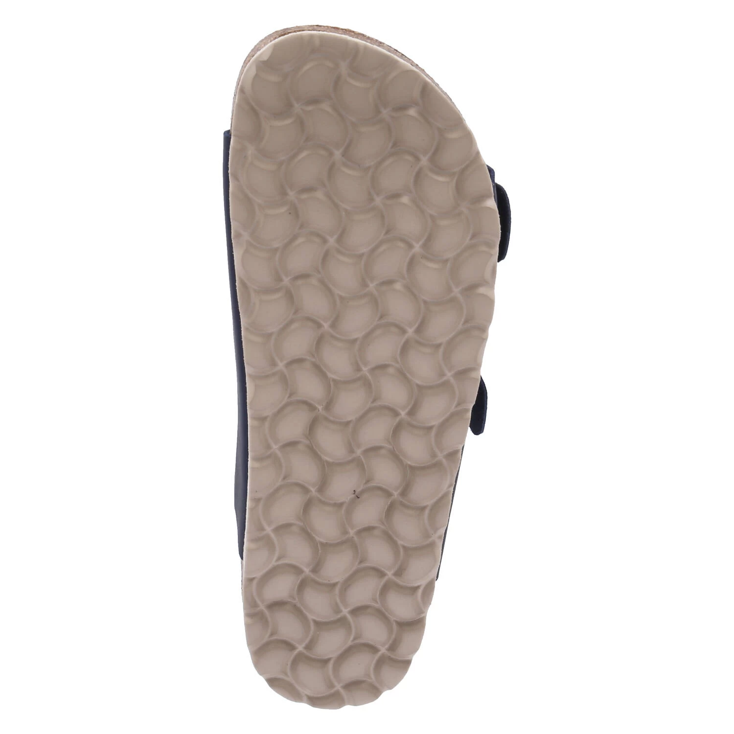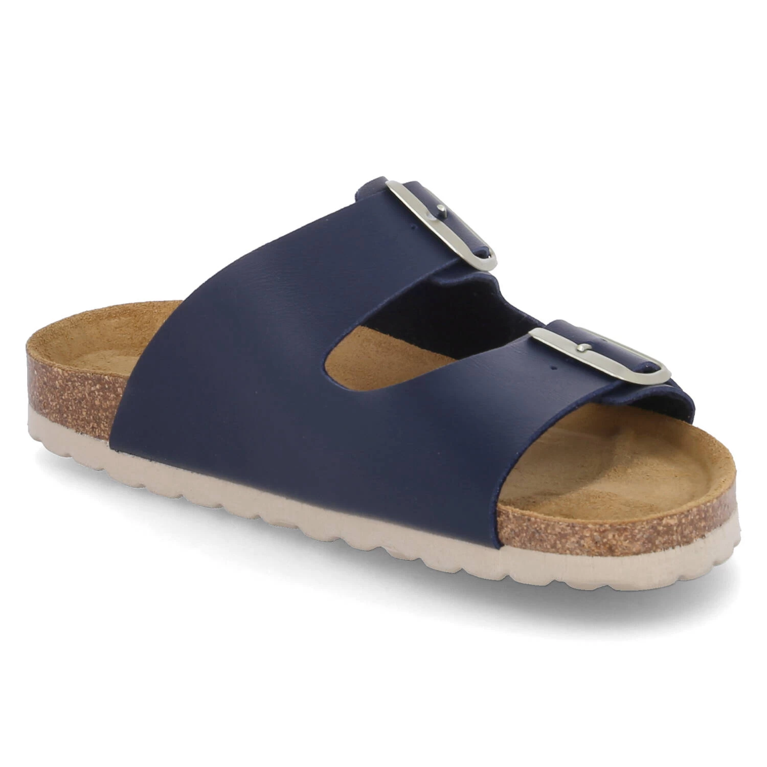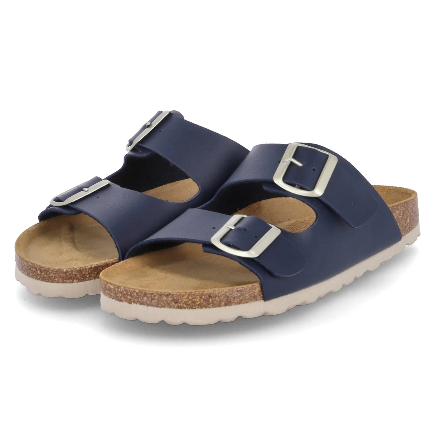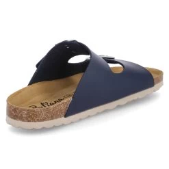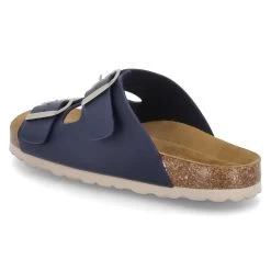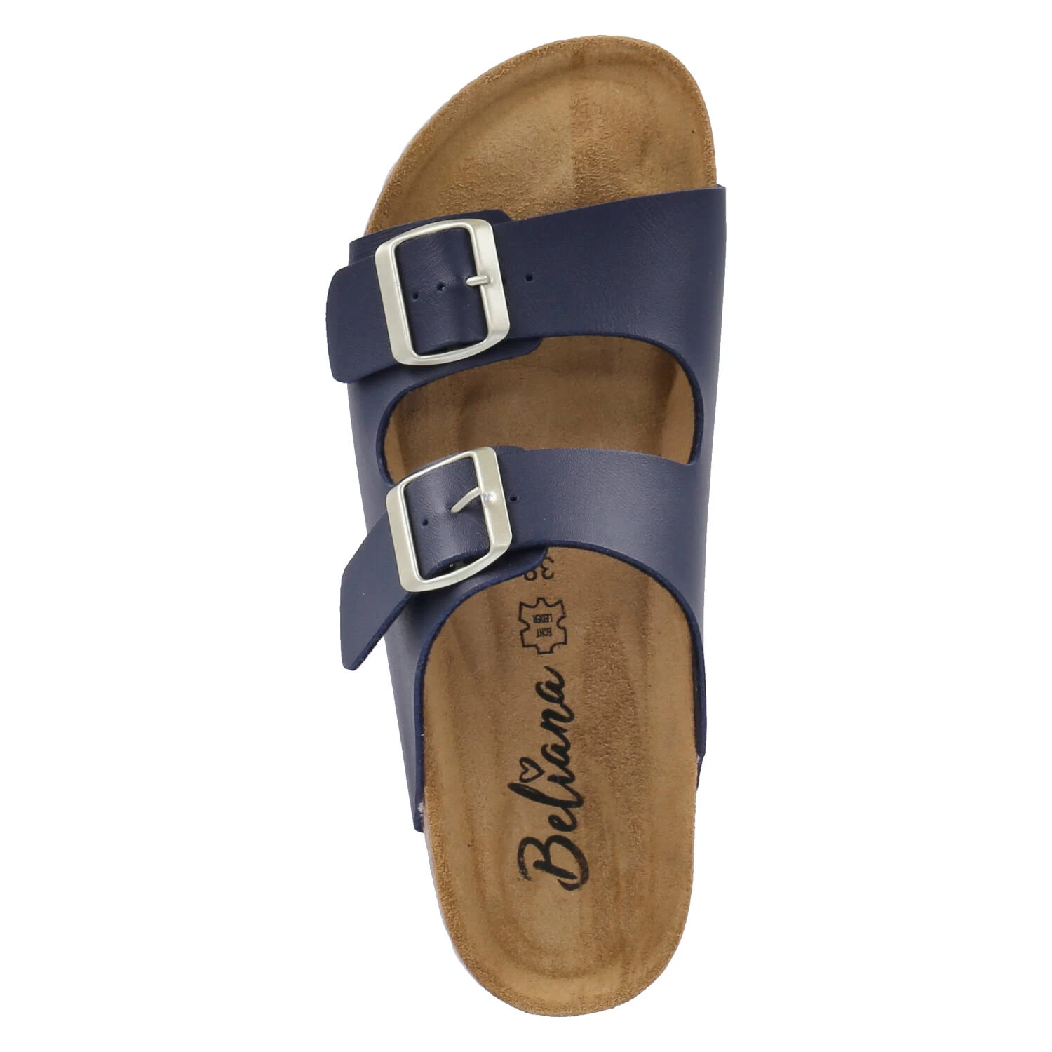 Beliana Damen Pantoletten Blau Kunstleder – zwei Riemen mit Schnalle – vorgeformtes, weiches Kork-TieffuĂźbett mit Lederbezug – EVA-Laufsohle mit leichtem Profil