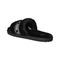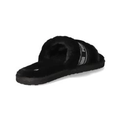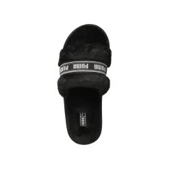 Puma Damen Pantoletten Schwarz Textil – typische Markendetails – moderne PlĂĽschoptik – angenehmes Textilfutter – gepolsterte Decksohle – flexible Laufsohle mit leichtem Profil