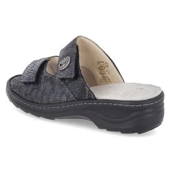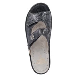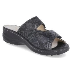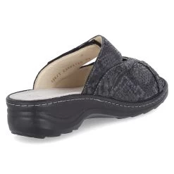 Fidelio Damen Pantoletten HEDI Schwarz Leder – Reptilprägung – zwei Klettriemen- gepolstertes WechselfuĂźbett mit Lederbezug – flexible, rutschhemmende Laufsohle