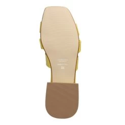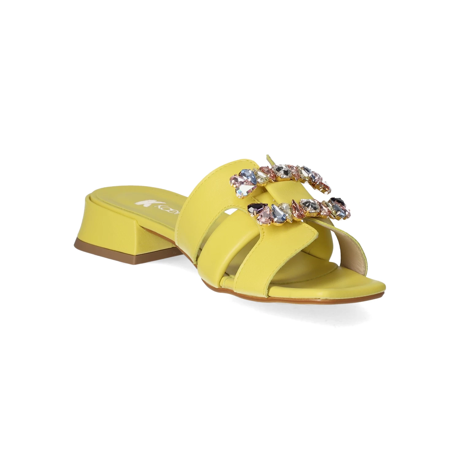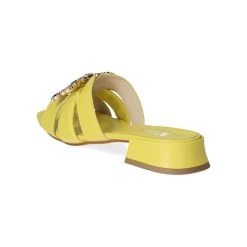 Kaerlek Damen Pantoletten IDRA Gelb Glattleder – zierende Schmucksteine – leicht gepolstertes Decksohle – flexible, rutschhemmende Laufsohle mit leichtem Profil – flacher Blockabsatz