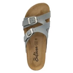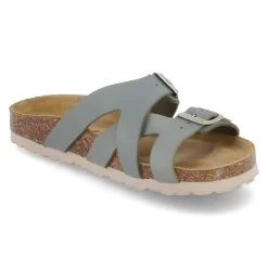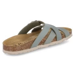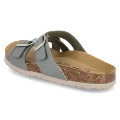 Beliana Damen Pantoletten GrĂĽn Kunstleder – zwei Riemen mit Schnalle – vorgeformtes, weiches Kork-TieffuĂźbett mit Lederbezug – EVA-Laufsohle mit Profil