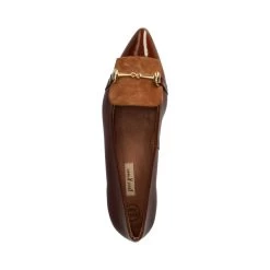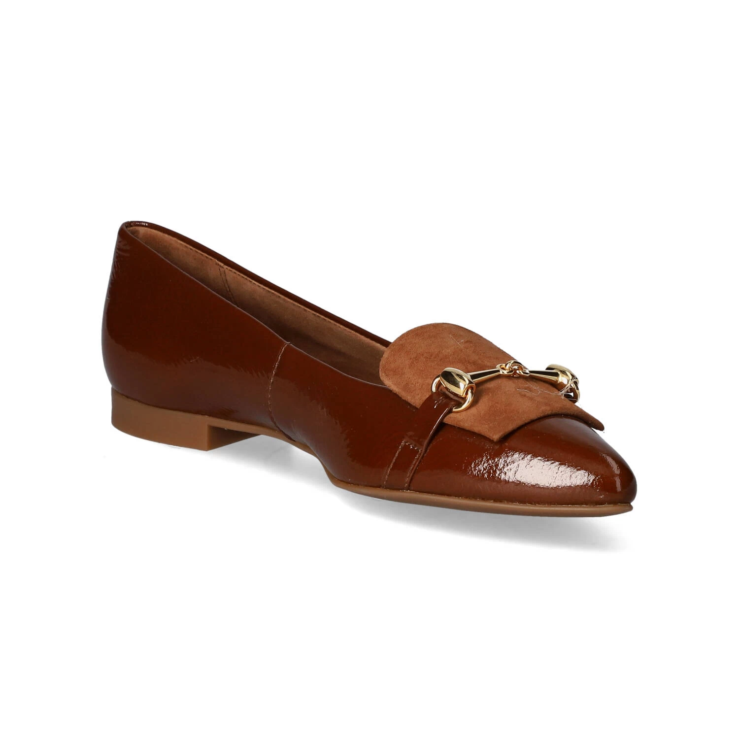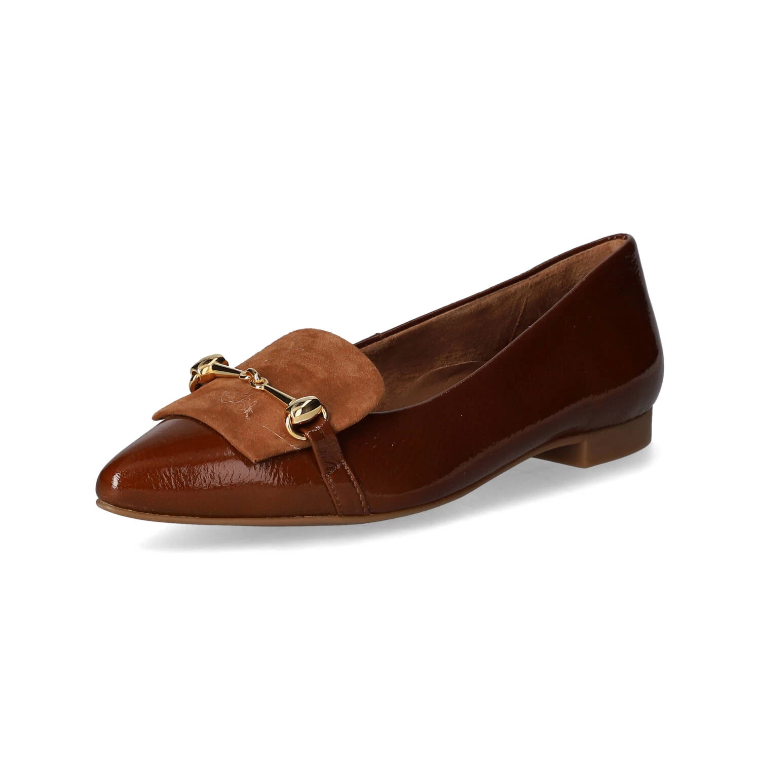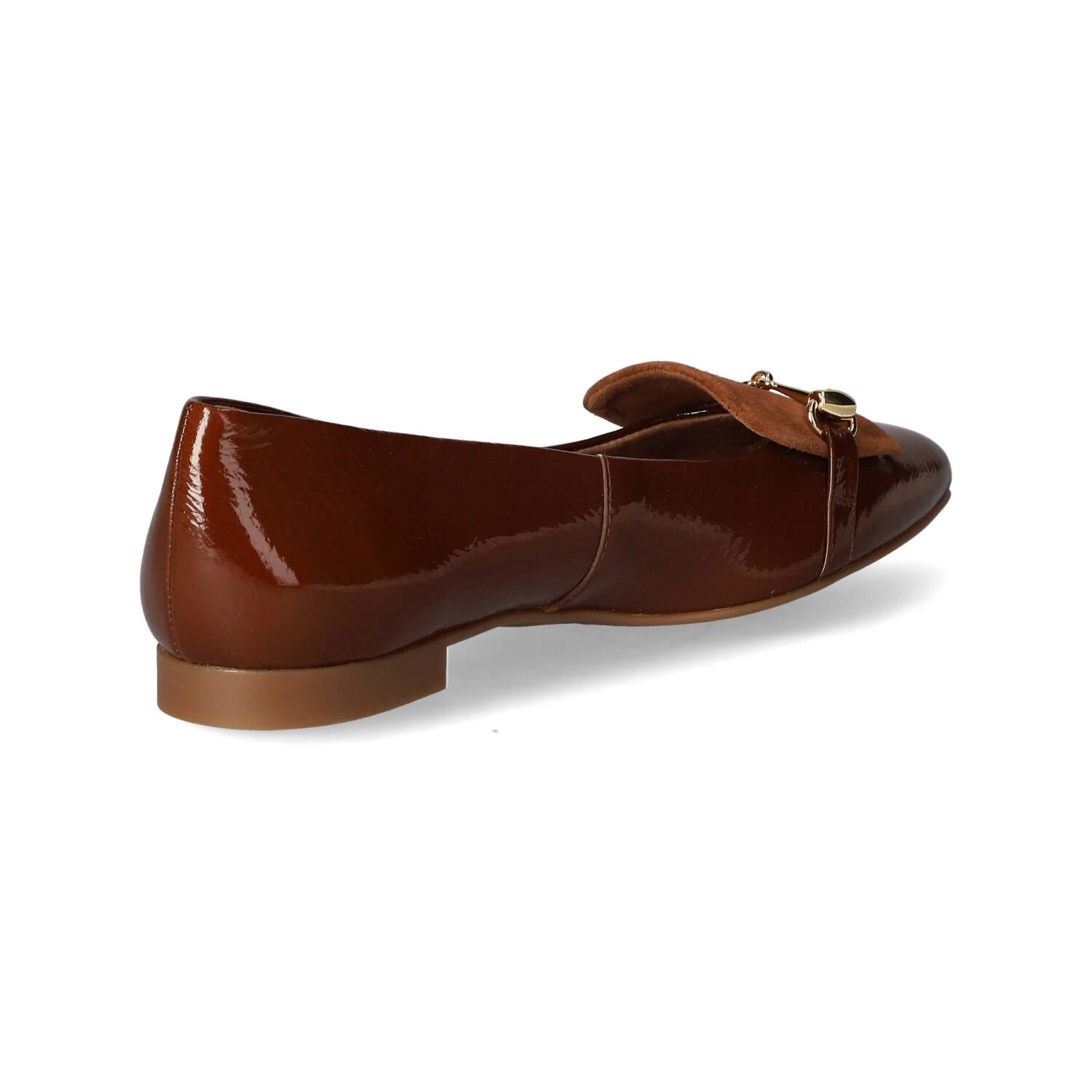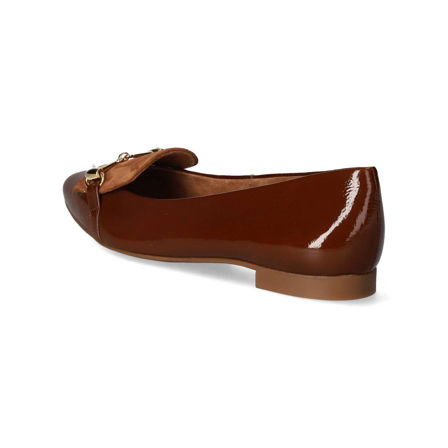 Paul Green Damen Ballerinas Braun Lackleder – elegantes Design – Teile in Rauleder – Zierriemen mit goldenem Metallelement – angenehmes Lederfutter – leicht gepolsterte Lederdecksohle – flexible Laufsohle – Blockbsatz