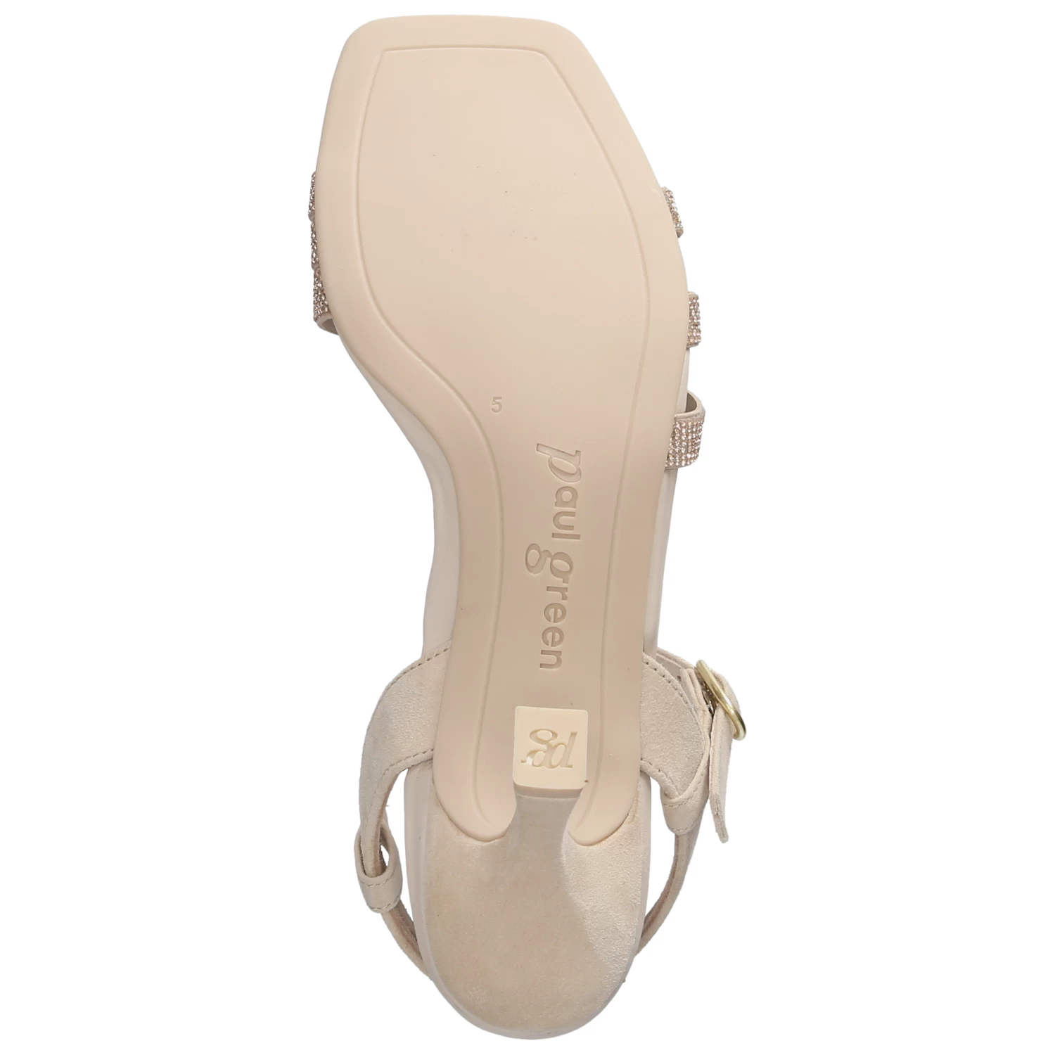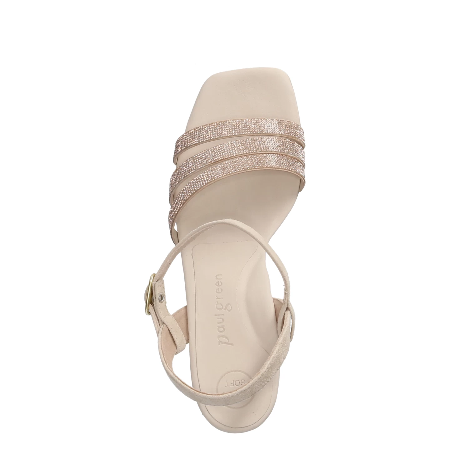 Paul Green Damen Sandaletten/ Riemchensandaletten Beige/Rose Leder-Textil-Mix – glitzernde Schmucksteine – Knöchelriemen mit Druckknopf und verstellbarer Schnalle – gepolsterte Lederdecksohle – flexible, rutschhemmende Laufsohle mit leichtem Profil – eleganter Sand-Uhr-Absatz