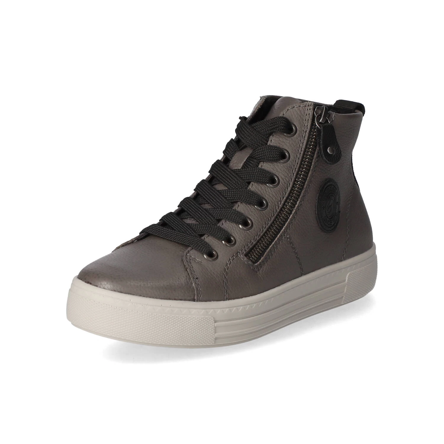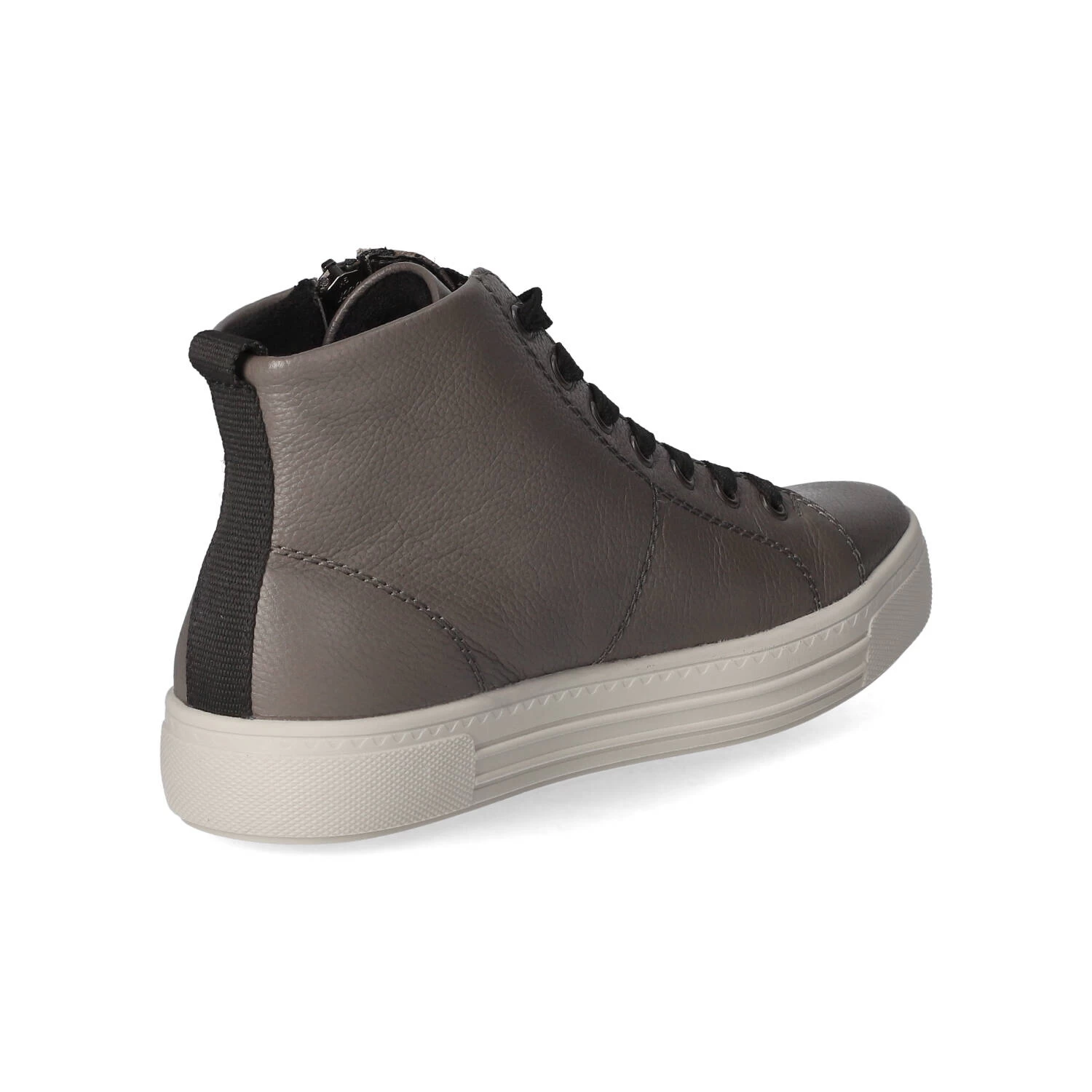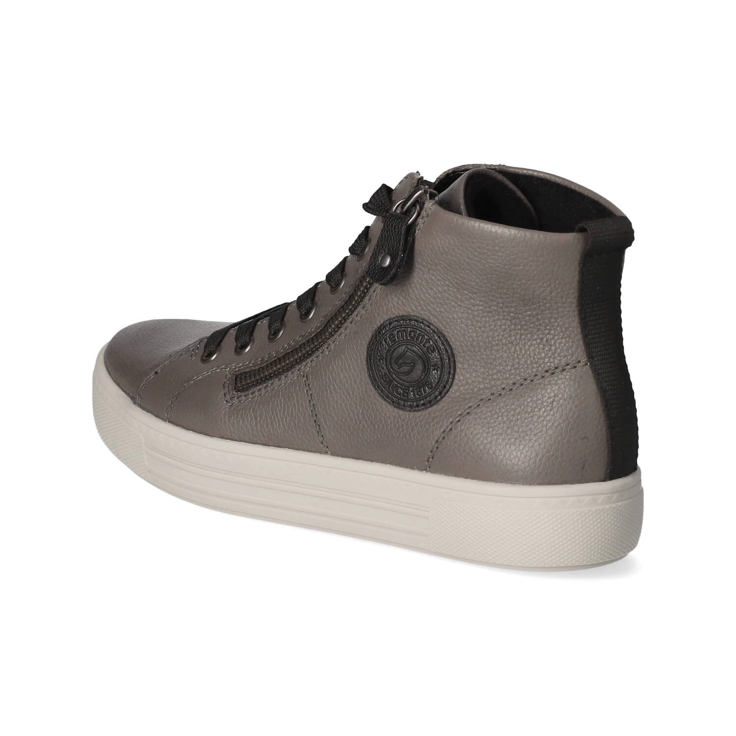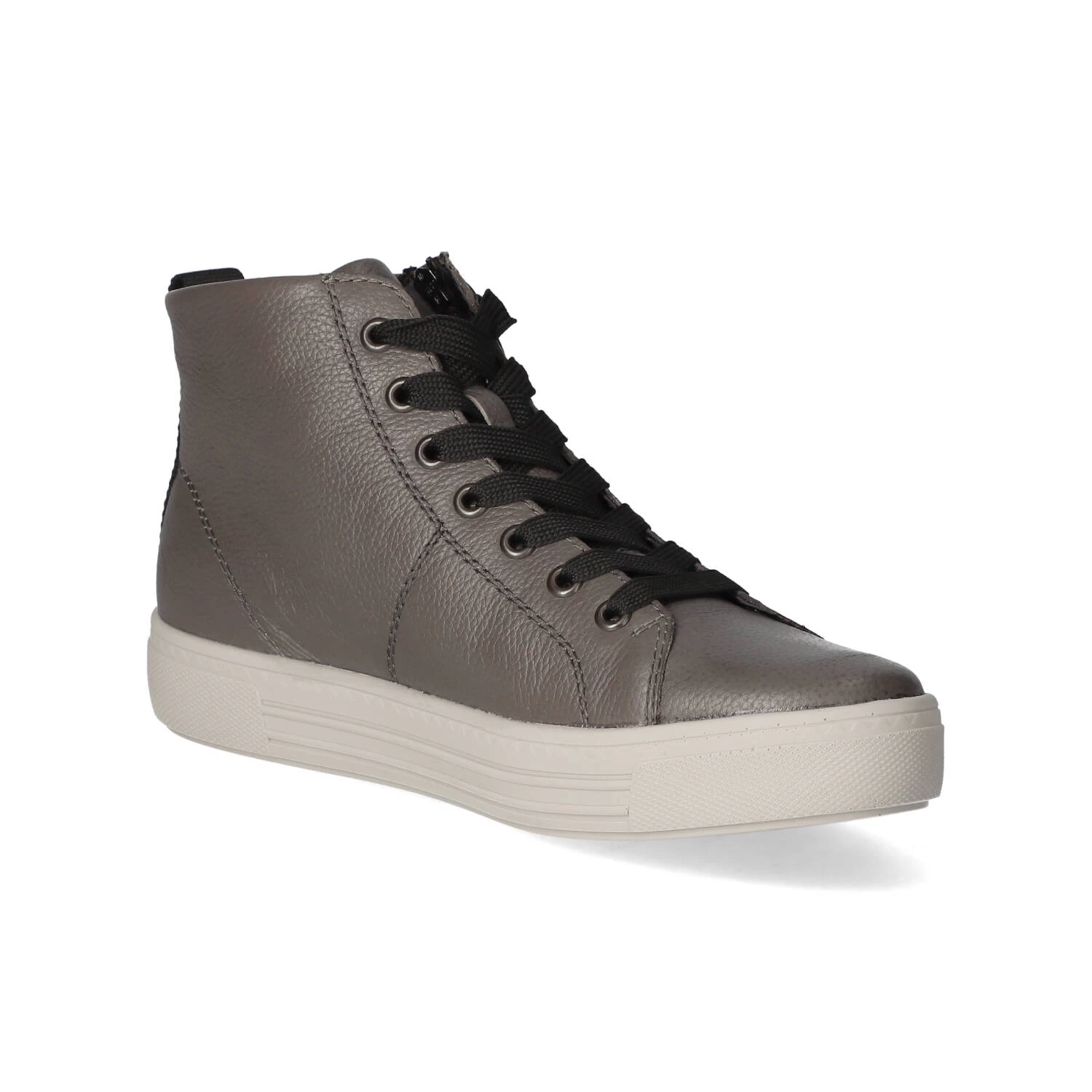 Remonte Damen High Sneaker Grau Glattleder – sportliches Design – typische Markendetails – SchnĂĽrung und ReiĂźverschluss – verstärkter Fersenbereich – leichtes Textilfutter – gepolsterte Wechseldecksohle – flexible, rutschhemmende Laufsohle mit leichtem Profil
