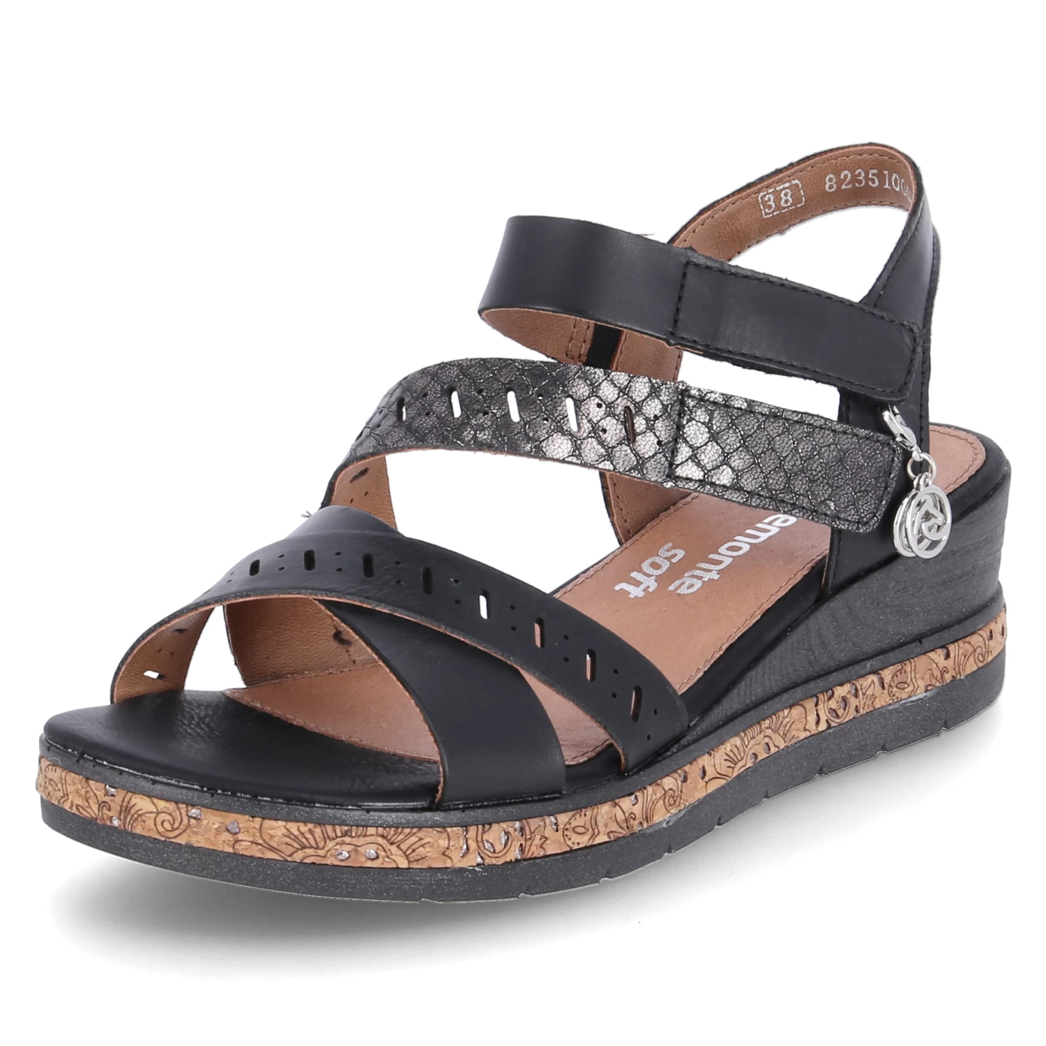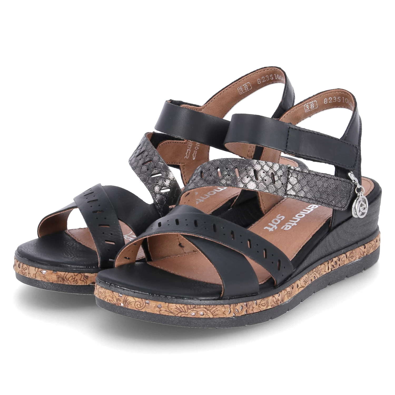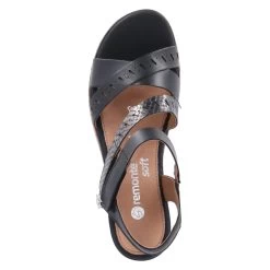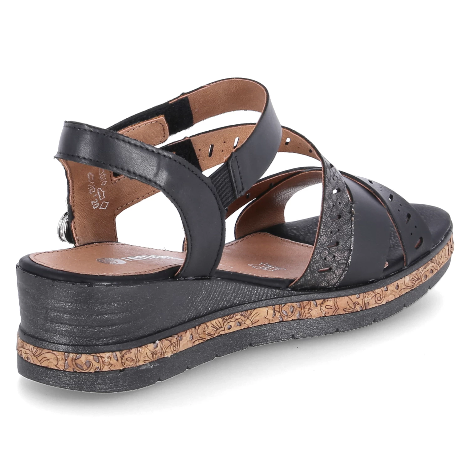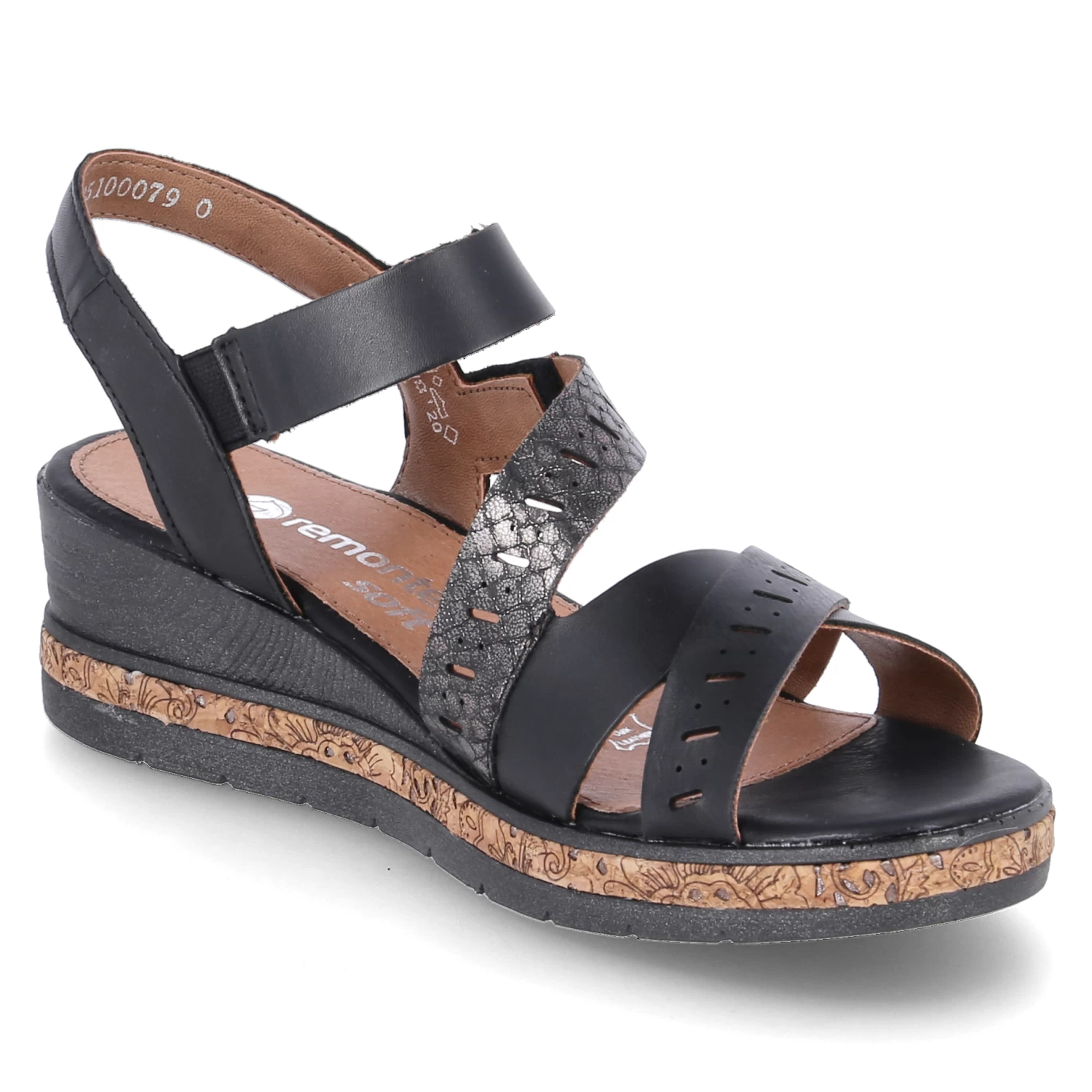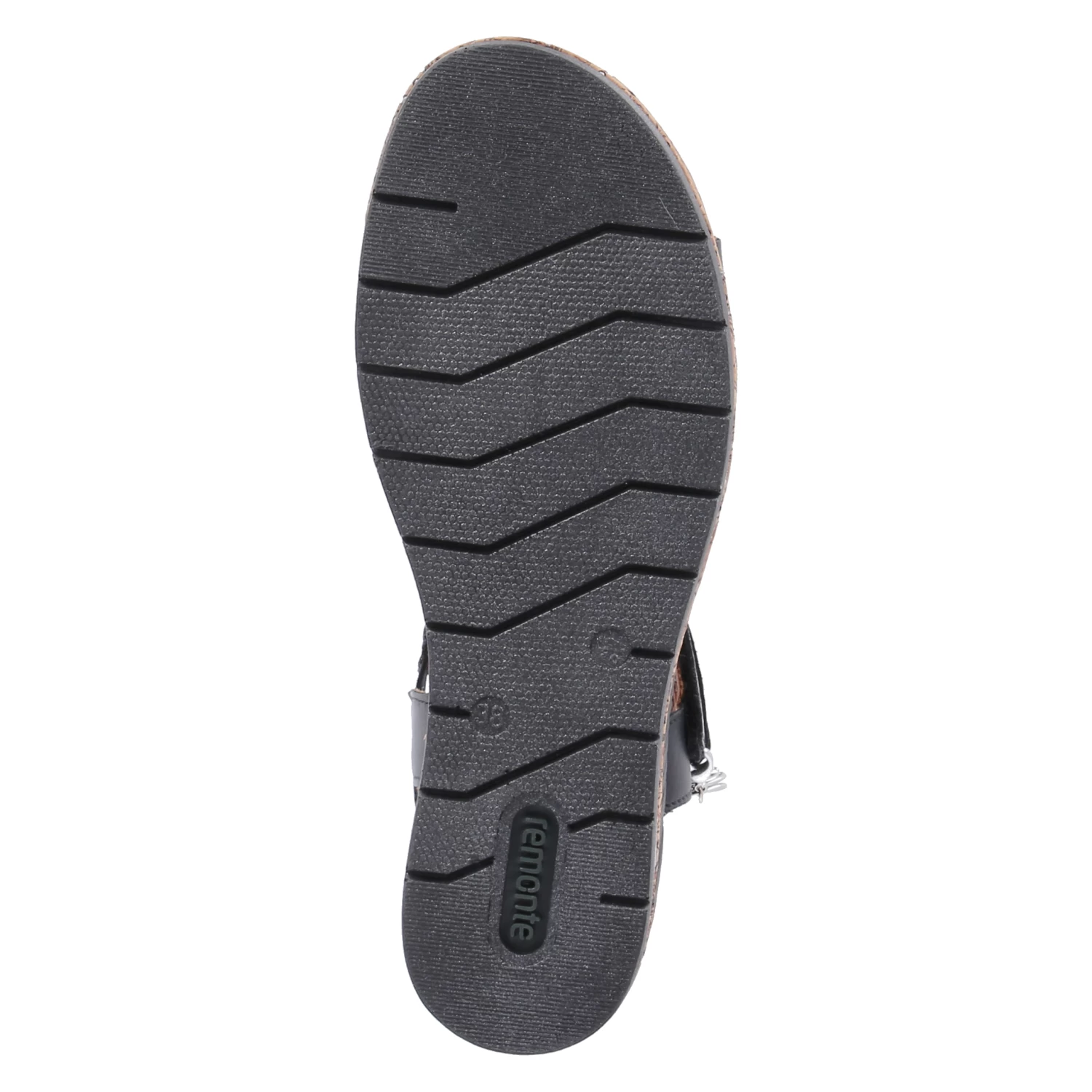 Remonte Damen Sandalen/ Keilsandaletten Schwarz Leder-Synthetik-Mix – 2 praktische Klettverschlüsse – Riemen über dem Spann in Bronze mit Reptilmuster – gepolsterte Decksohle – Sohlenkeil in Holzoptik