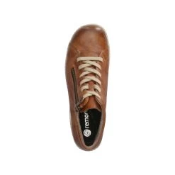 Remonte Damen Low Sneaker Braun Glattleder – wasserfest und atmungsaktiv (remonteTEX) – sportliches Design – moderner Used-Look – typische Markendetails – SchnĂĽrung und ReiĂźverschluss – verstärkter Zehen- und Fersenbereich – dezent gepolsterter Einstieg – weiches Textilfutter – gepolsterte Wechseldecksohle – sehr flexible, rutschhemmende Profilsohle