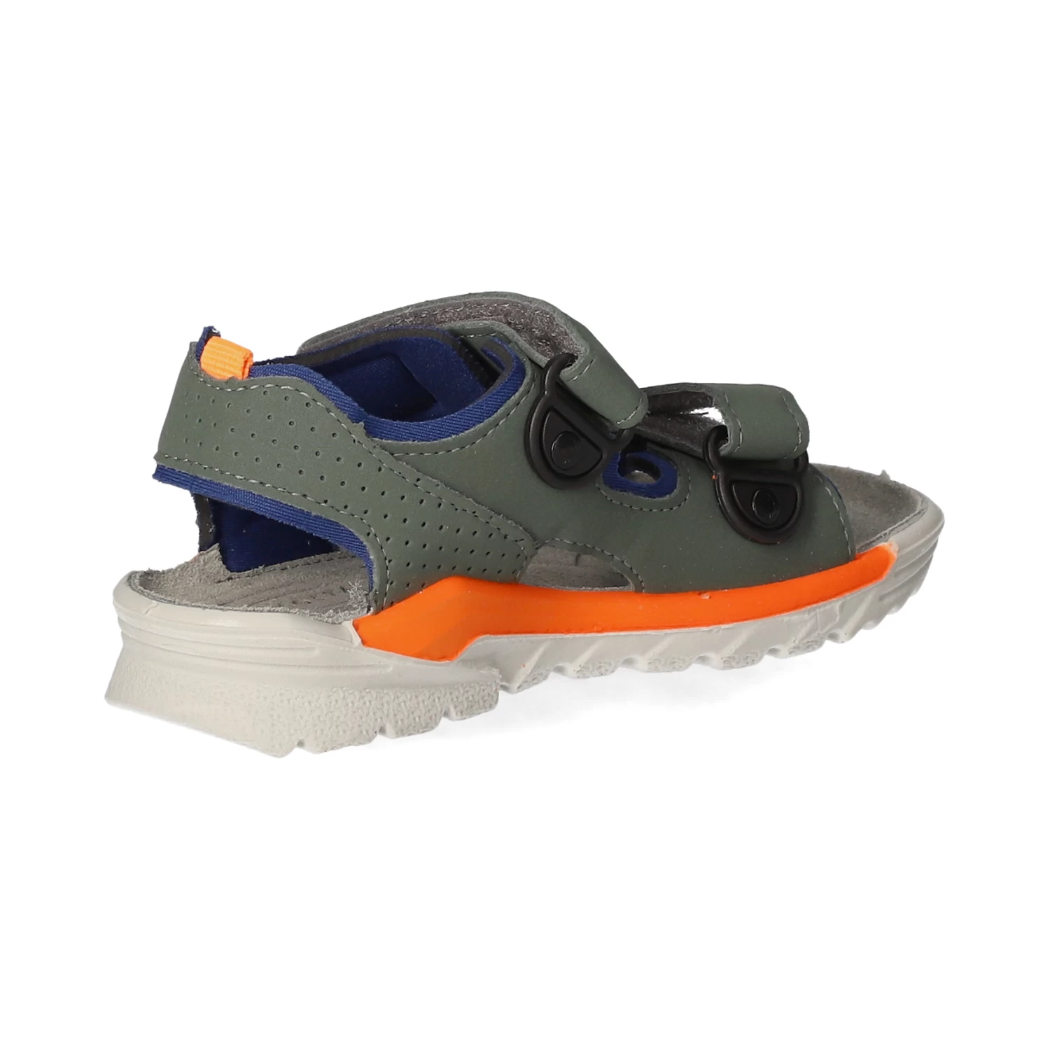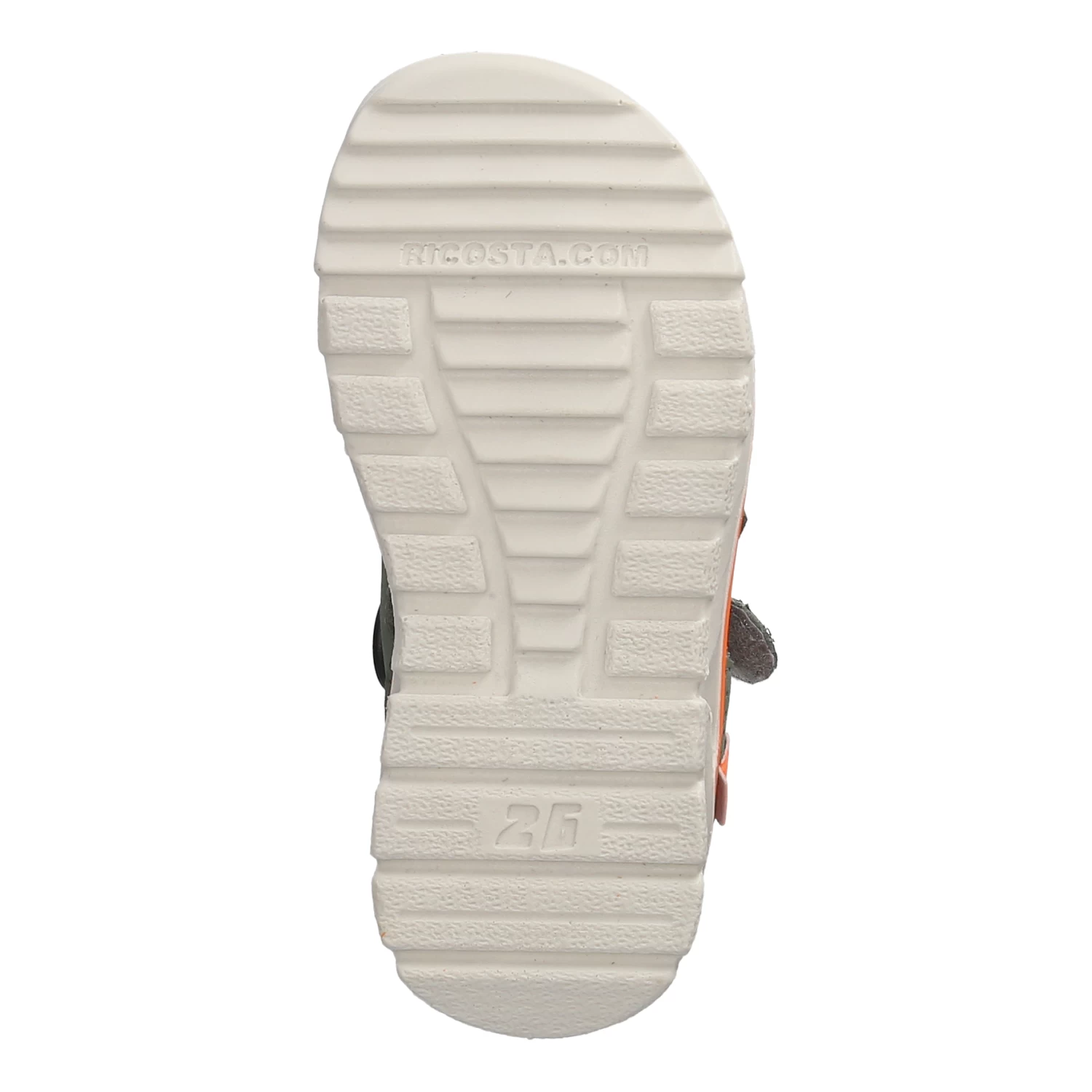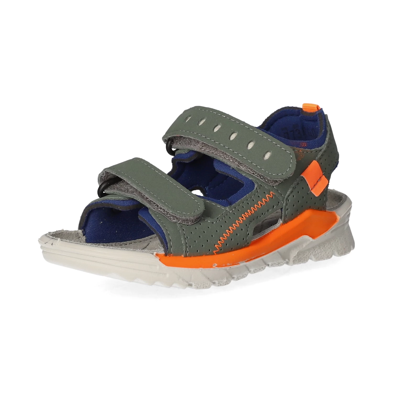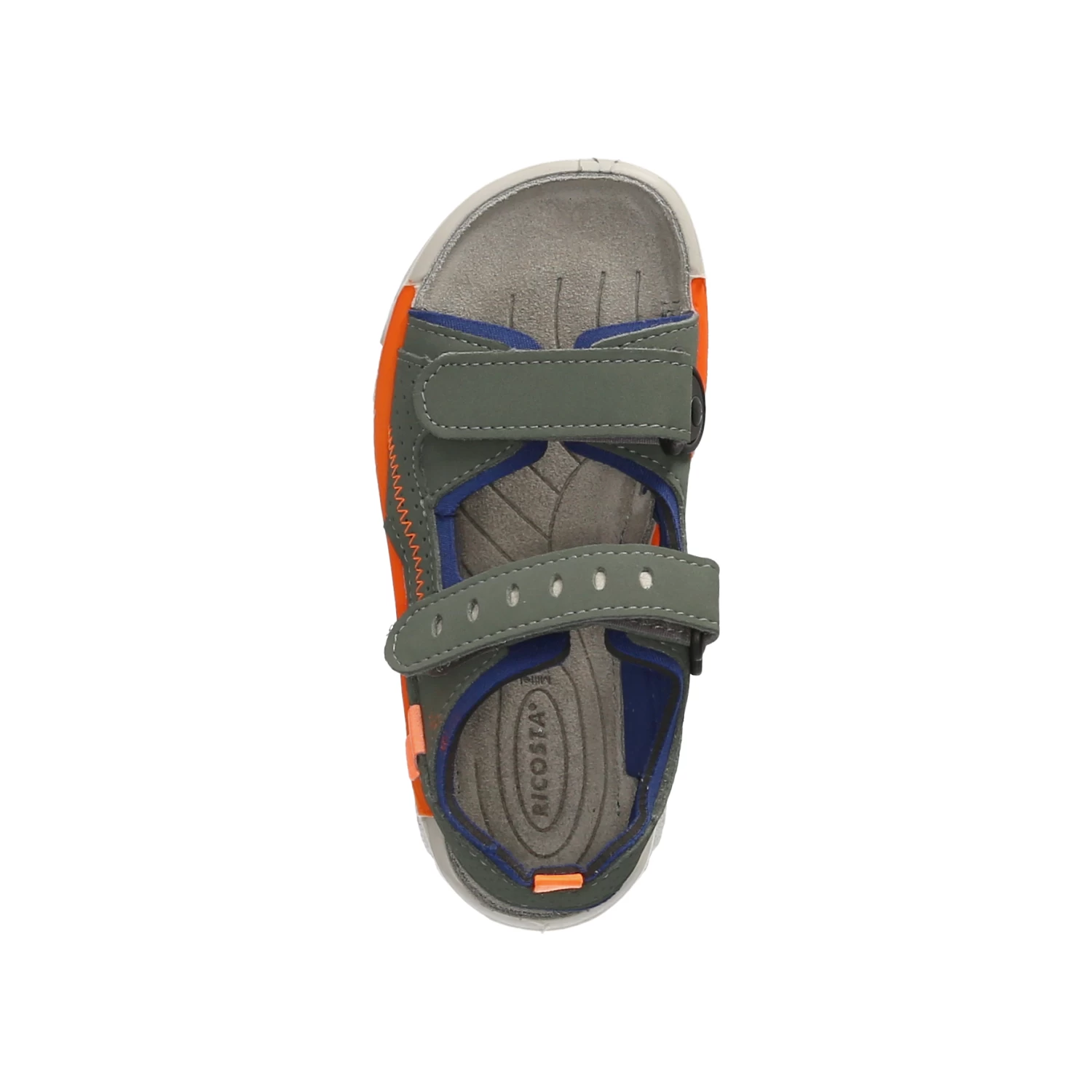 Ricosta Kinder Sandalen TAJO GrĂĽn Synthetik – zwei Klettverschlussriemen – orangene und blaue Highlights – Anziehlasche – Ziernaht – gepolsterte Lederdecksohle – neoprenähnliches Futter – flexible, rutschhemmende Laufsohle – waschbar