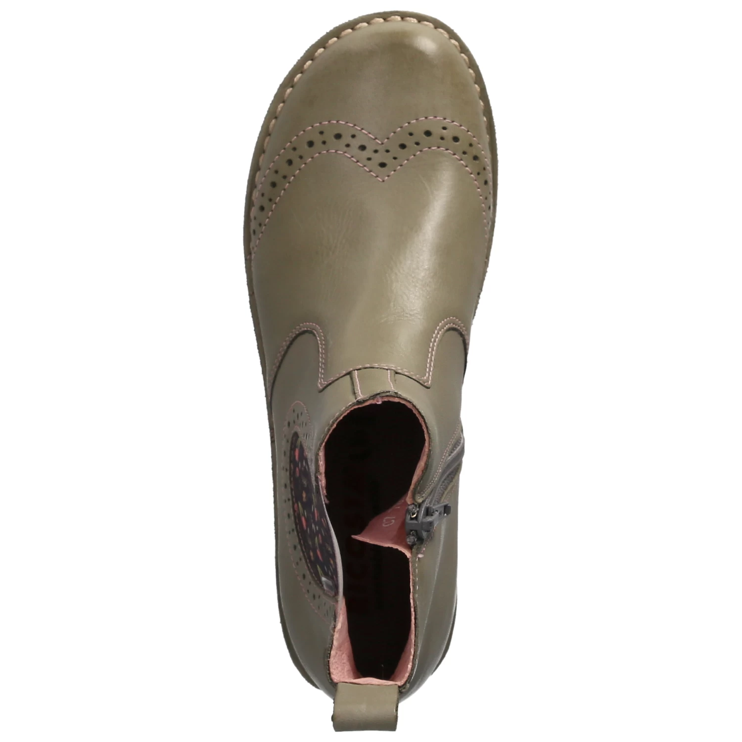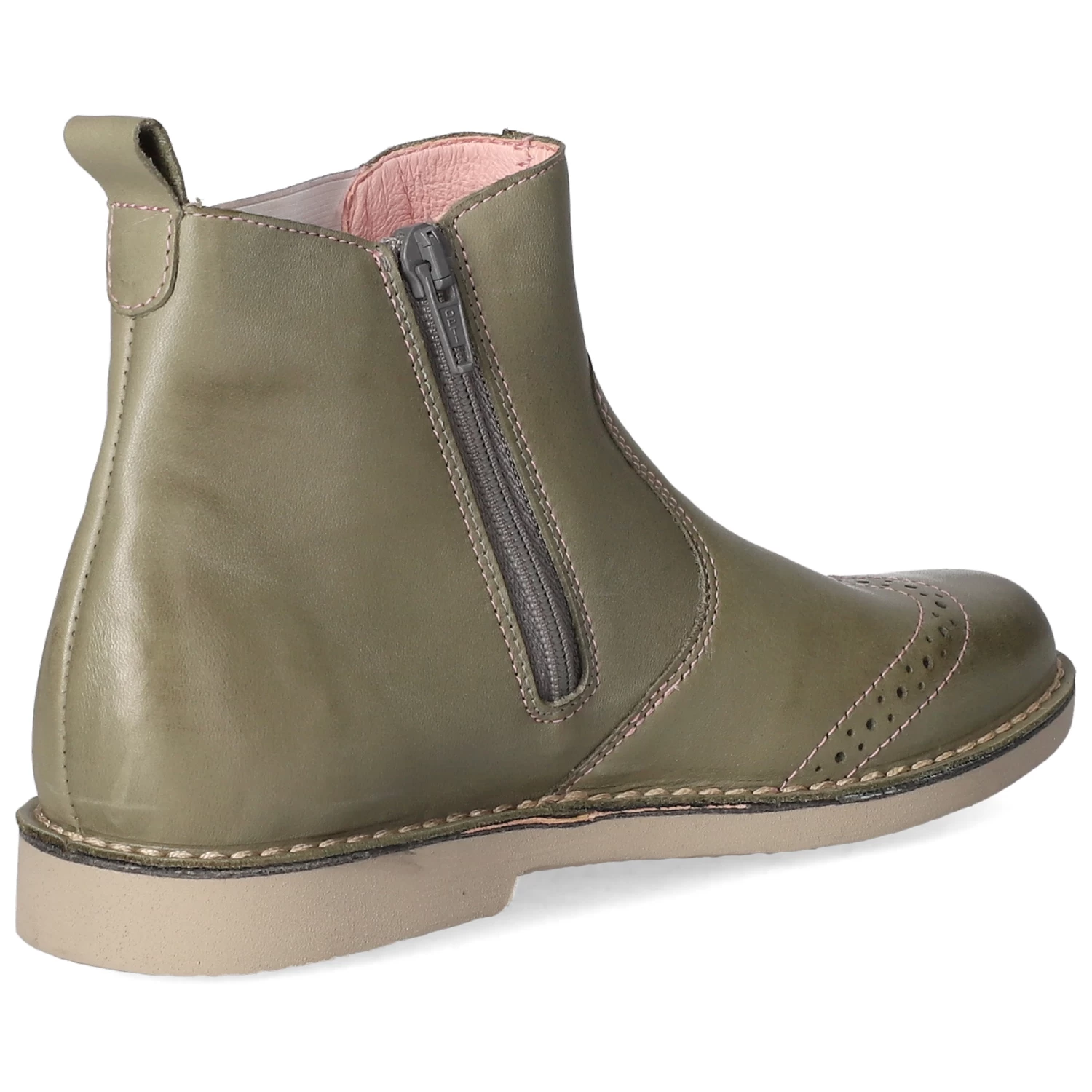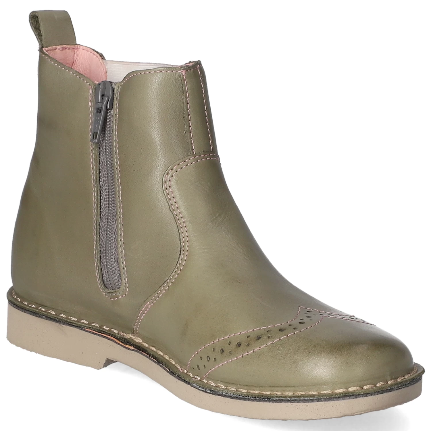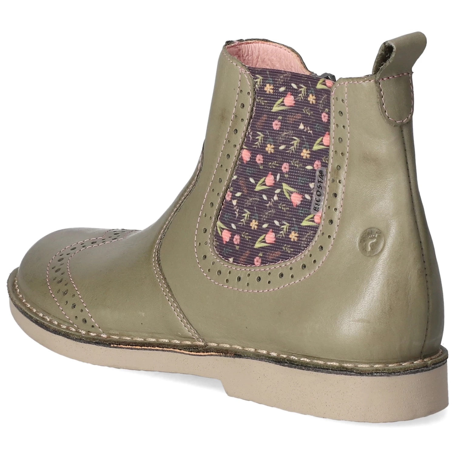 Ricosta Mädchen Stiefeletten DALLAS Grün Glattleder – Reißverschluss – mit Blumen bedruckter elastischer Einsatz seitlich – Ziernähte – teilweise Lochstanzungen auf der Zehenkappe – verstärkter Zehen- und Fersenbereich – Anziehlasche – gepolstertes Wechselfußbett – flexible, rutschhemmende Laufsohle – WMS-Schuhweite Mittel