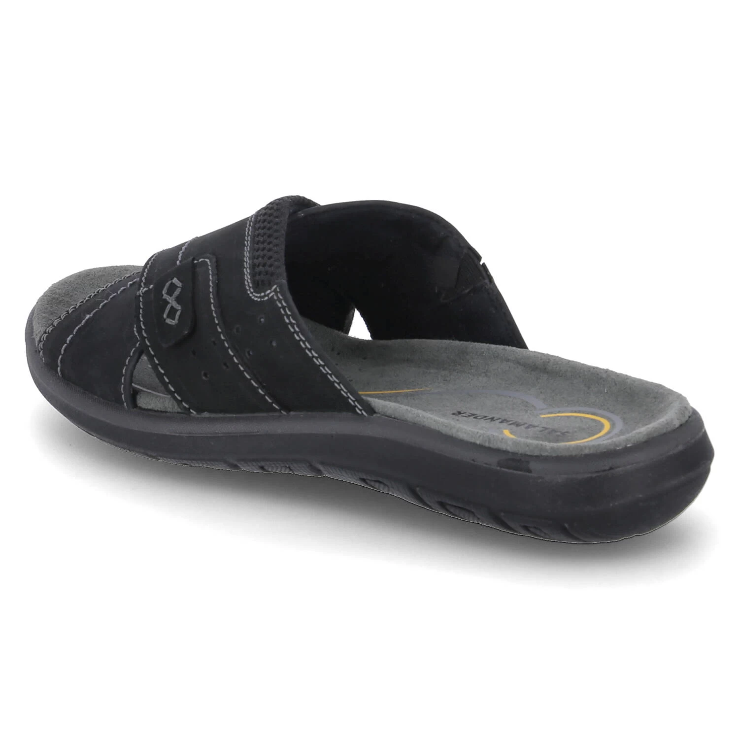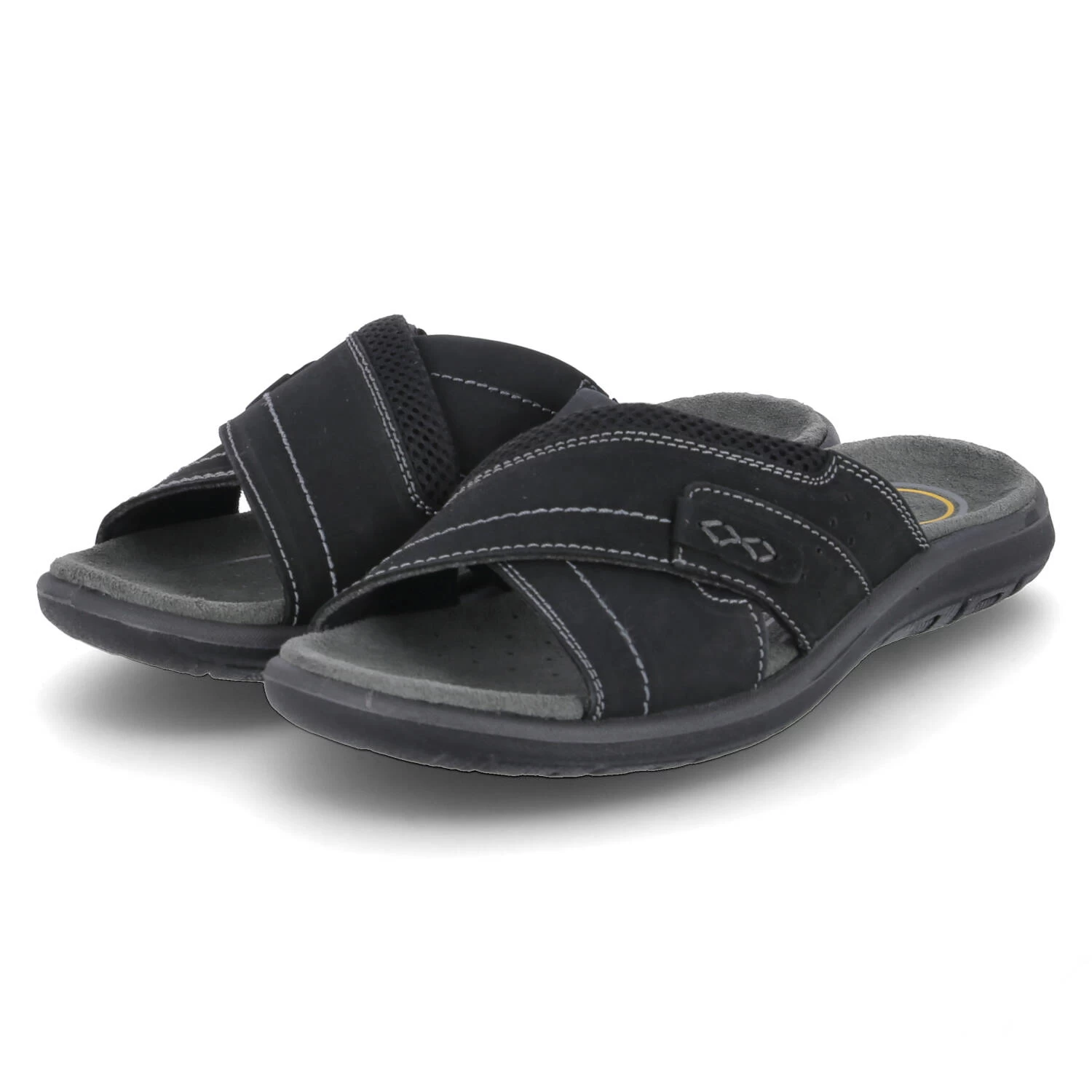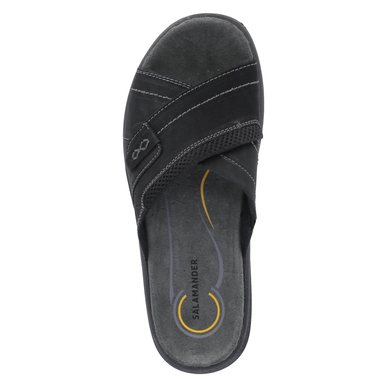 Salamander Herren Pantoletten LOGATO Schwarz Rauleder – breite, gekreuzte Riemen mit Ziernähten und seitlichem, kleinen Elastikeinsatz – vorgeformte, weiche Lederdecksohle – flexible Laufsohle mit Profil