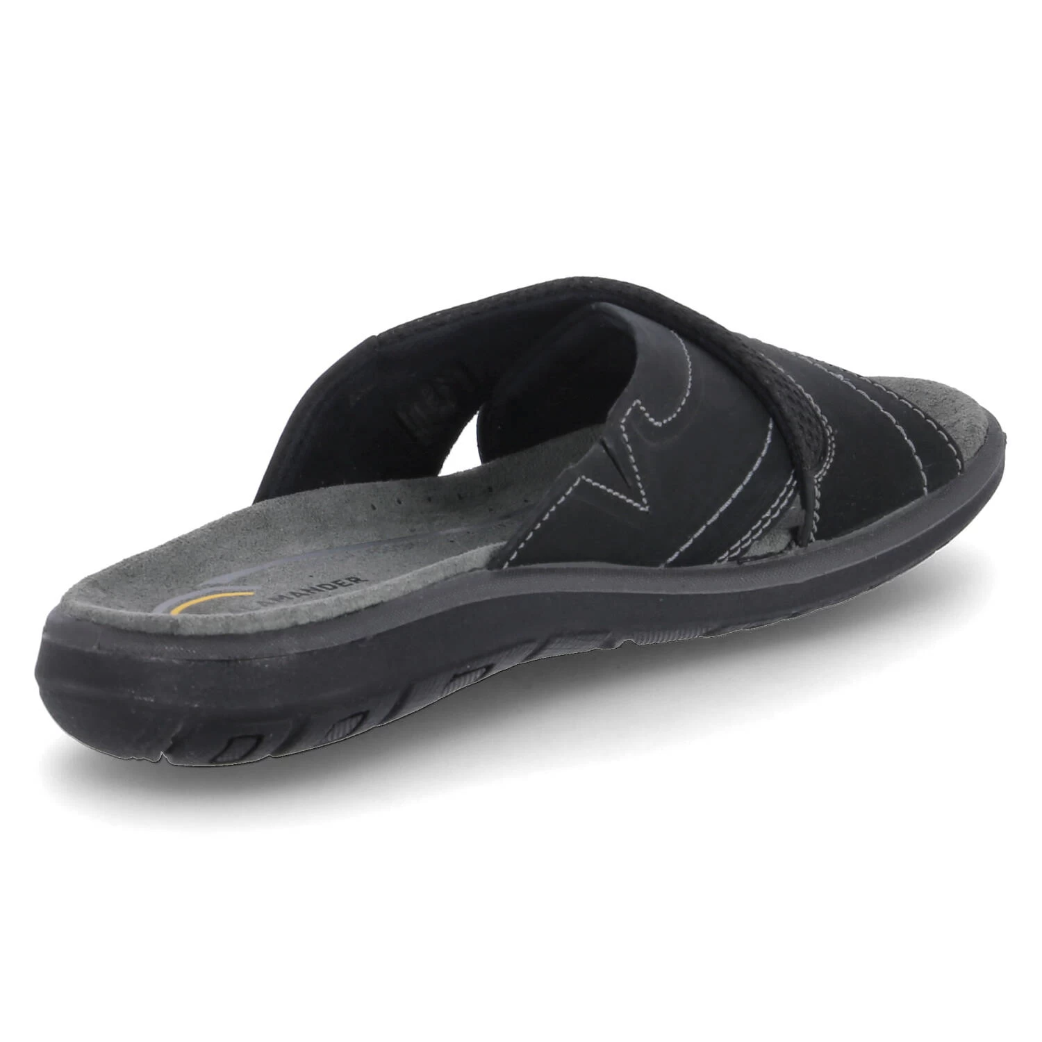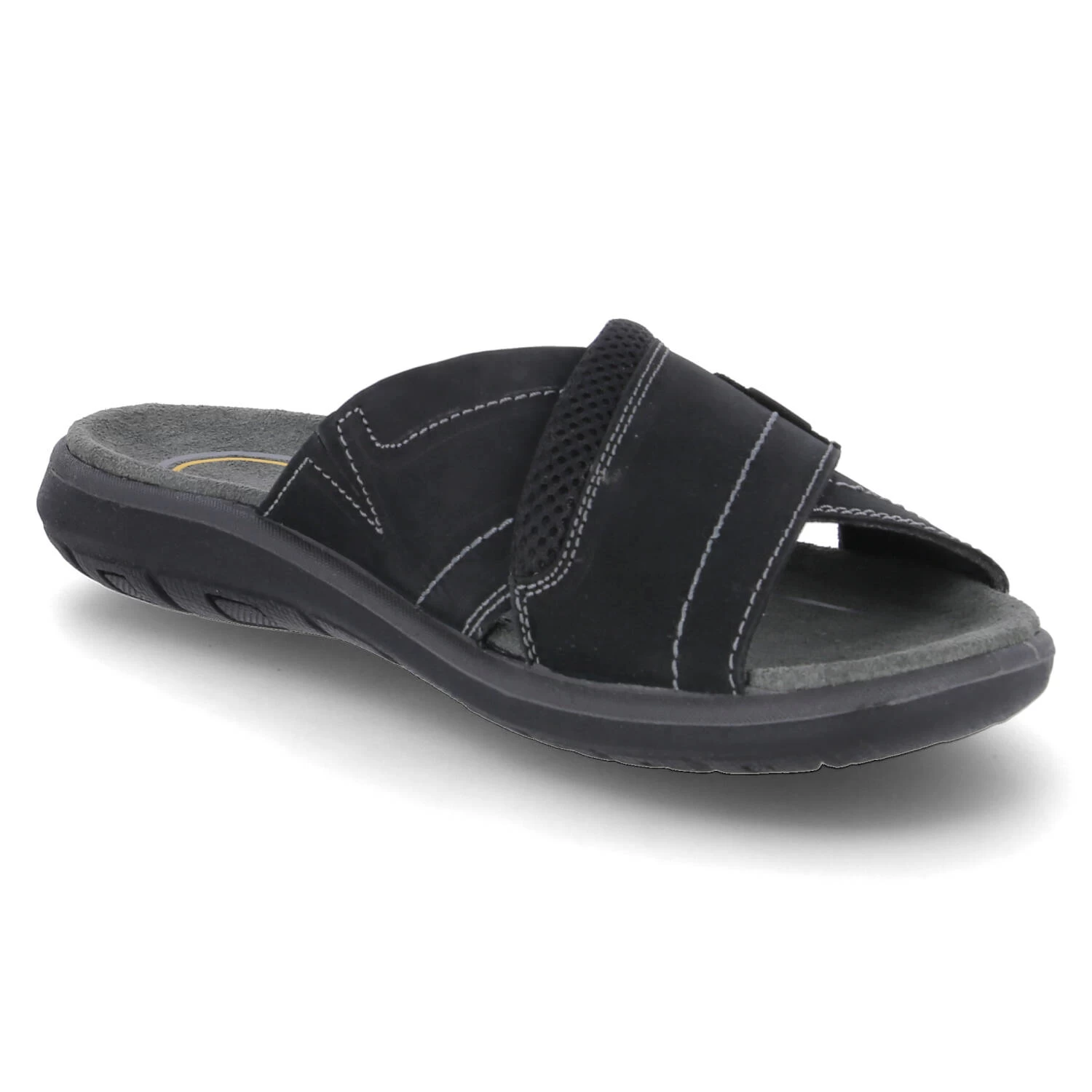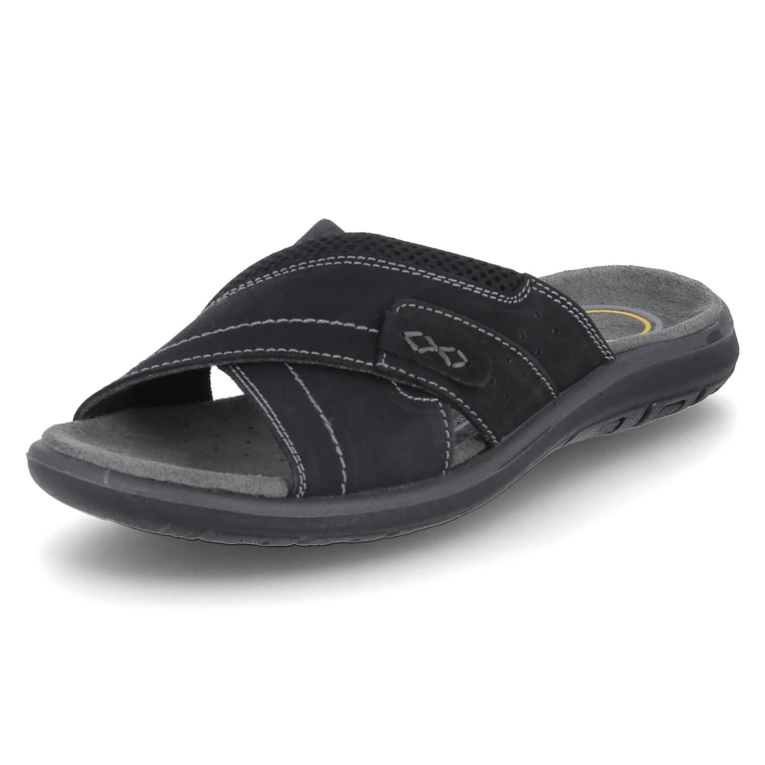 Salamander Herren Pantoletten LOGATO Schwarz Rauleder – breite, gekreuzte Riemen mit Ziernähten und seitlichem, kleinen Elastikeinsatz – vorgeformte, weiche Lederdecksohle – flexible Laufsohle mit Profil