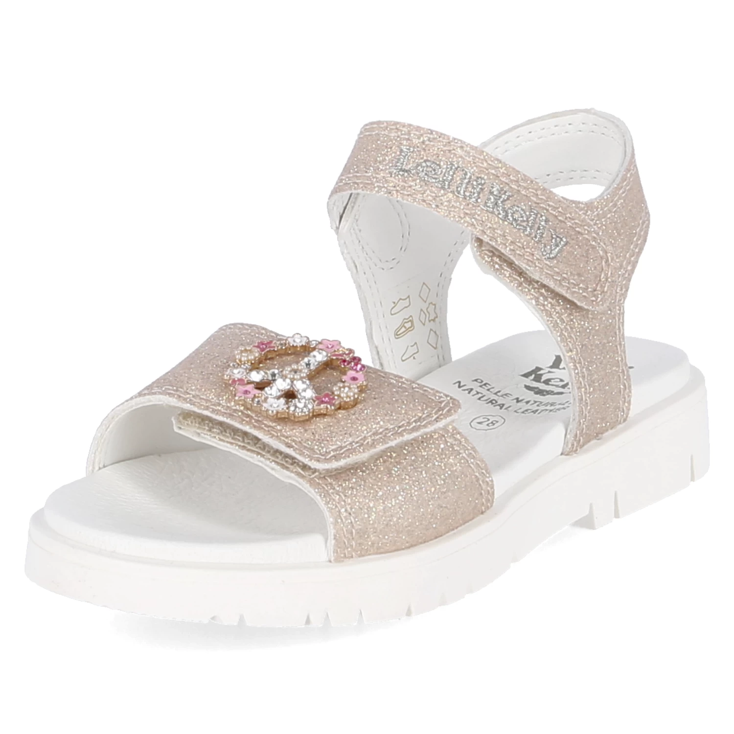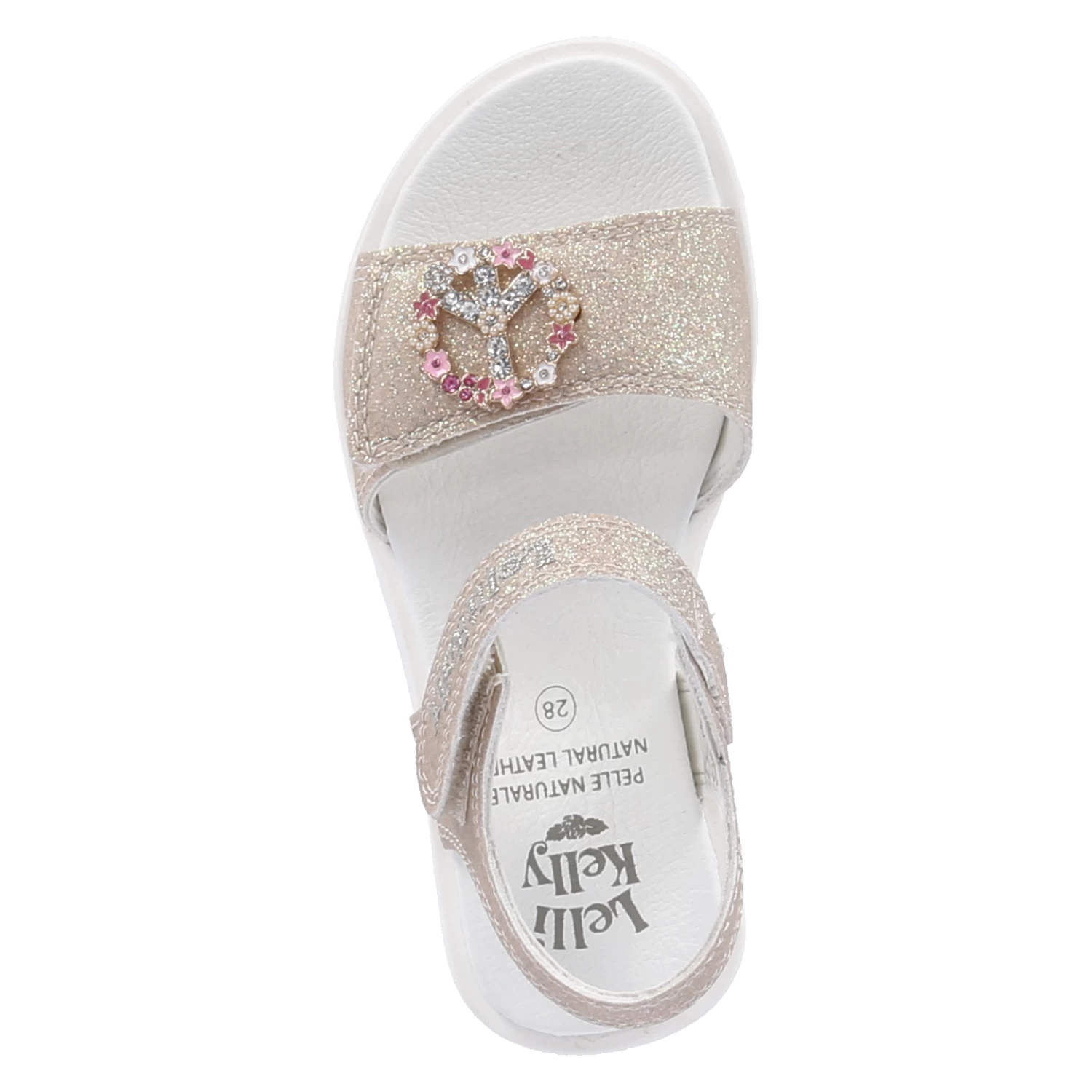 Lelli Kelly Mädchen Sandaletten/ Sandalen FELICIA 1 Rosè-Gold Synthetik – schillernde Glitzeroberfläche – zwei Klettverschlussriemen – vorderer Riemen mit Peacezeichen in farbigen Blumen und Glitzersteinen – weiche Lederdecksohle – flexible, rutschhemmende Laufsohle mit Profil