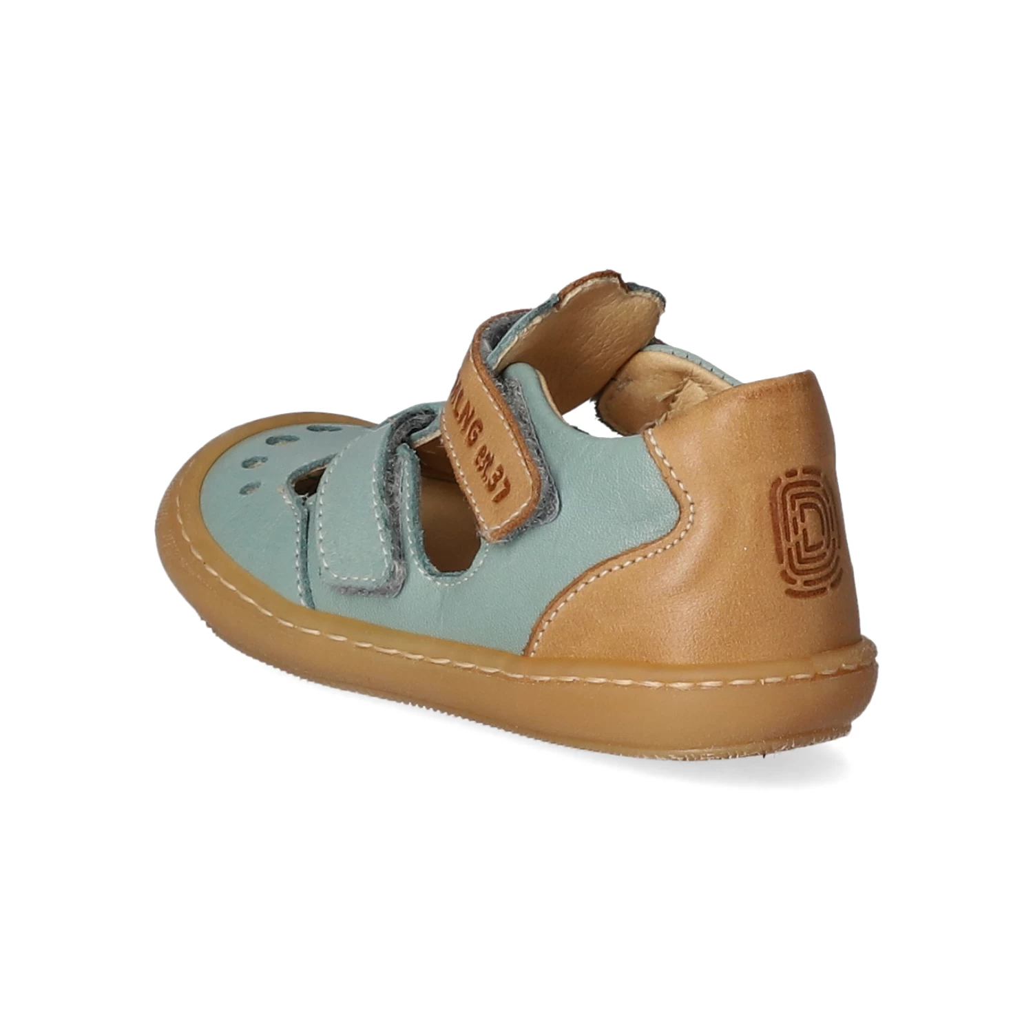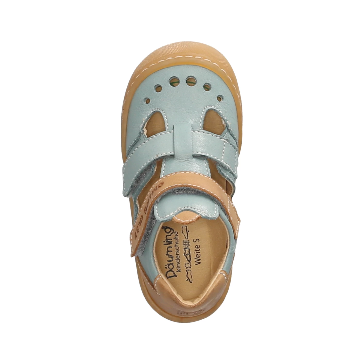 Däumling Kinder Sandalen/ Lauflernschuhe SVEN Blau Glattleder – gelochter Zehenbereich – typische Markendetails – Klettverschluss – verstärkter Zehen- und Fersenbereich – dezenter gepolsterter Einstieg – angenehmes Lederfutter – gepolsterte Wechseldecksohle – flexible, rutschhemmende Laufsohle