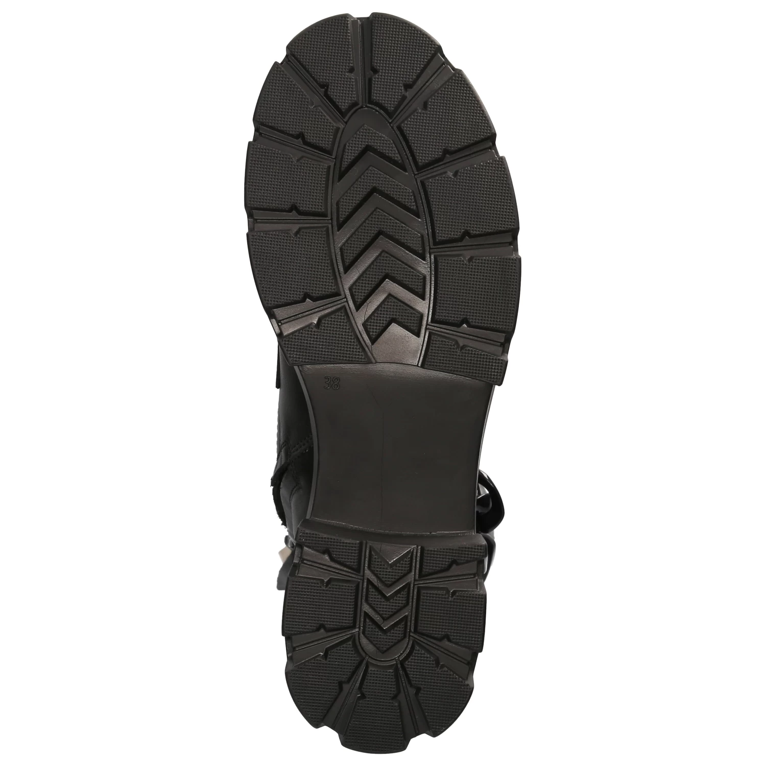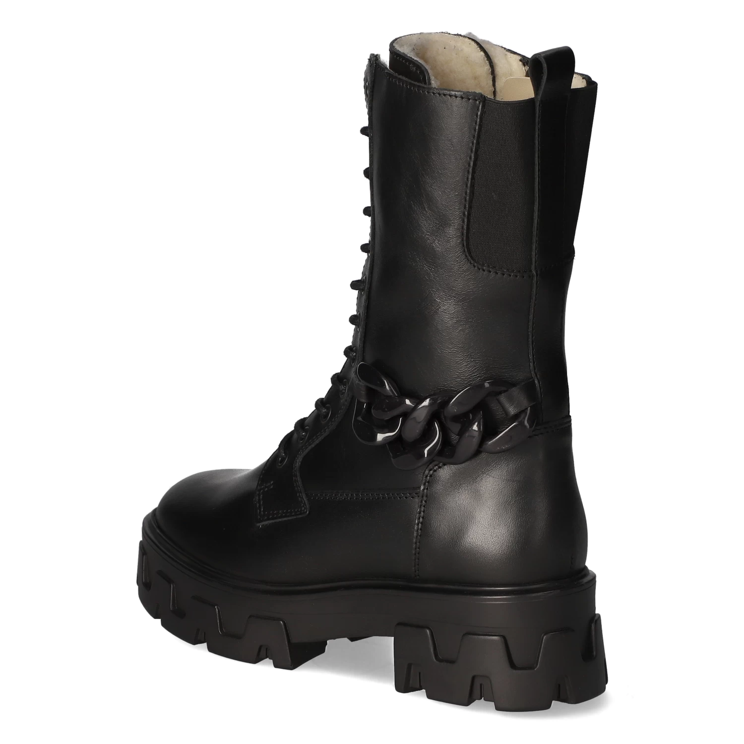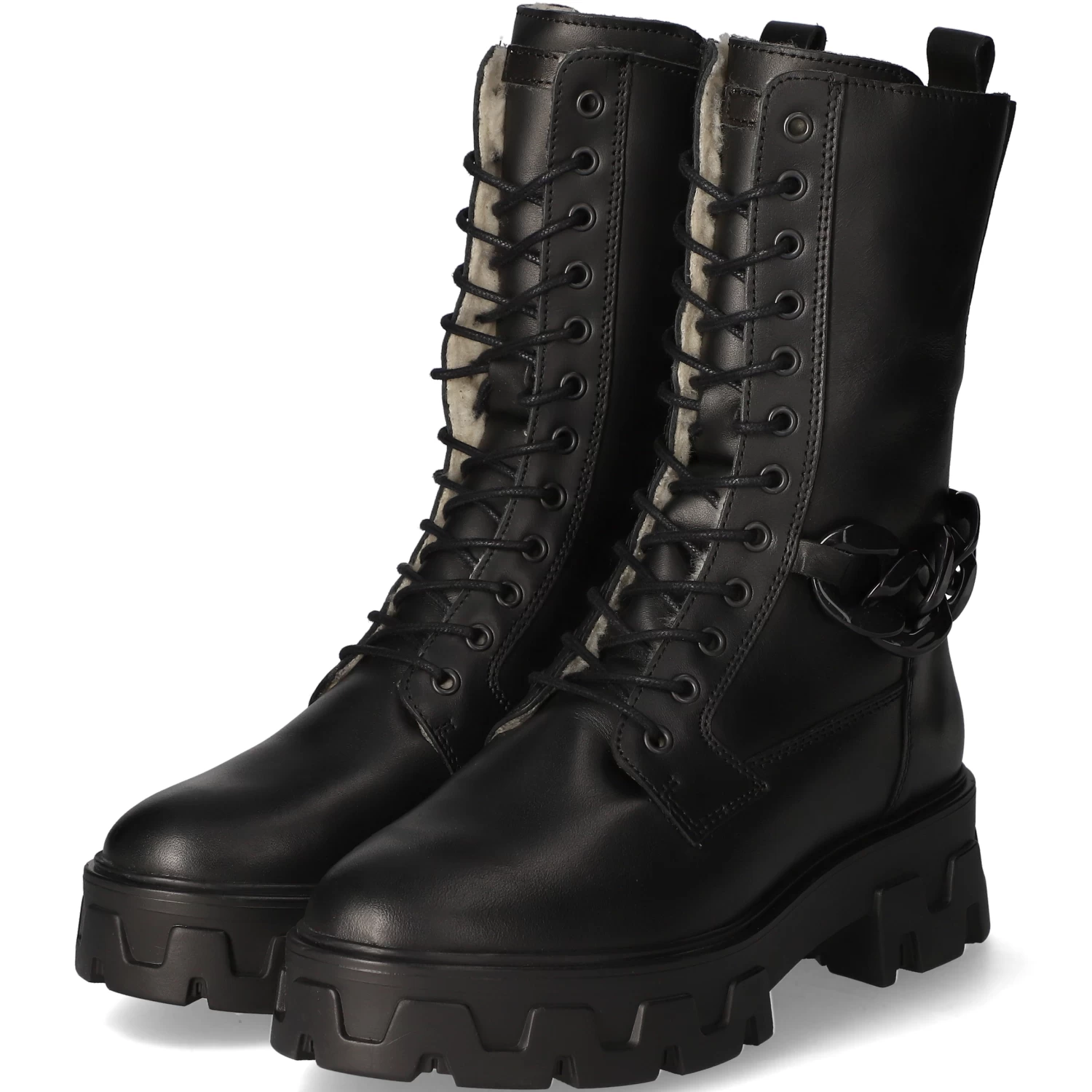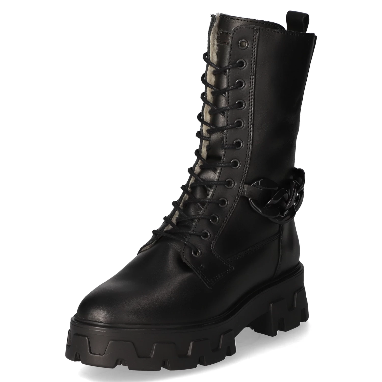 Empor Damen Schnürstiefeletten/ Winterstiefeletten Schwarz Glattleder – Zierketten seitliche am Schaft – dezenter Elastikeinsatz am Einstieg – Schnürung und Reißverschluss – warmes Textilfutter – gepolsterte Decksohle – verstärkter Fersenbereich – robuste, rutschhemmende Profilsohle – Plateau ca. 3 cm