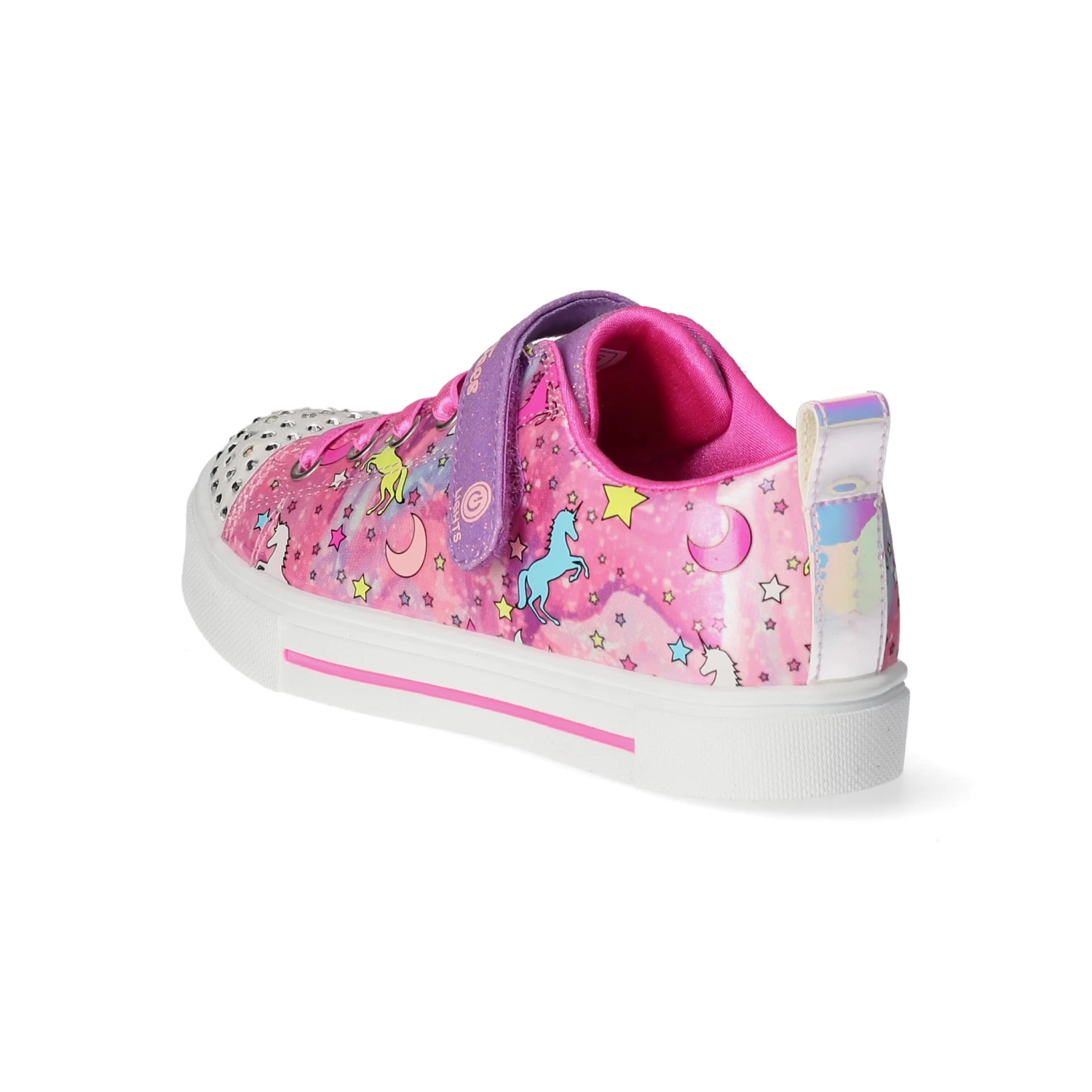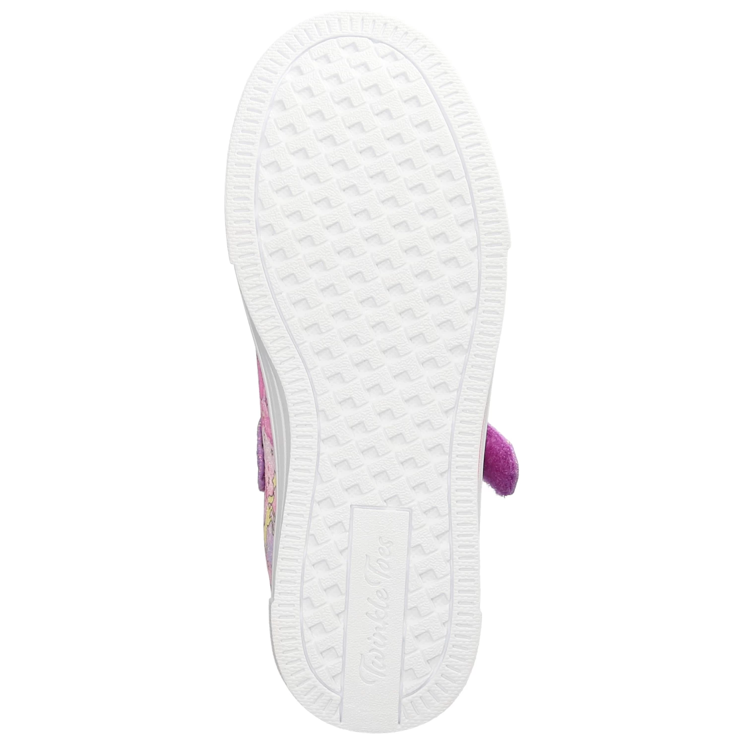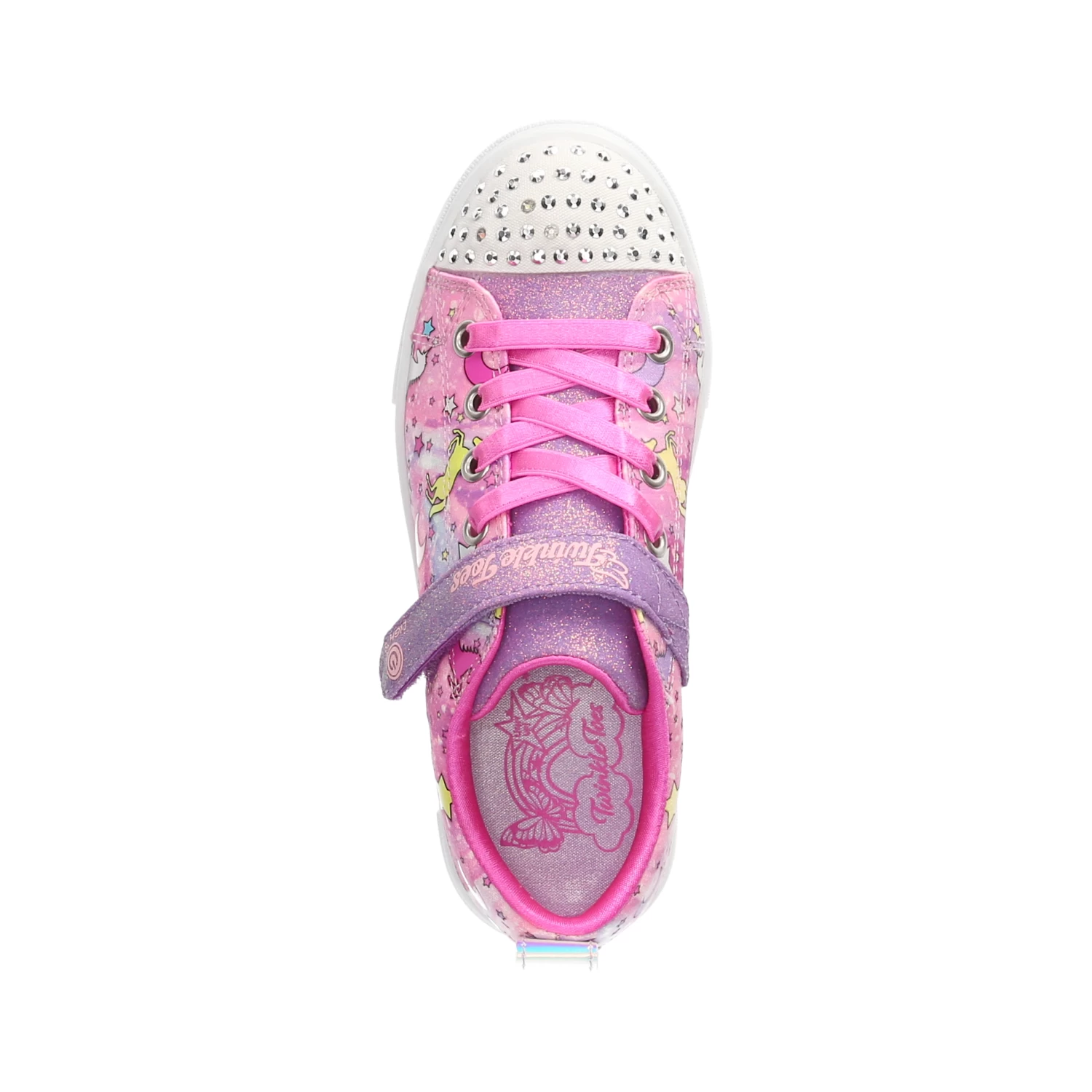 Skechers Mädchen Low Sneaker UNICORN DREAMING Pink Textil – sportliches Design – hĂĽbscher Einhorn Print – modische Ziernieten – blinkende LEDs – typische Markendetails – Klettverschluss und ElastikschnĂĽrung – Anziehlasche – verstärkter Zehen- und Fersenbereich – gepolsterter Einstieg – leichtes Textilfutter – gepolsterte Decksohle – flexible, rutschhemmende Profilsohle