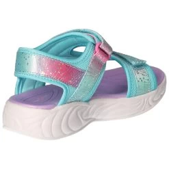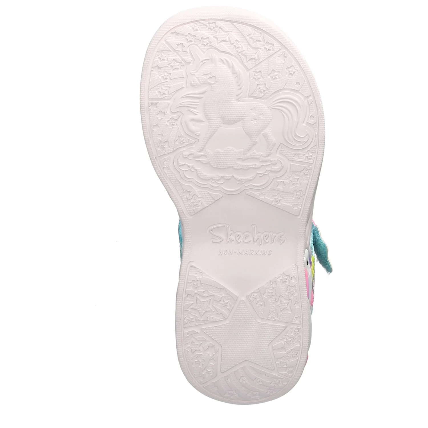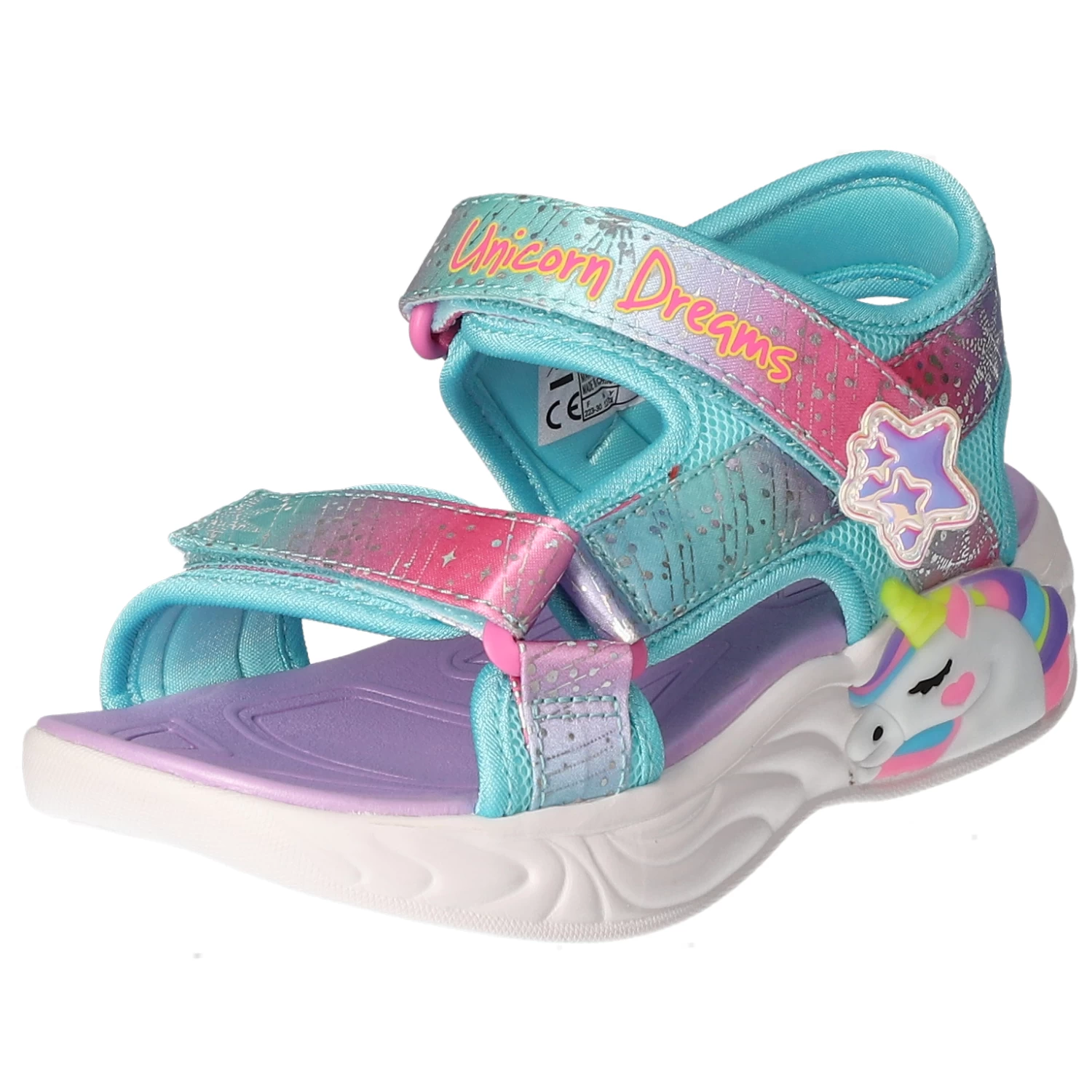 Skechers S-LIGHTS UNICORN DREAMS Mädchen Sandalen MAJESTIC BLISS Blau/Pink Textil-Synthetik-Mix – teils mit glitzerndem Print – Einhorn am Sohlenrahmen – Klettverschluss – Logo – flexible, rutschhemmende non marking Laufsohle mit bunten LED`s (schaltbar)