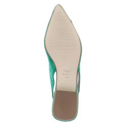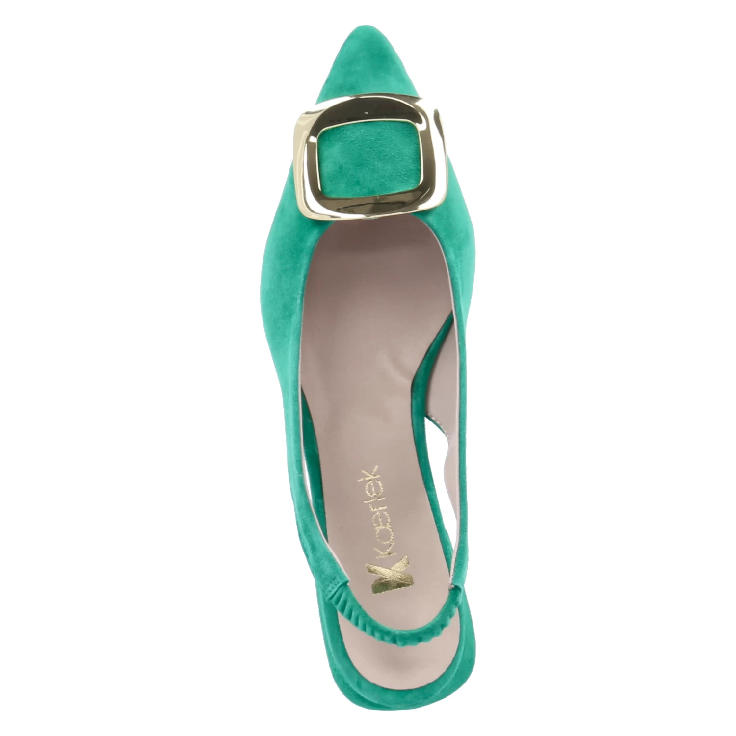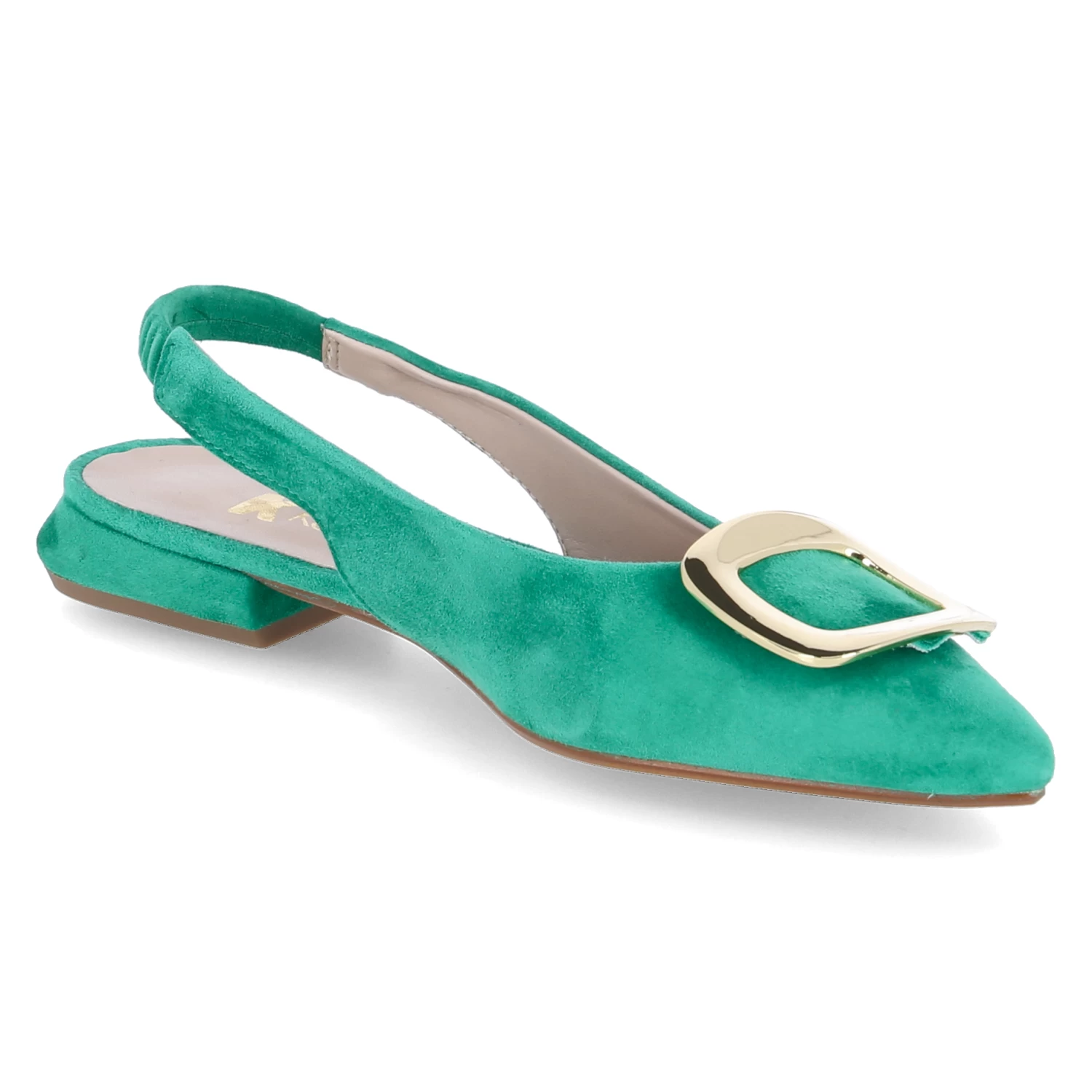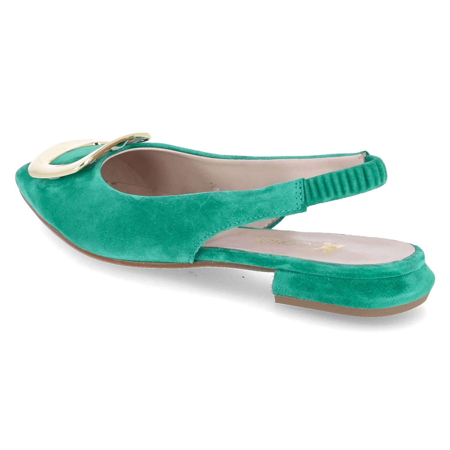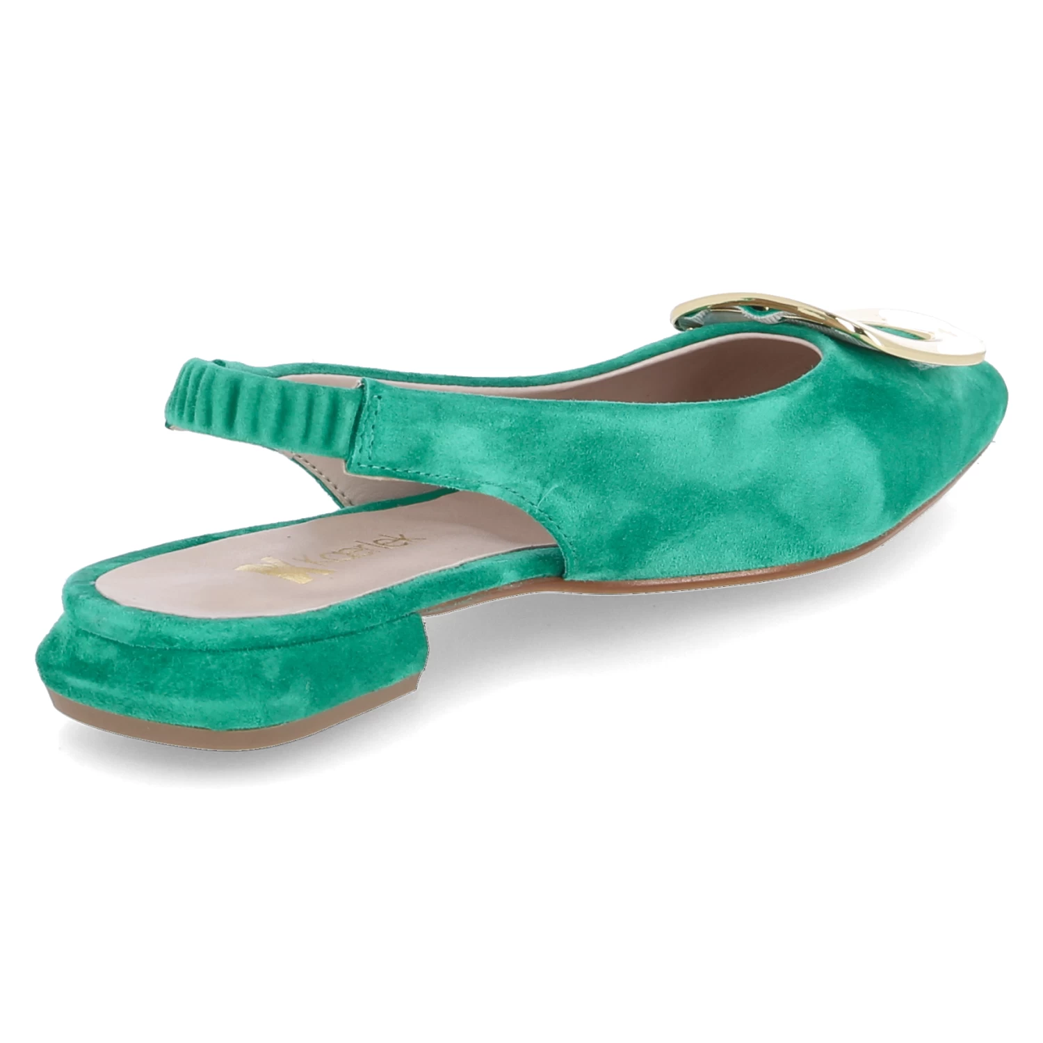 Kaerlek Damen Sling-Ballerinas ELOISA GrĂĽn Rauleder – elegantes Design – groĂźe Brosche in Goldoptik – Sling mit Elastikeinsatz – angenehmes Lederfutter – Lederdecksohle mit Fersenpolster – flexible, rutschhemmende Laufsohle