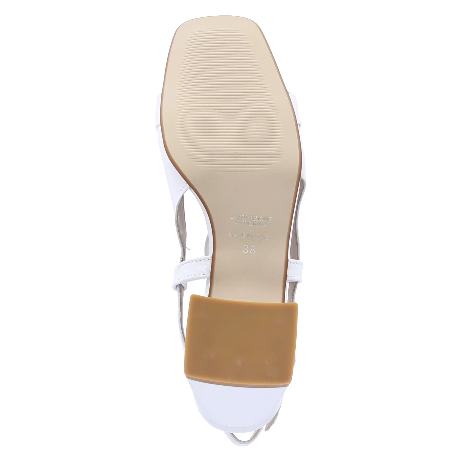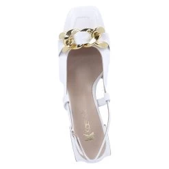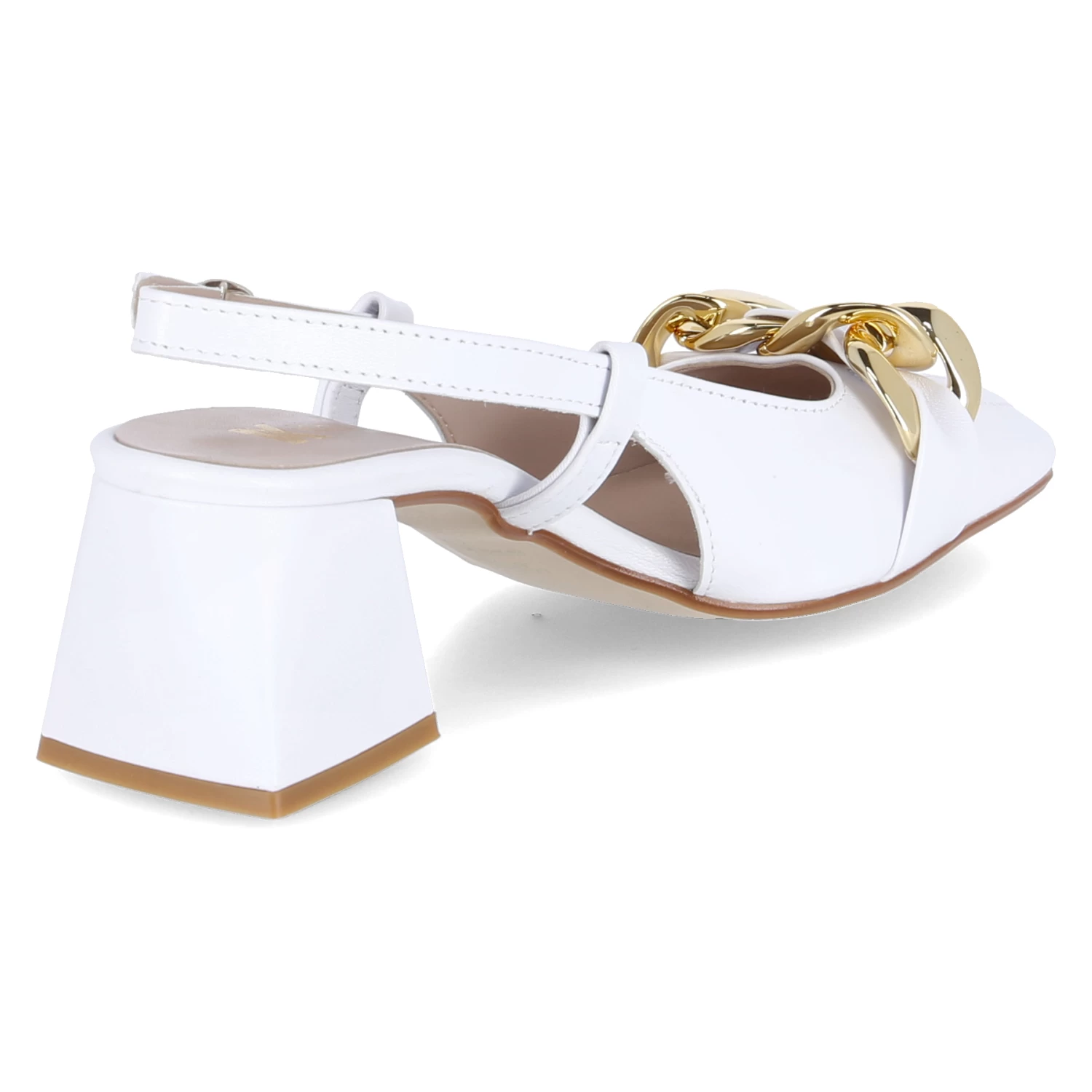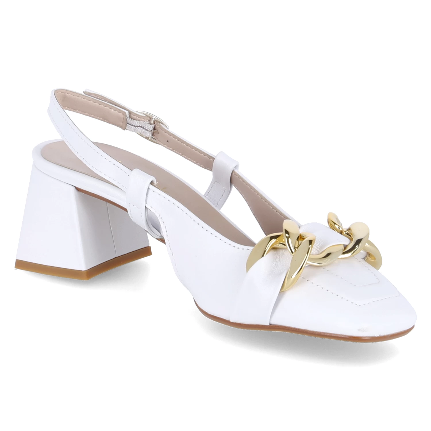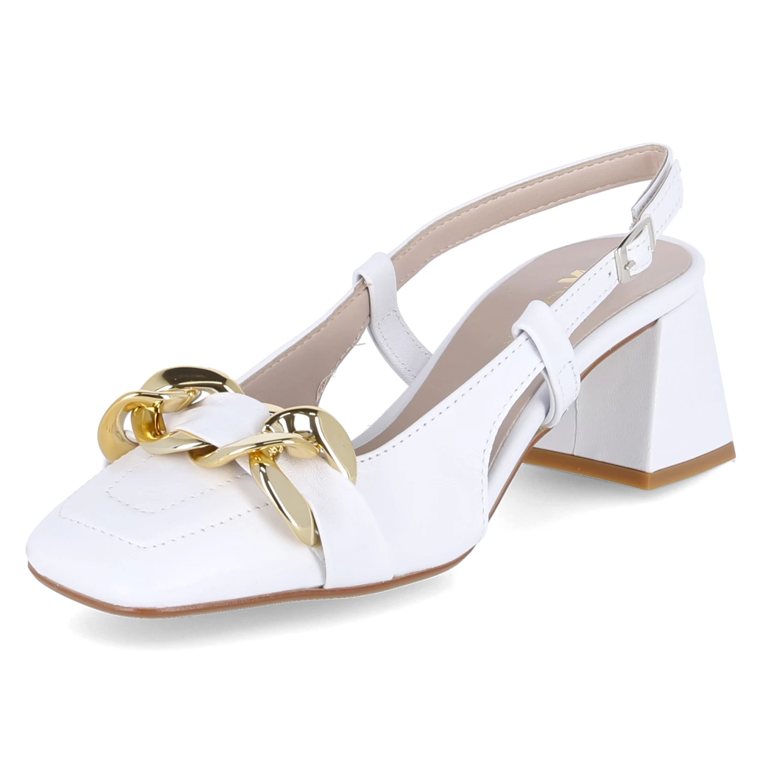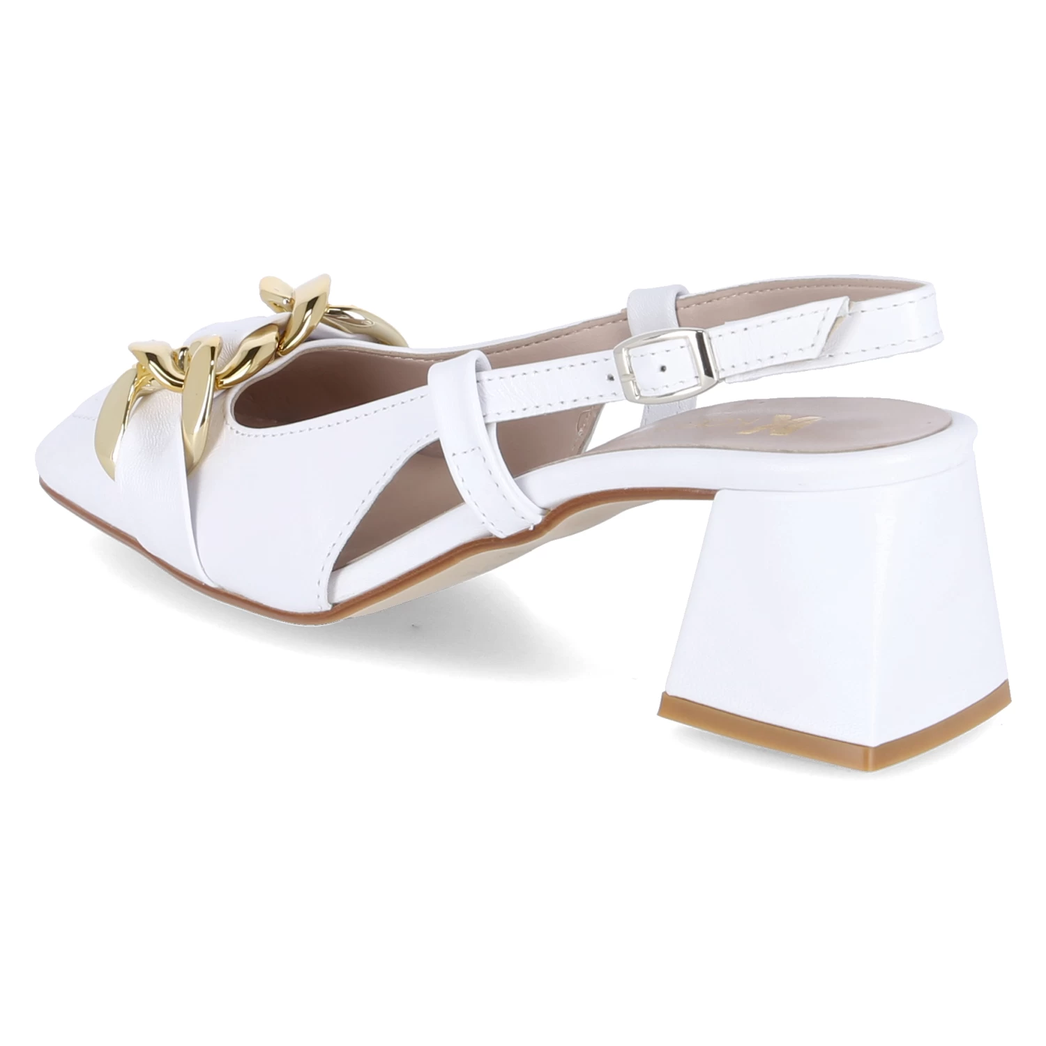 Kaerlek Damen Sling Pumps WeiĂź Glattleder – Verschlussriemen mit Schnalle und Elastikeinsatz – gepolsterte Lederdecksohle – flexible, rutschhemmende Laufsohle – Zierriemen mit Kettenelement