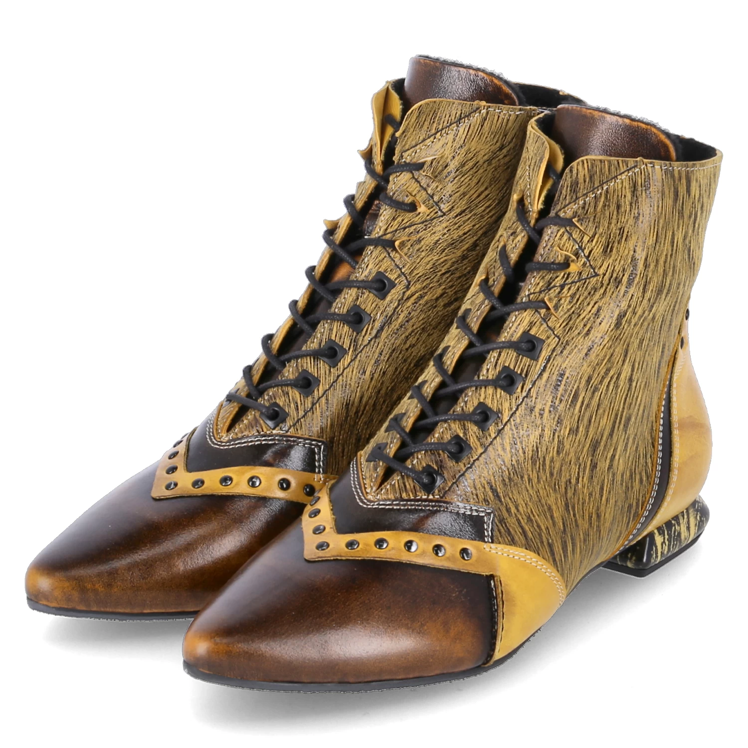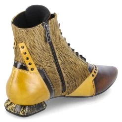 Simen Damen Stiefeletten Gelb Leder – Schnürung und Reißverschluss – Ziernähte – Zehenkappe braun und im used Look – Nieten – Fell Highlights am Schaft – gepolsterter Einstieg – leichtes Futter für kühle Tage – verstärkter Fersenbereich – flexible, rutschhemmende Laufsohle – ca. 2 cm Blockabsatz