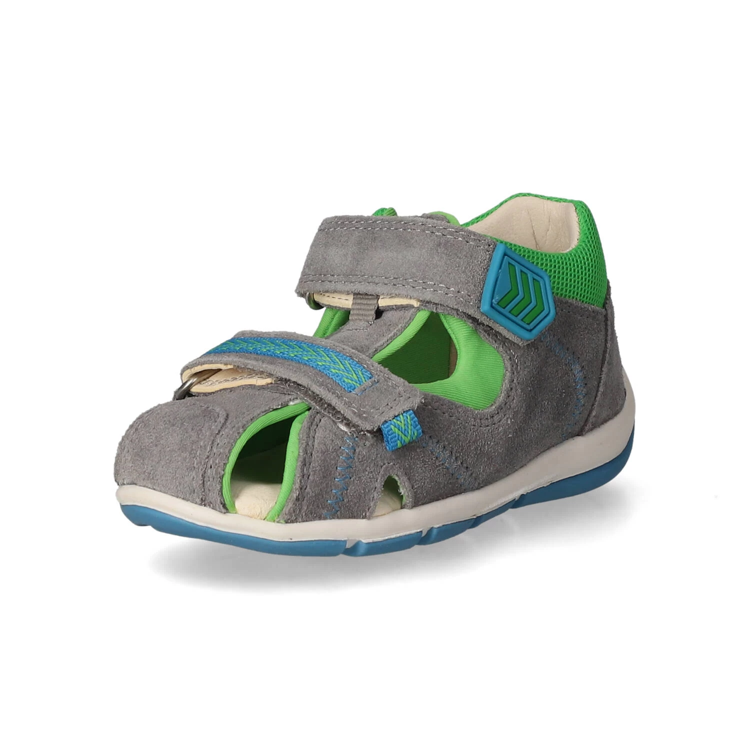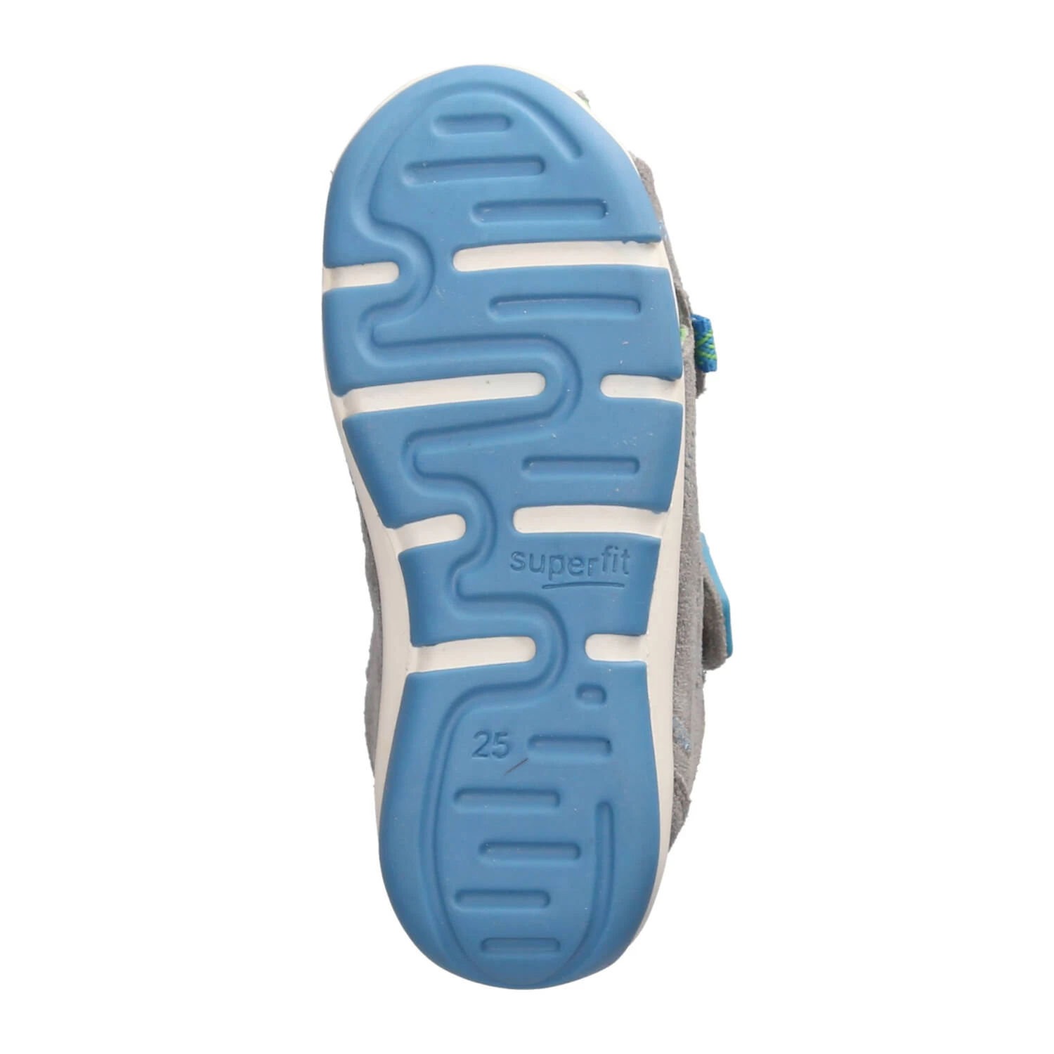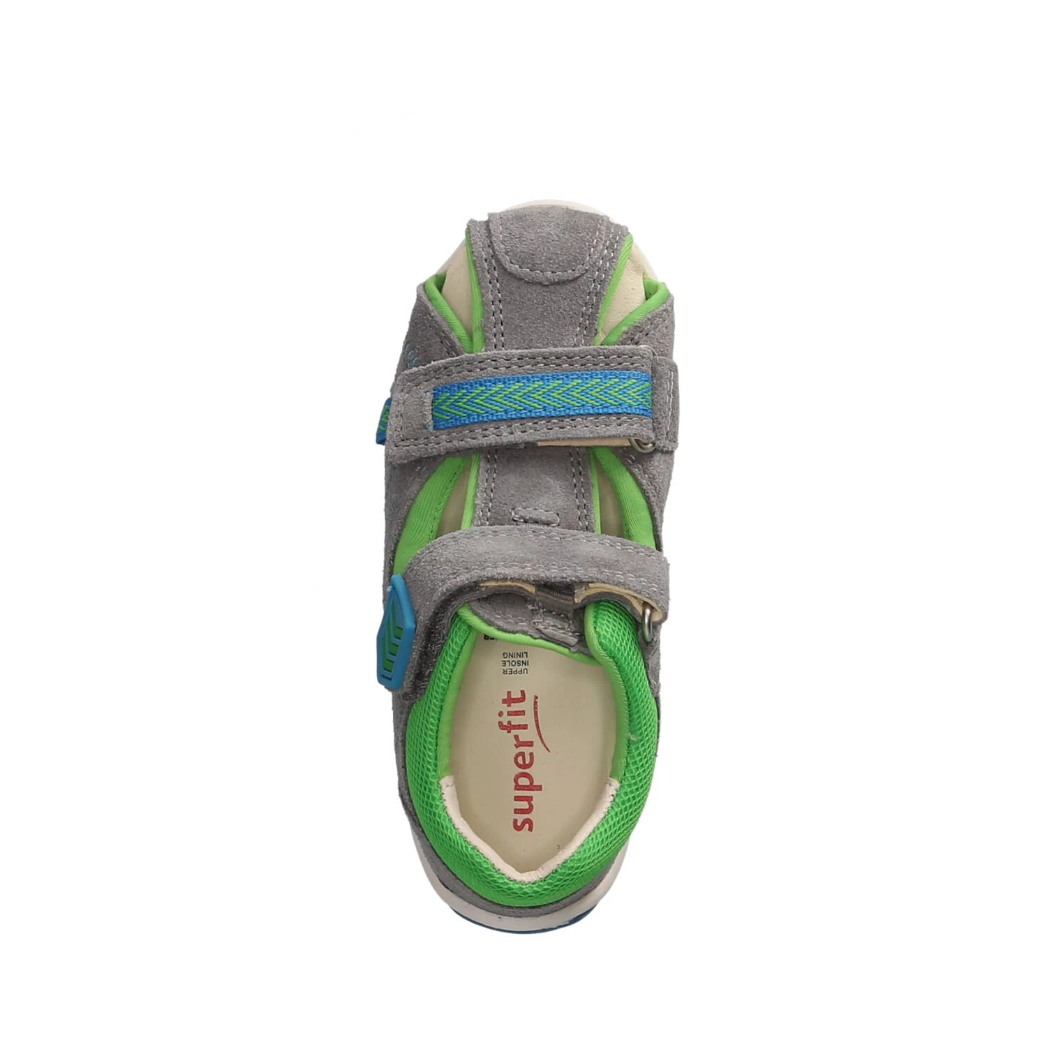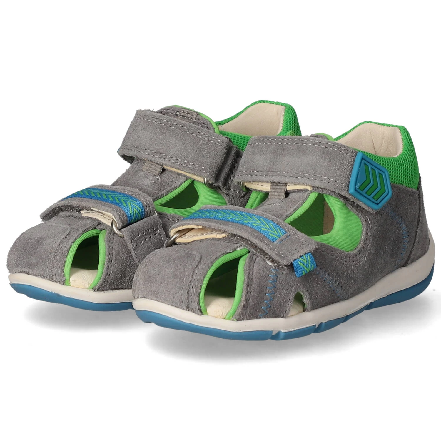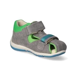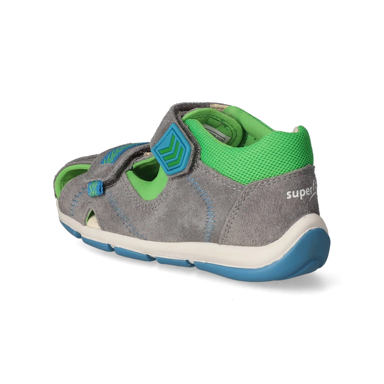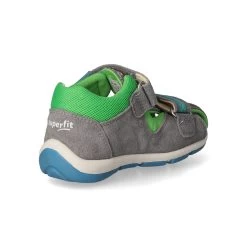 Superfit Kinder Sandalen FREDDY Grau Leder-Textil-Mix – dezente Markendetails – blaue und grĂĽne Akzente – zwei Riemen mit Klettverschluss – geschlossener Zehen- und Fersenbereich – gepolsterte Lederdecksohle – flexible, rutschhemmende Laufsohle