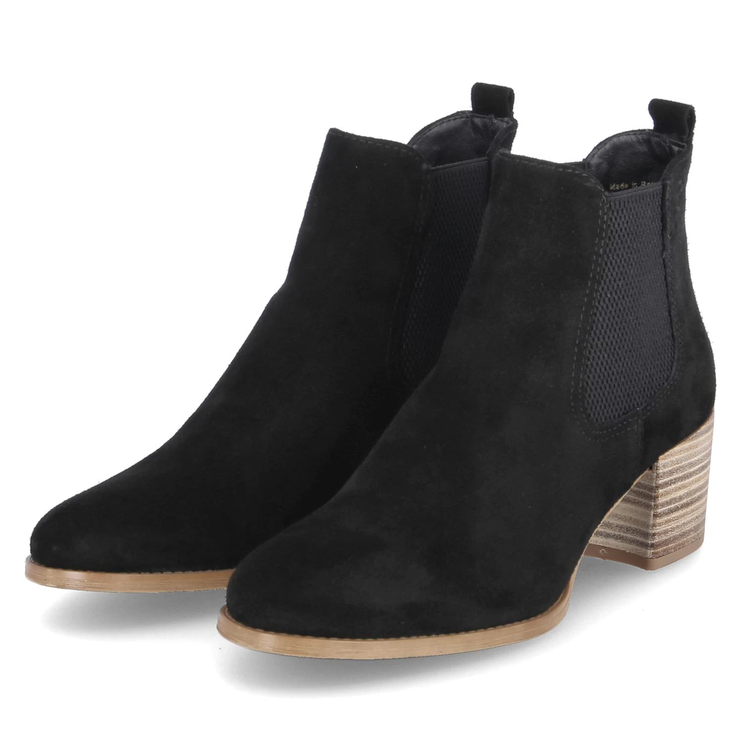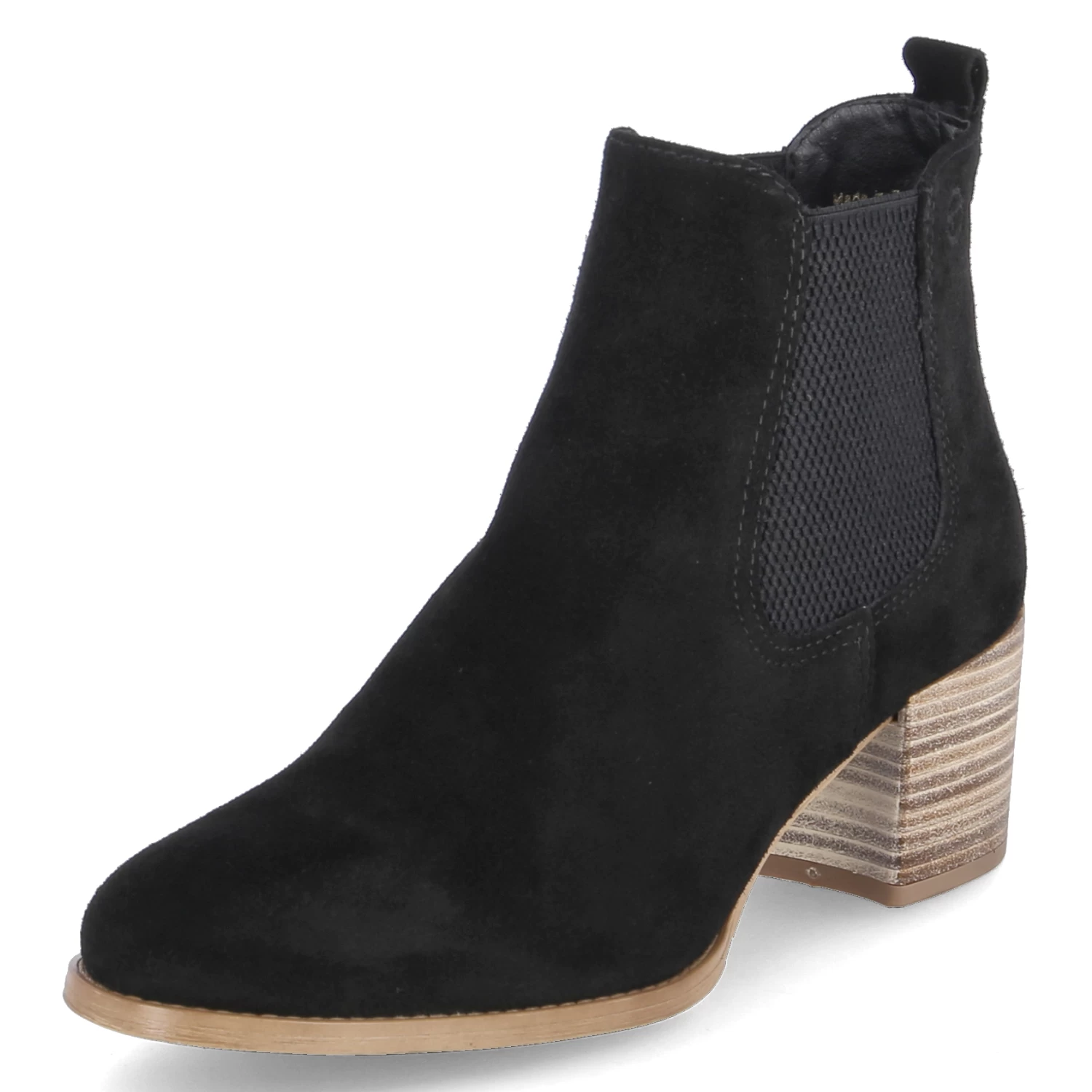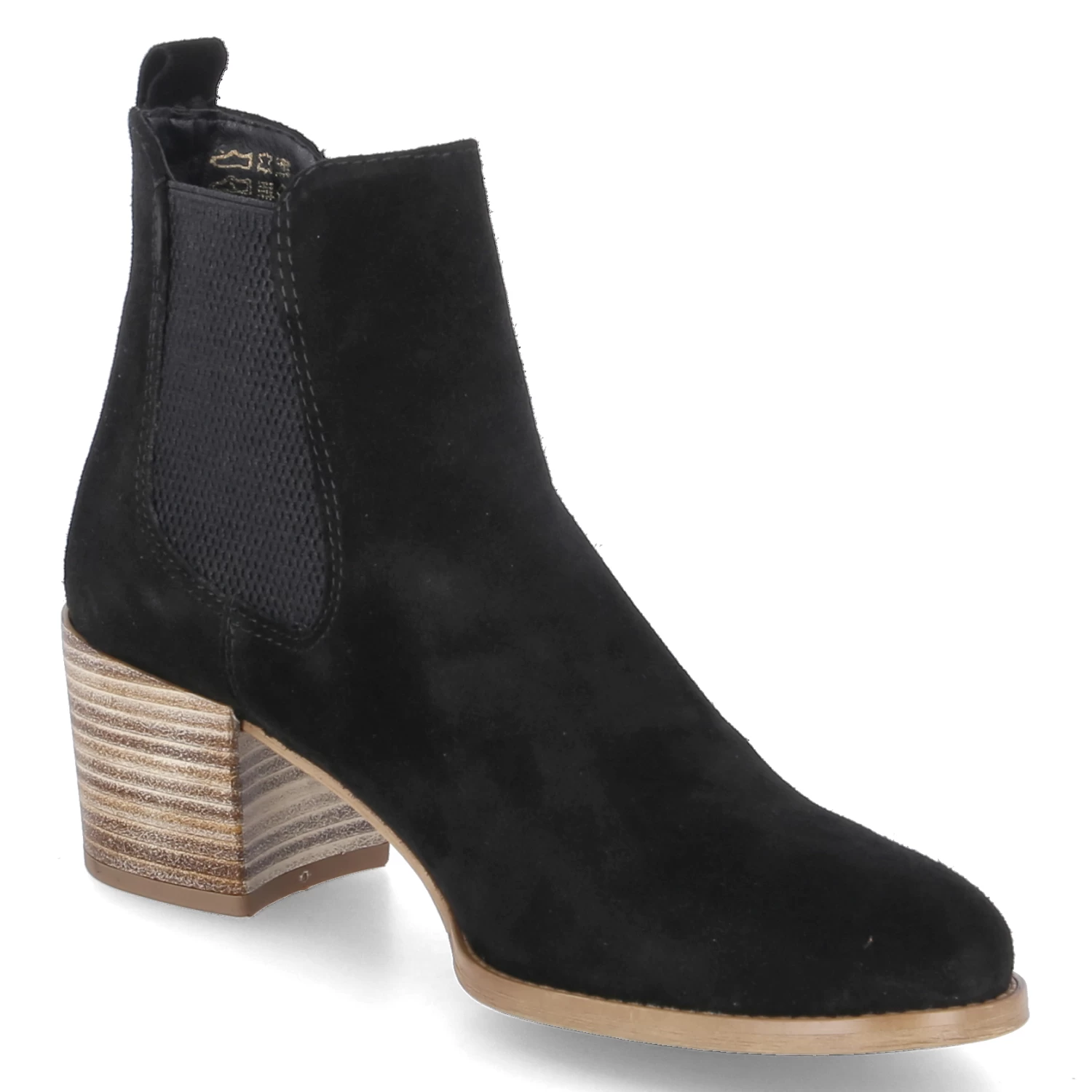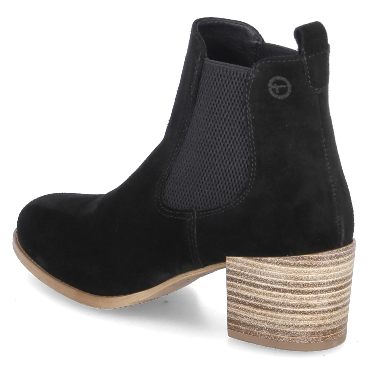 Tamaris Damen Chelsea Boots/ Stiefeletten Schwarz Leder-Textil-Mix – Blockabsatz in Holzoptik – seitliche Elastikeinsätze am Schaft – gepolsterte Decksohle – flexible, rutschhemmende Laufsohle