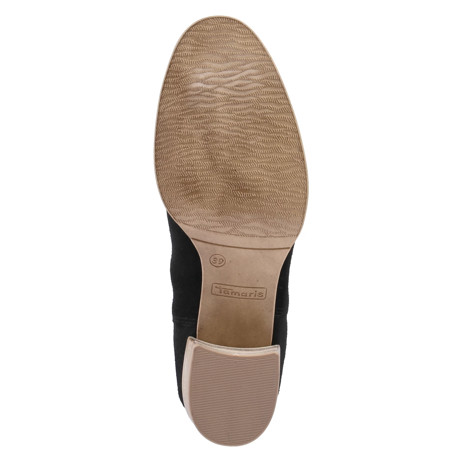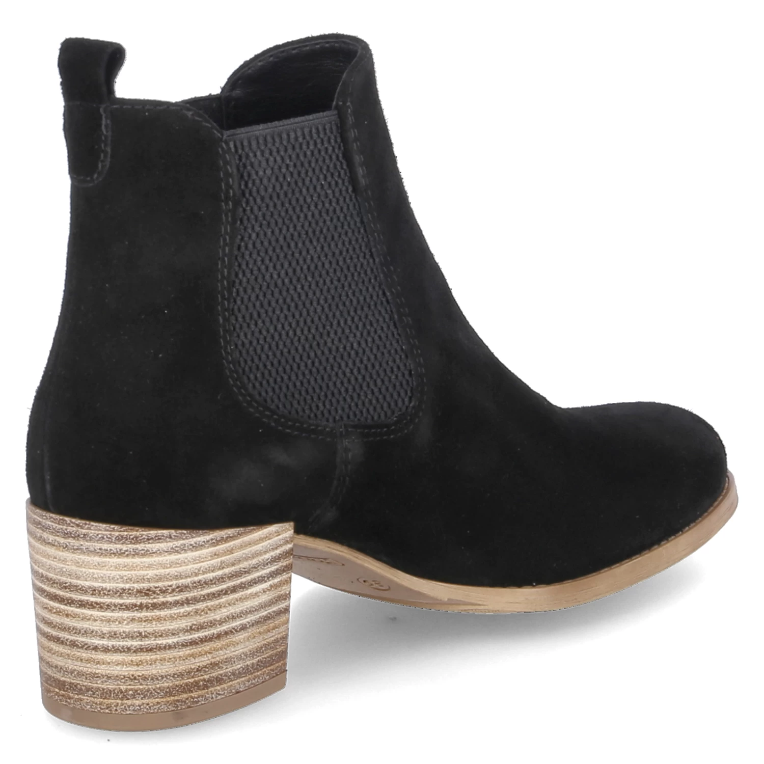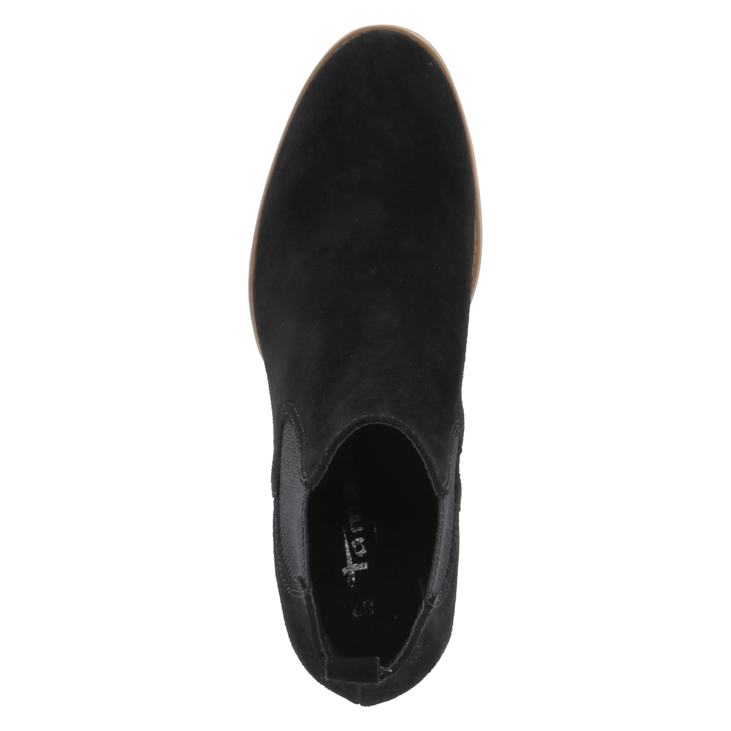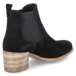 Tamaris Damen Chelsea Boots/ Stiefeletten Schwarz Leder-Textil-Mix – Blockabsatz in Holzoptik – seitliche Elastikeinsätze am Schaft – gepolsterte Decksohle – flexible, rutschhemmende Laufsohle