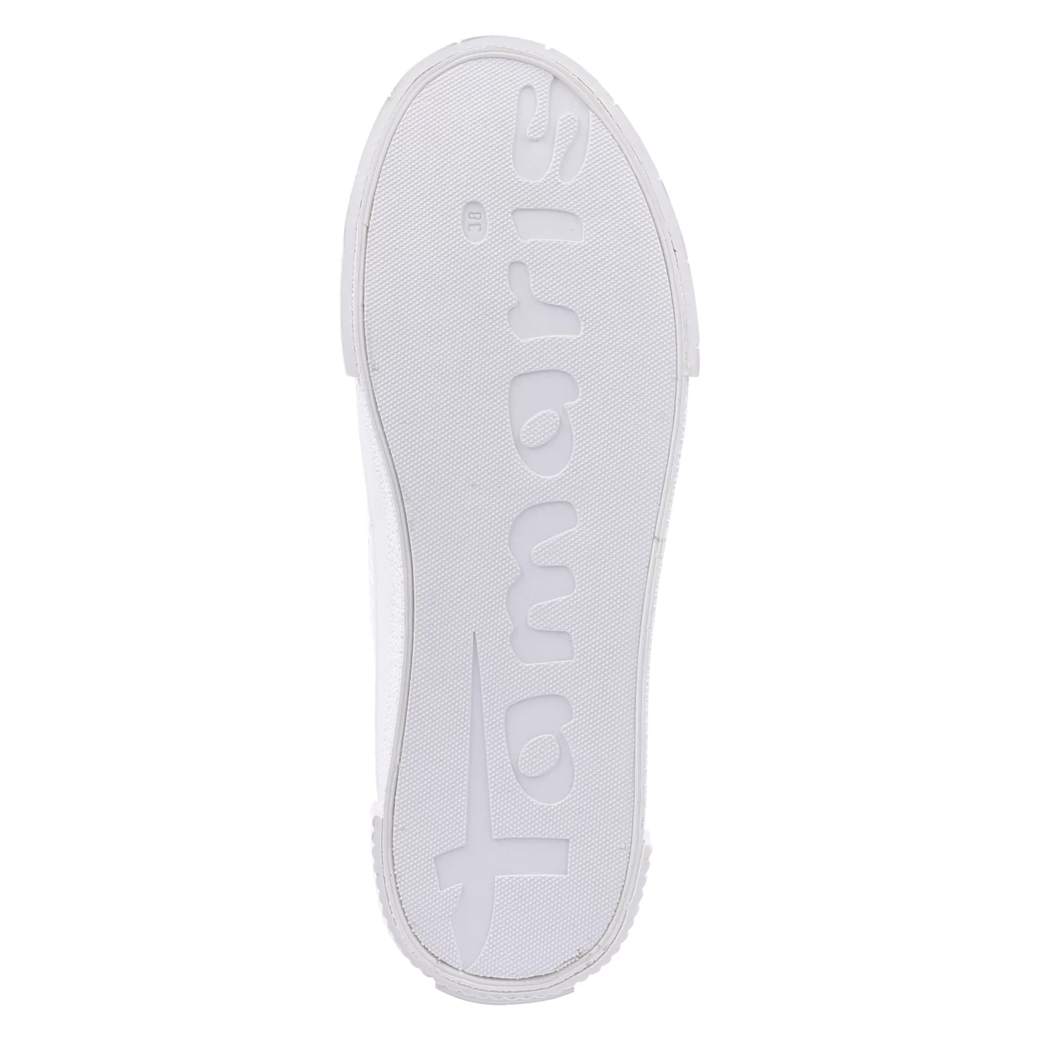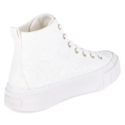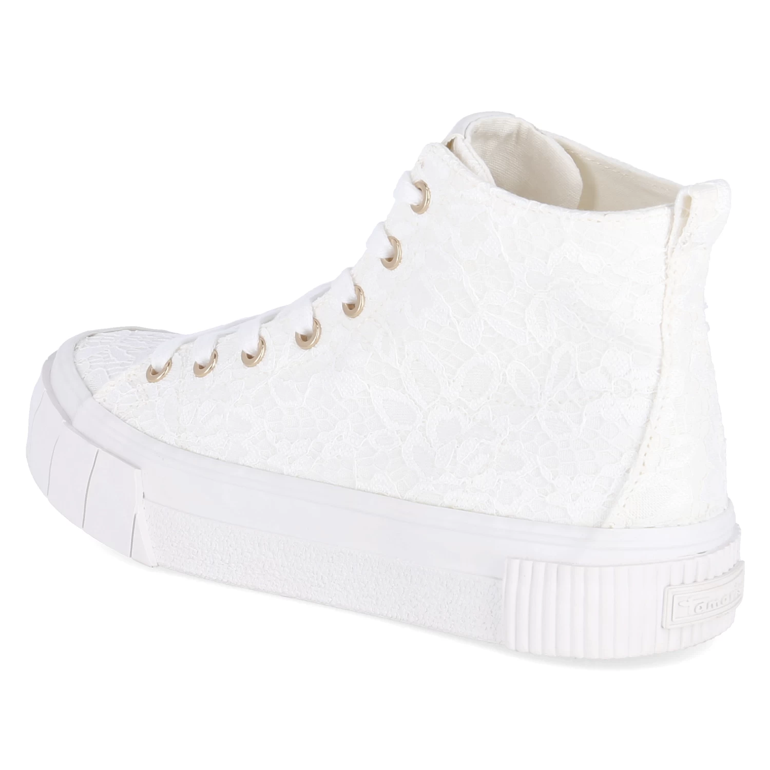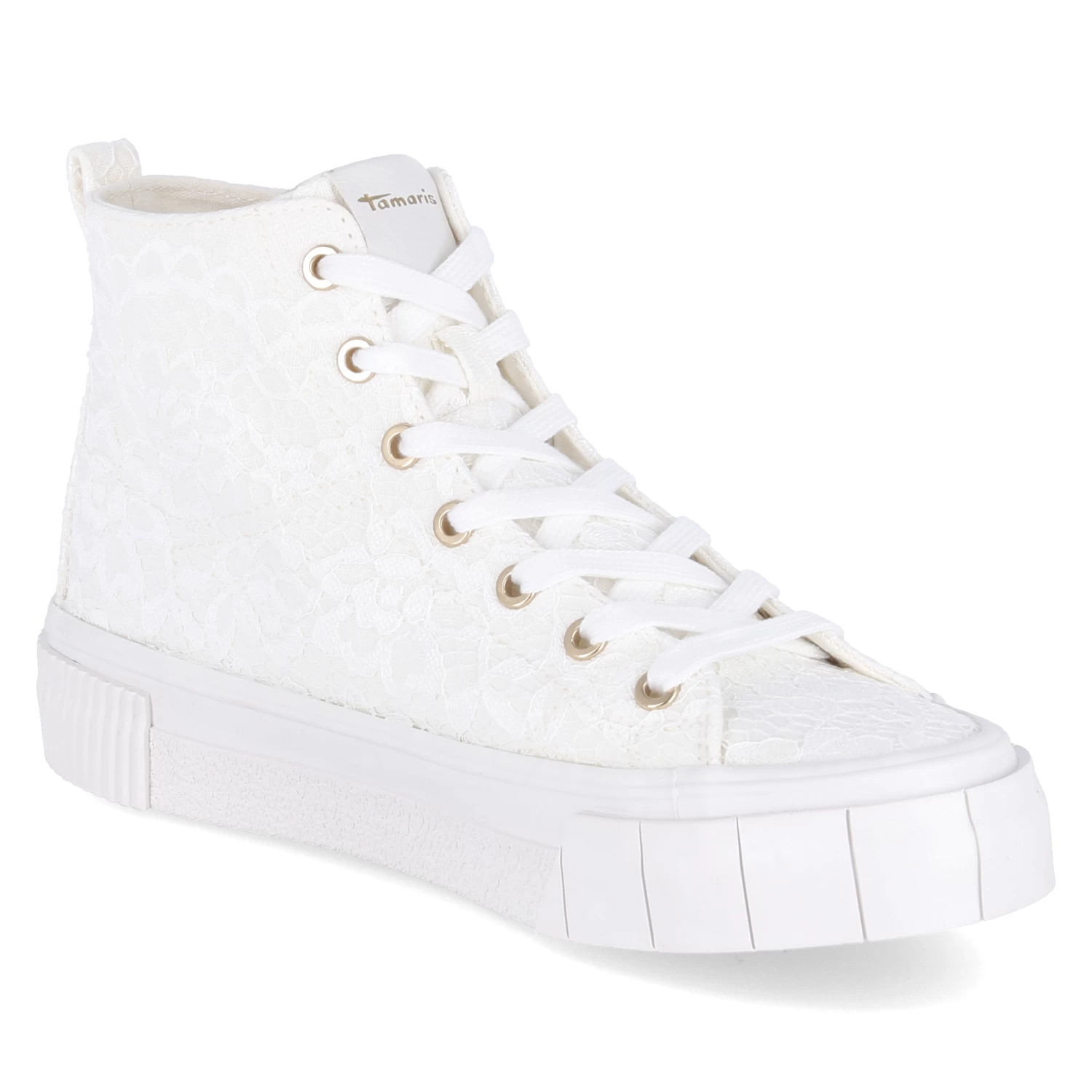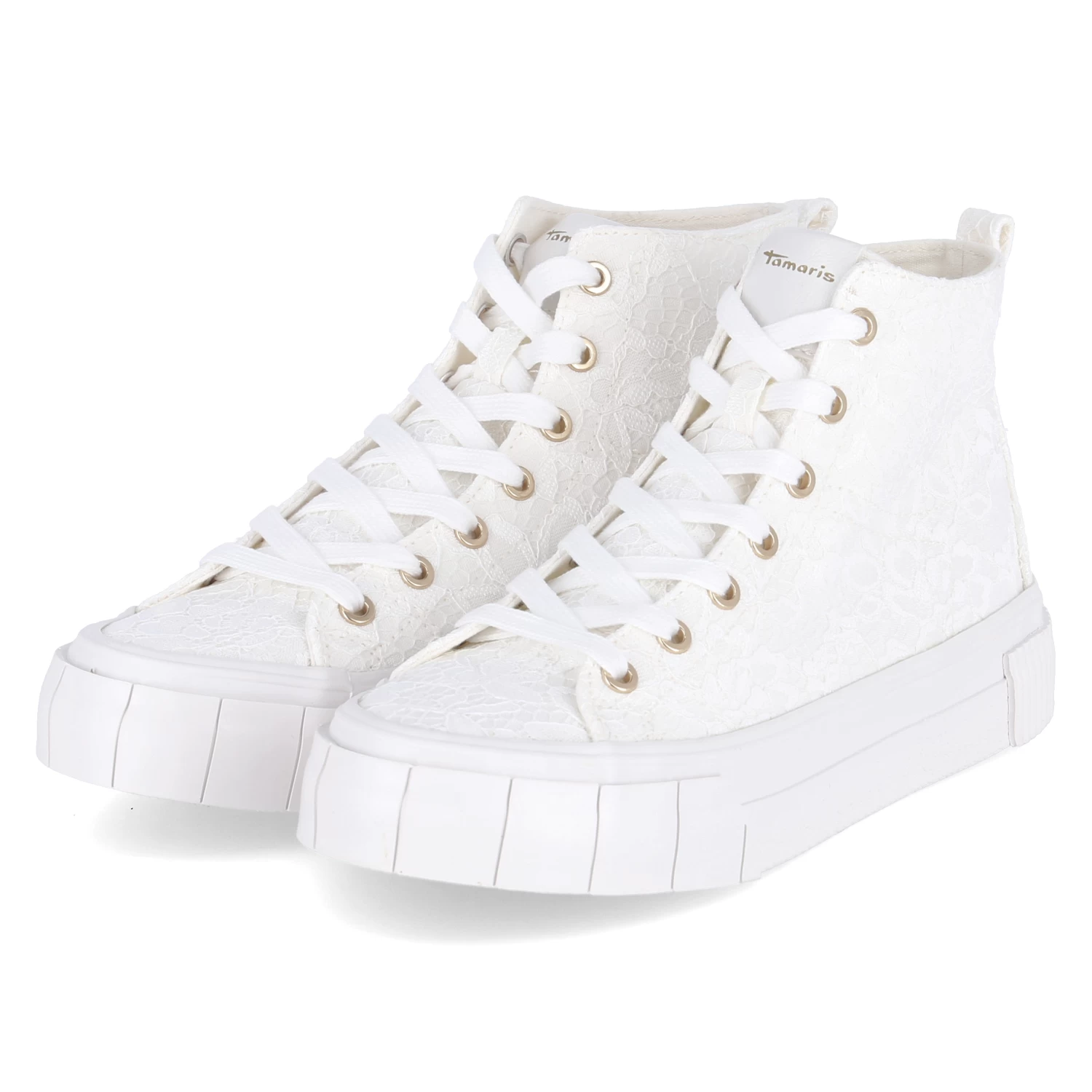 Tamaris Damen High Sneaker WeiĂź Textil – vegan – Oberfläche mit Spitze – SchnĂĽrung mit goldglänzenden Ă–sen – verstärkter Zehen- und Fersenbereich – praktische Anziehlaschen – komfortabel gepolsterte Decksohle – robuste, rutschhemmende Laufsohle mit Plateauoptik und Bumpern