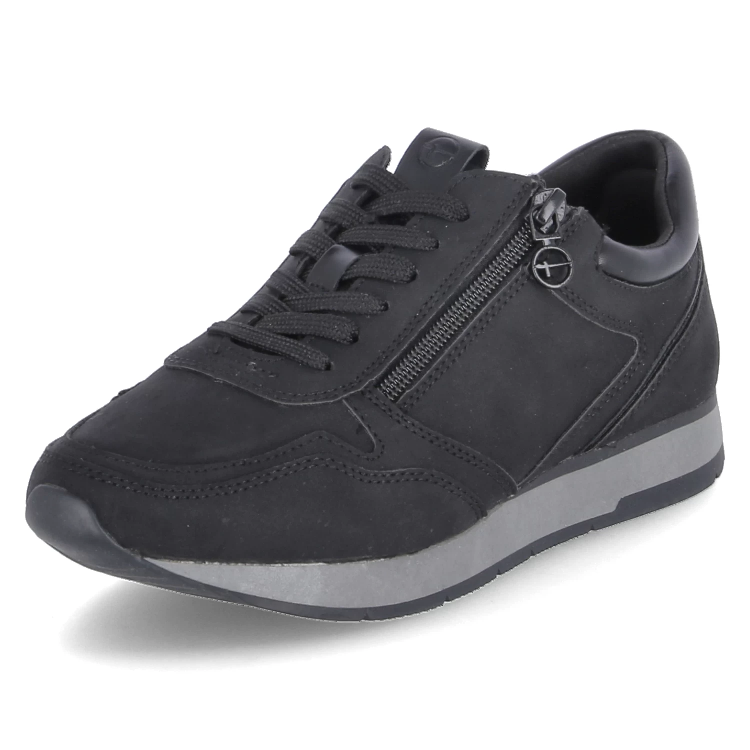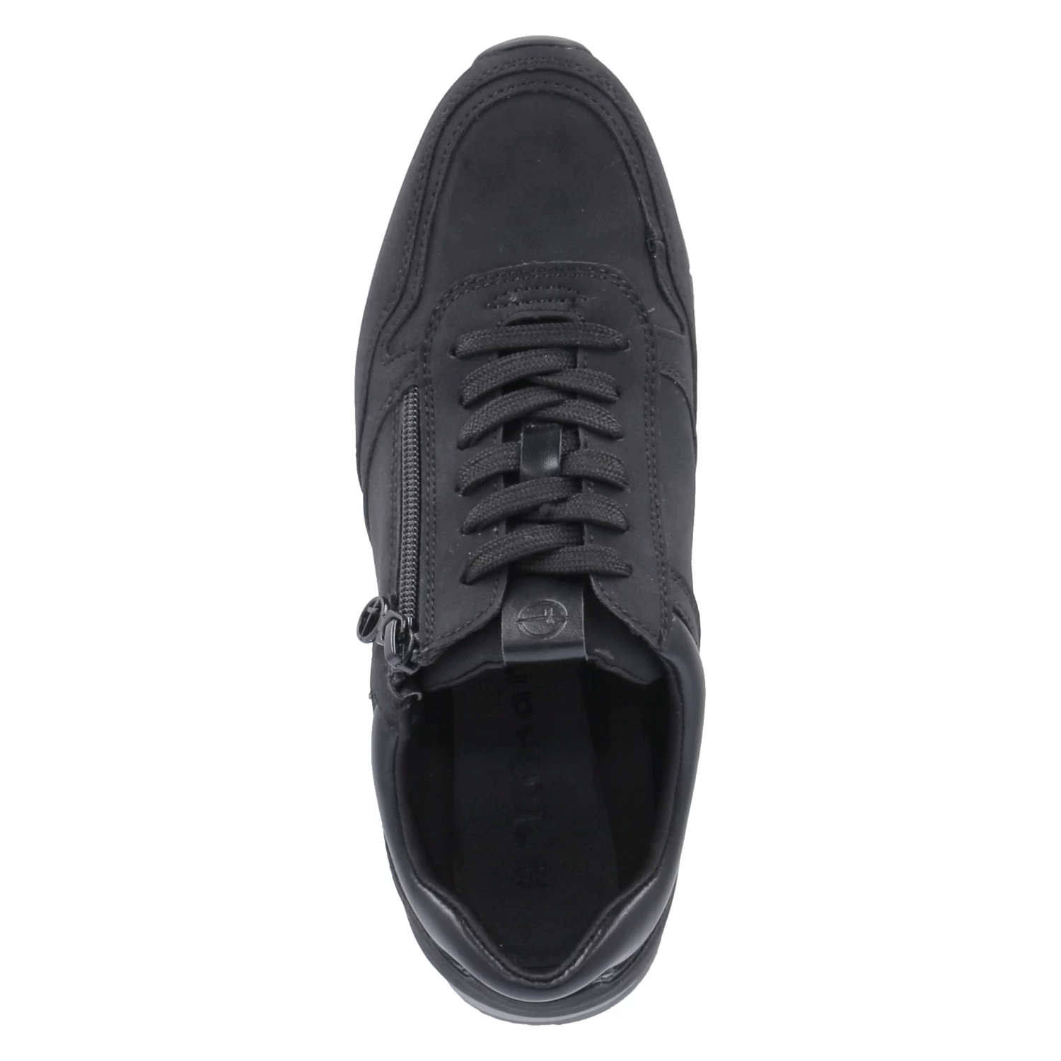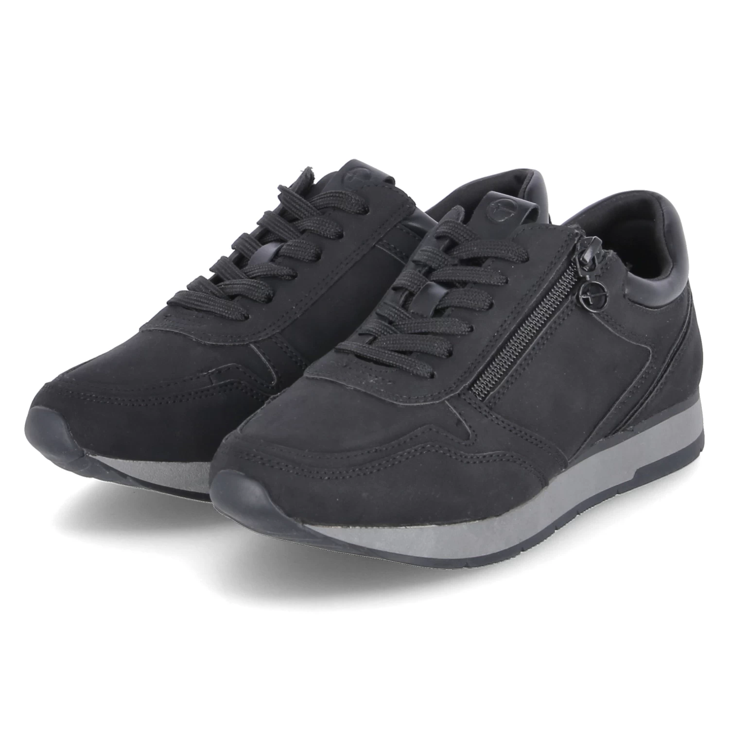 Tamaris Damen SchnĂĽrschuhe/ Low Sneaker Schwarz Synthetik – vegan – SchnĂĽrung und ReiĂźverschluss – verstärkter Zehen- und Fersenbereich – gepolsterter Einstieg – gelabelt – gepolstertes WechselfuĂźbett – dezente Zierstreifen – flexible, rutschhemmende Laufsohle – recyceltes Lining