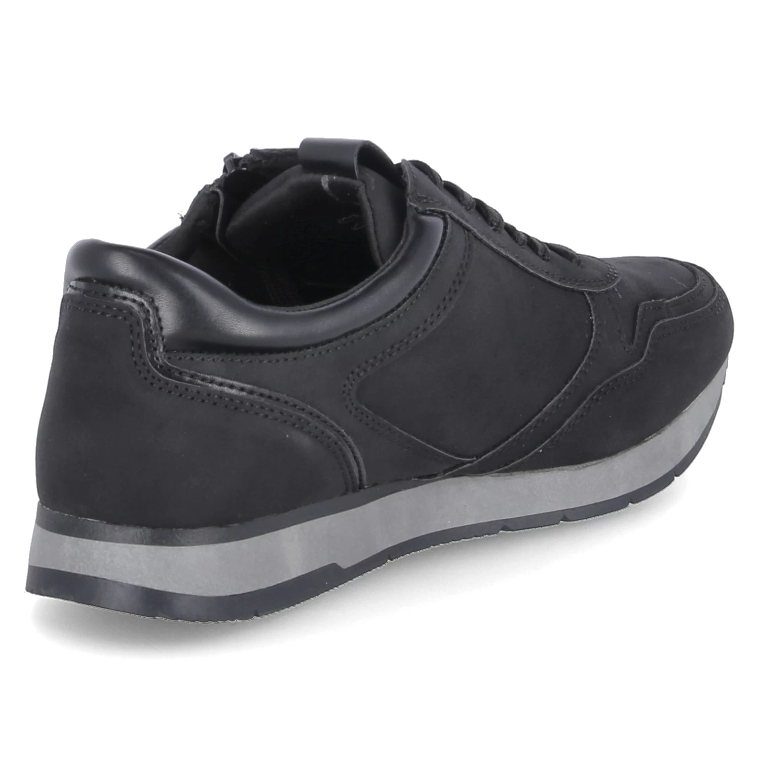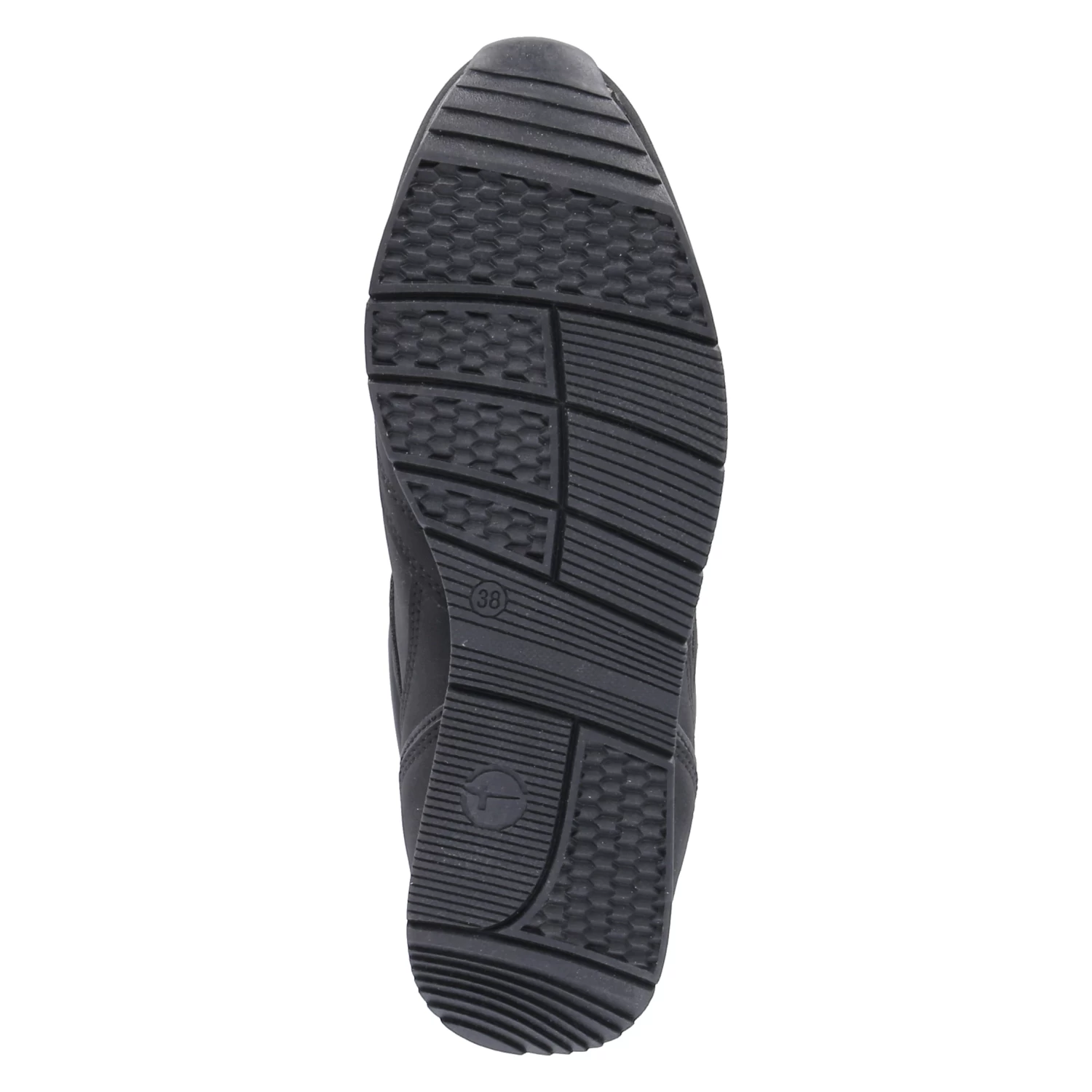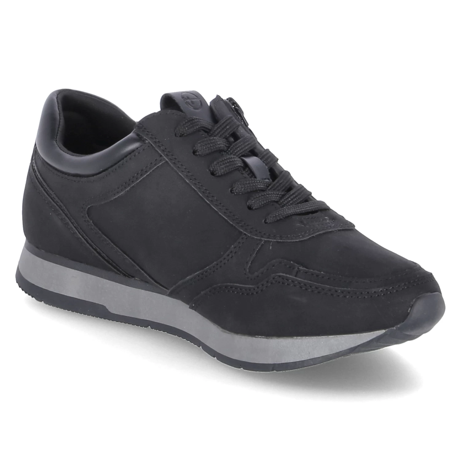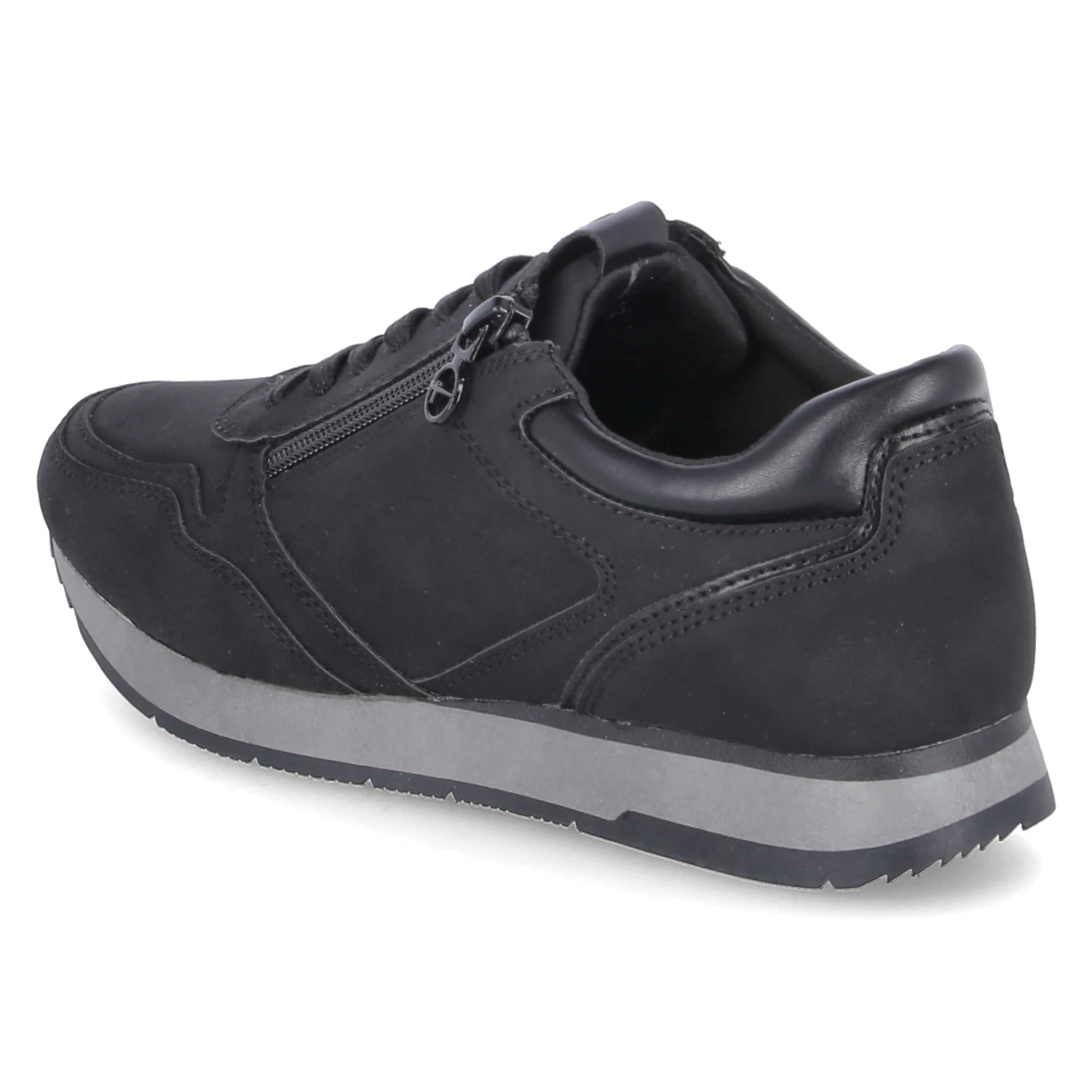 Tamaris Damen SchnĂĽrschuhe/ Low Sneaker Schwarz Synthetik – vegan – SchnĂĽrung und ReiĂźverschluss – verstärkter Zehen- und Fersenbereich – gepolsterter Einstieg – gelabelt – gepolstertes WechselfuĂźbett – dezente Zierstreifen – flexible, rutschhemmende Laufsohle – recyceltes Lining