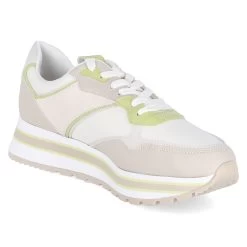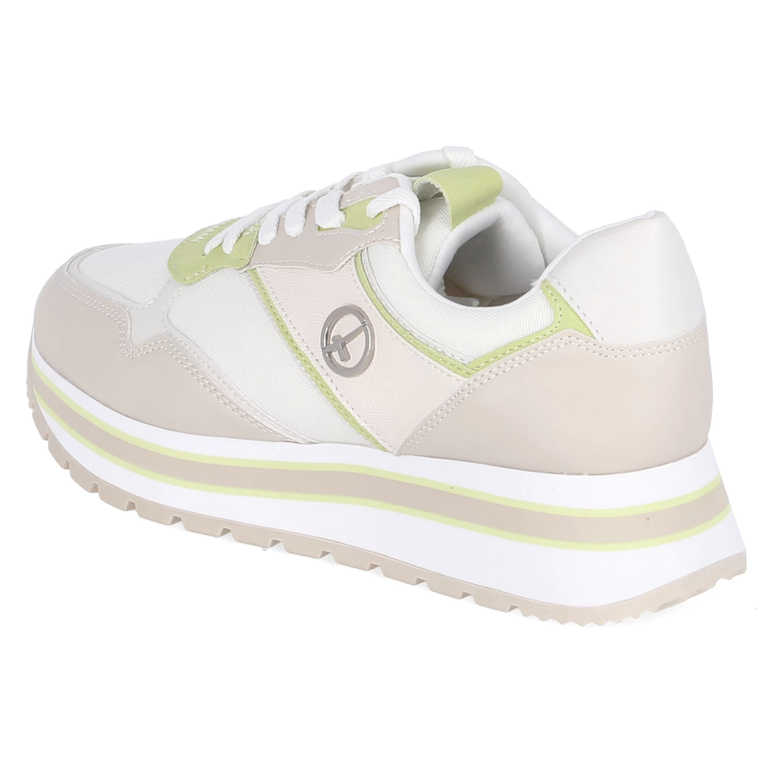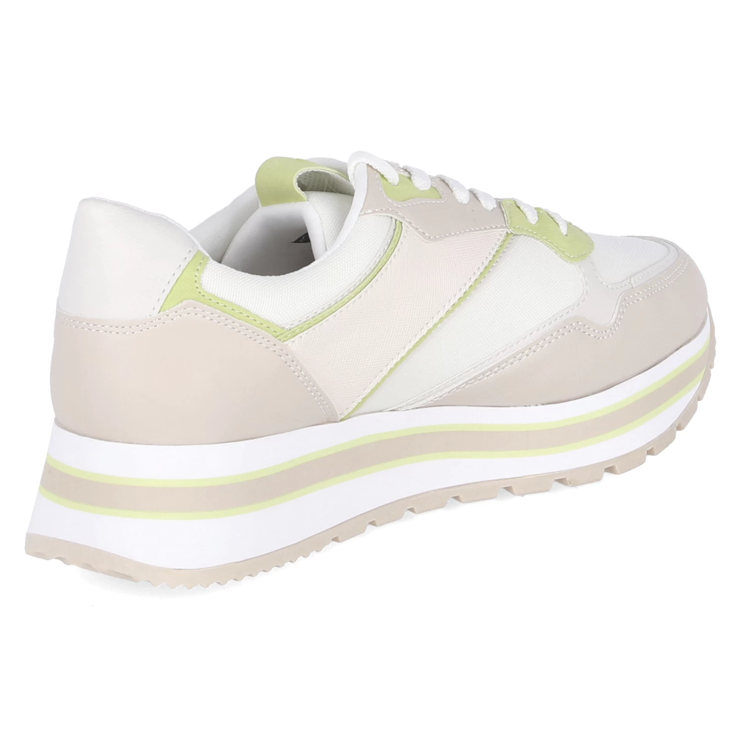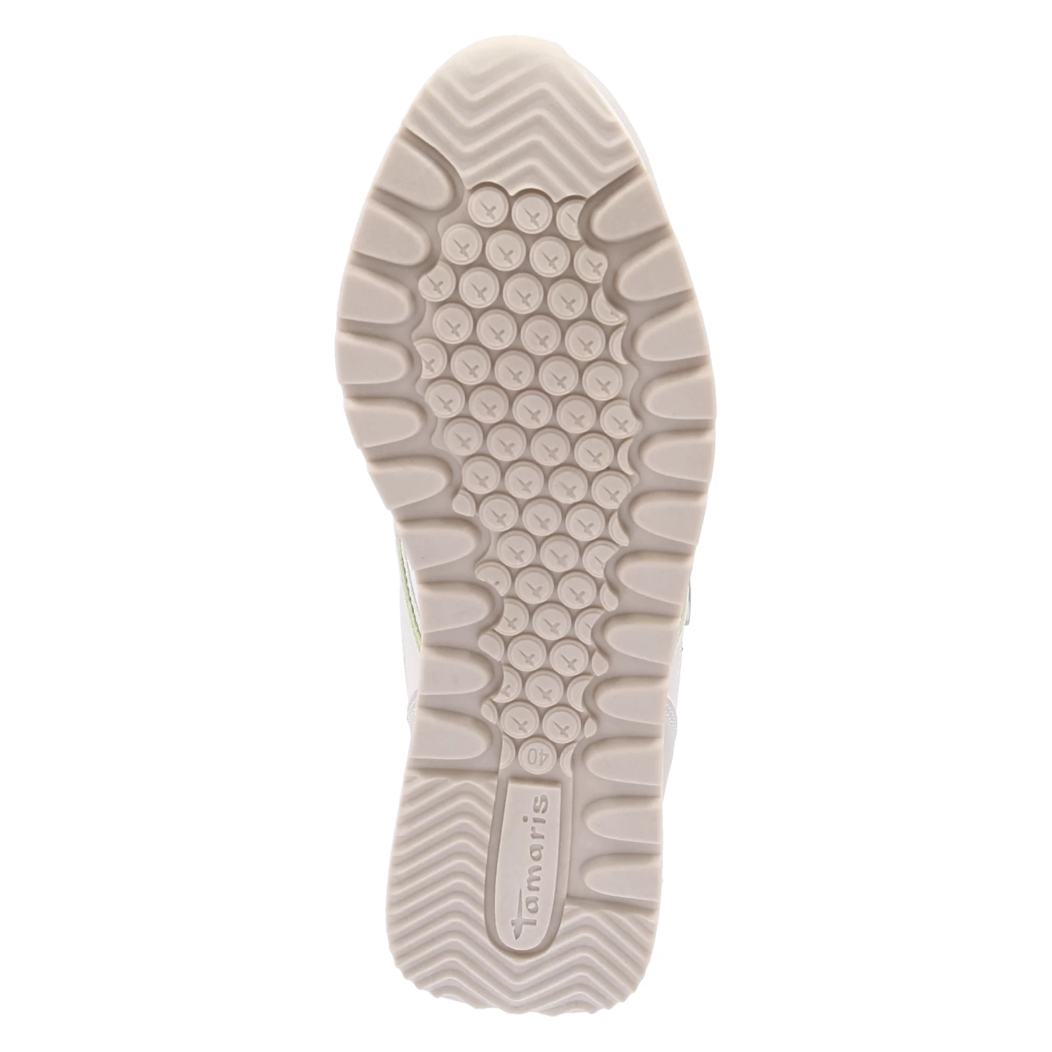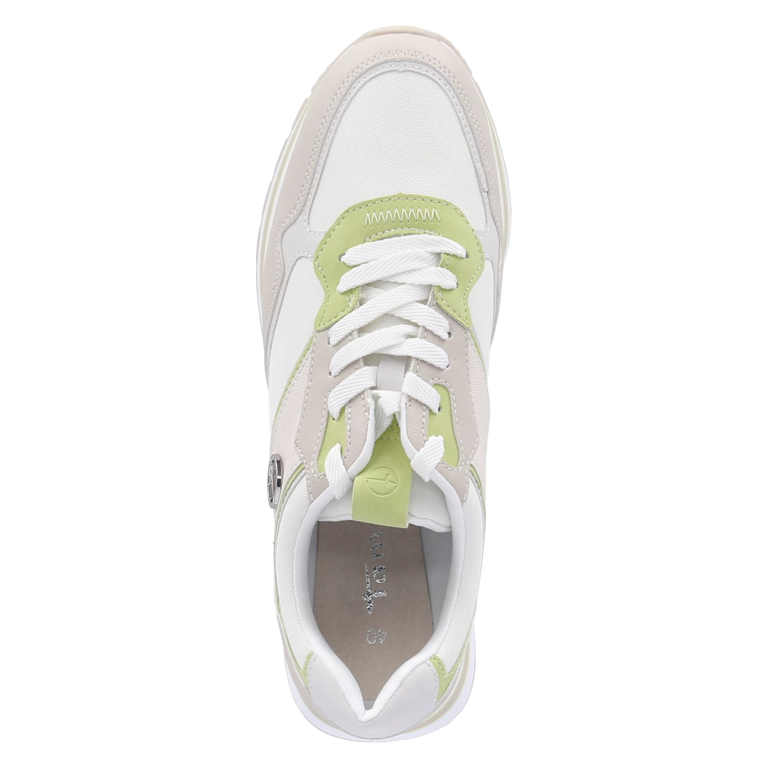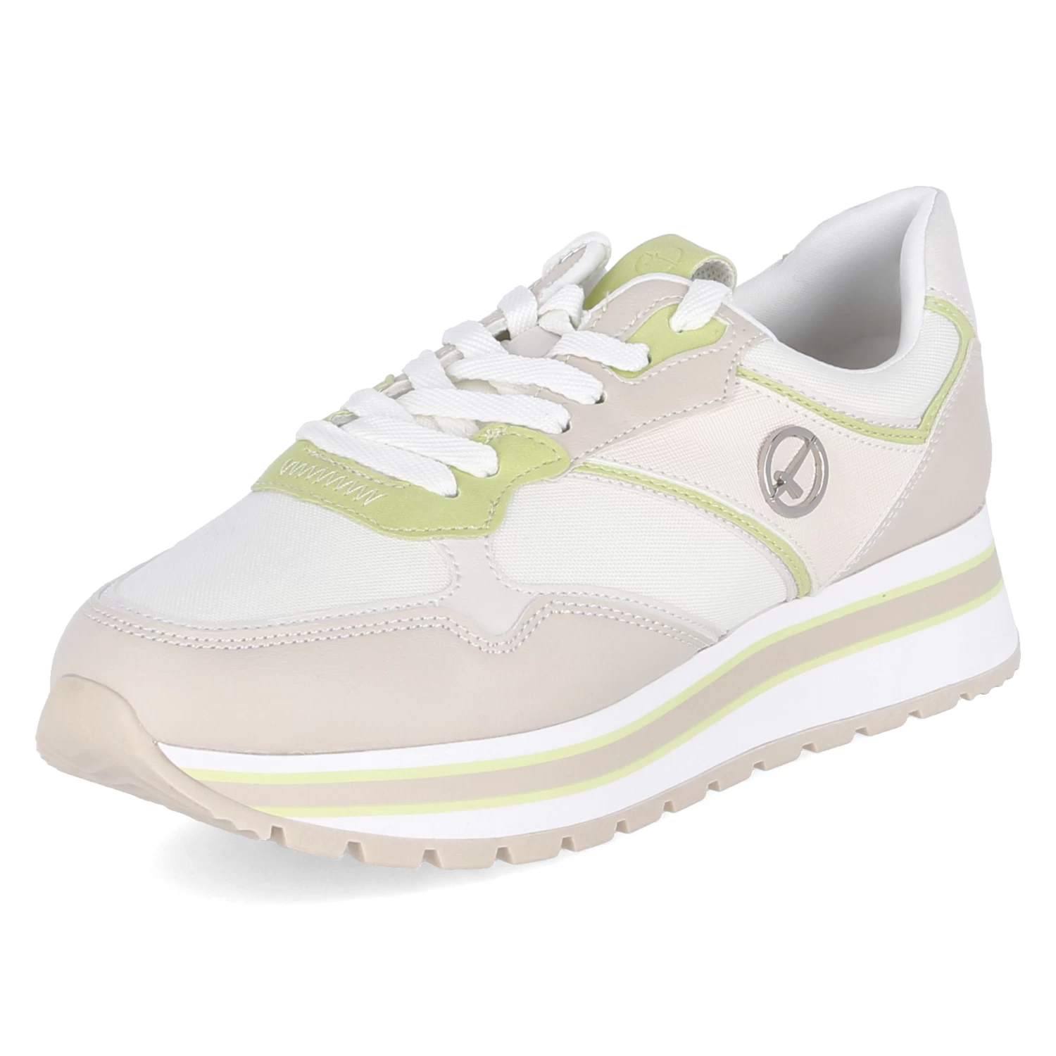 Tamaris Damen Low Sneaker Beige Textil-Synthetik-Mix – zum Teil aus recycelten Materialen – vegane Schuhe – sportliches Design – grĂĽne und weiĂź Highlights – typische Markendetails – SchnĂĽrsenkel – Anziehlasche – verstärkter Zehen- und Fersenbereich – gepolsterter Einstieg – leichtes Textilfutter – gepolsterte Wechseldecksohle – flexible, rutschhemmende Profilsohle