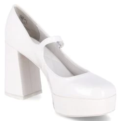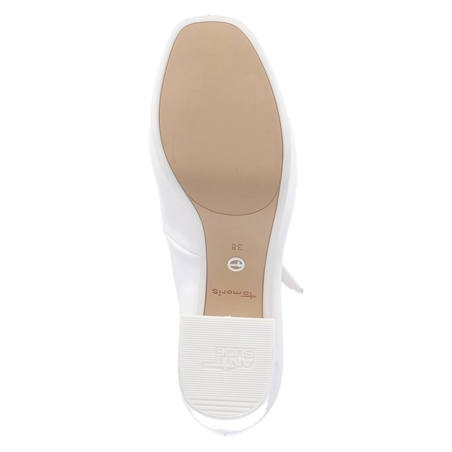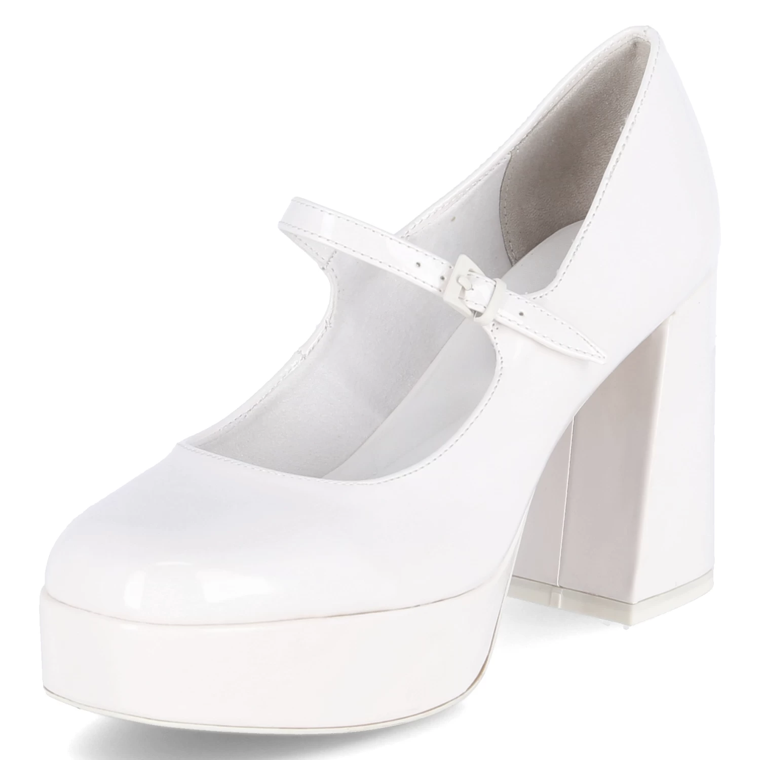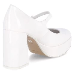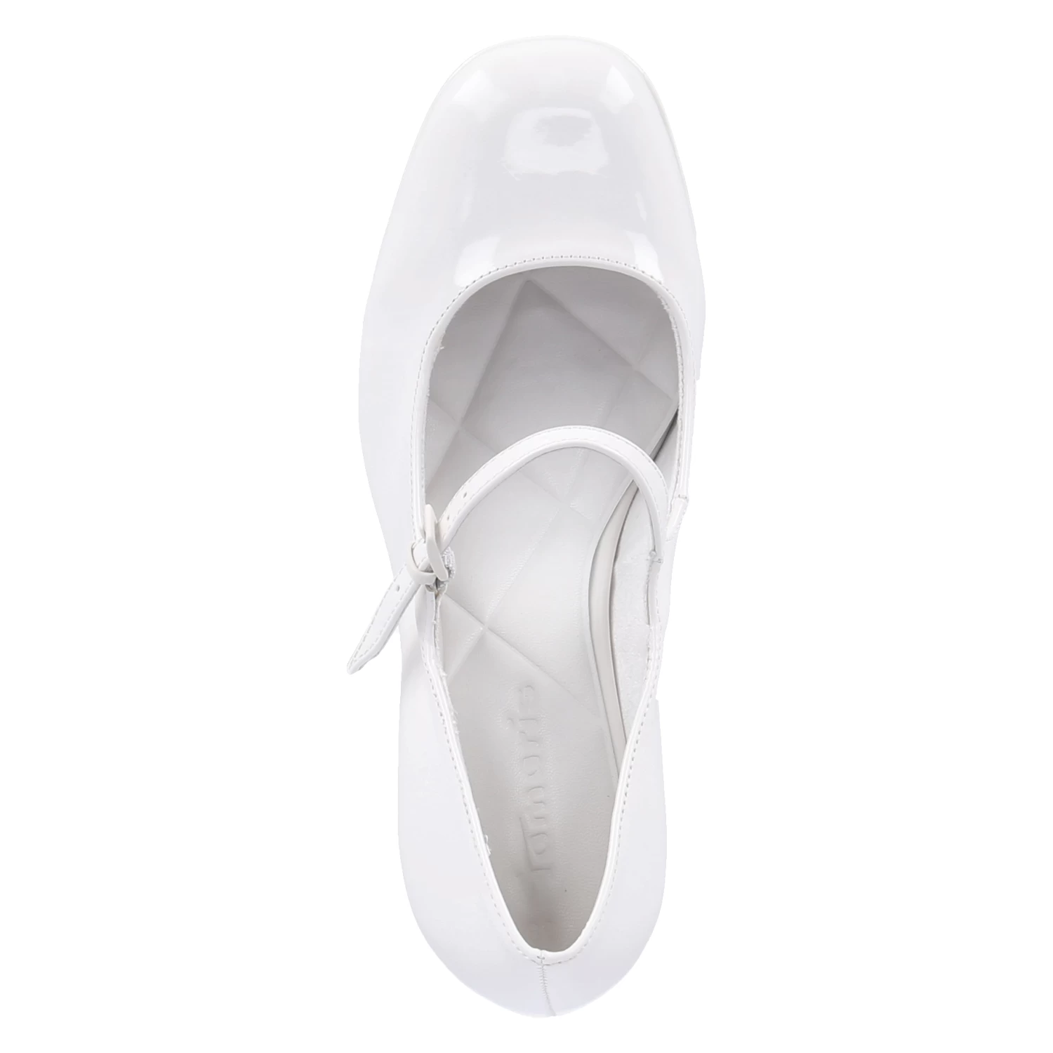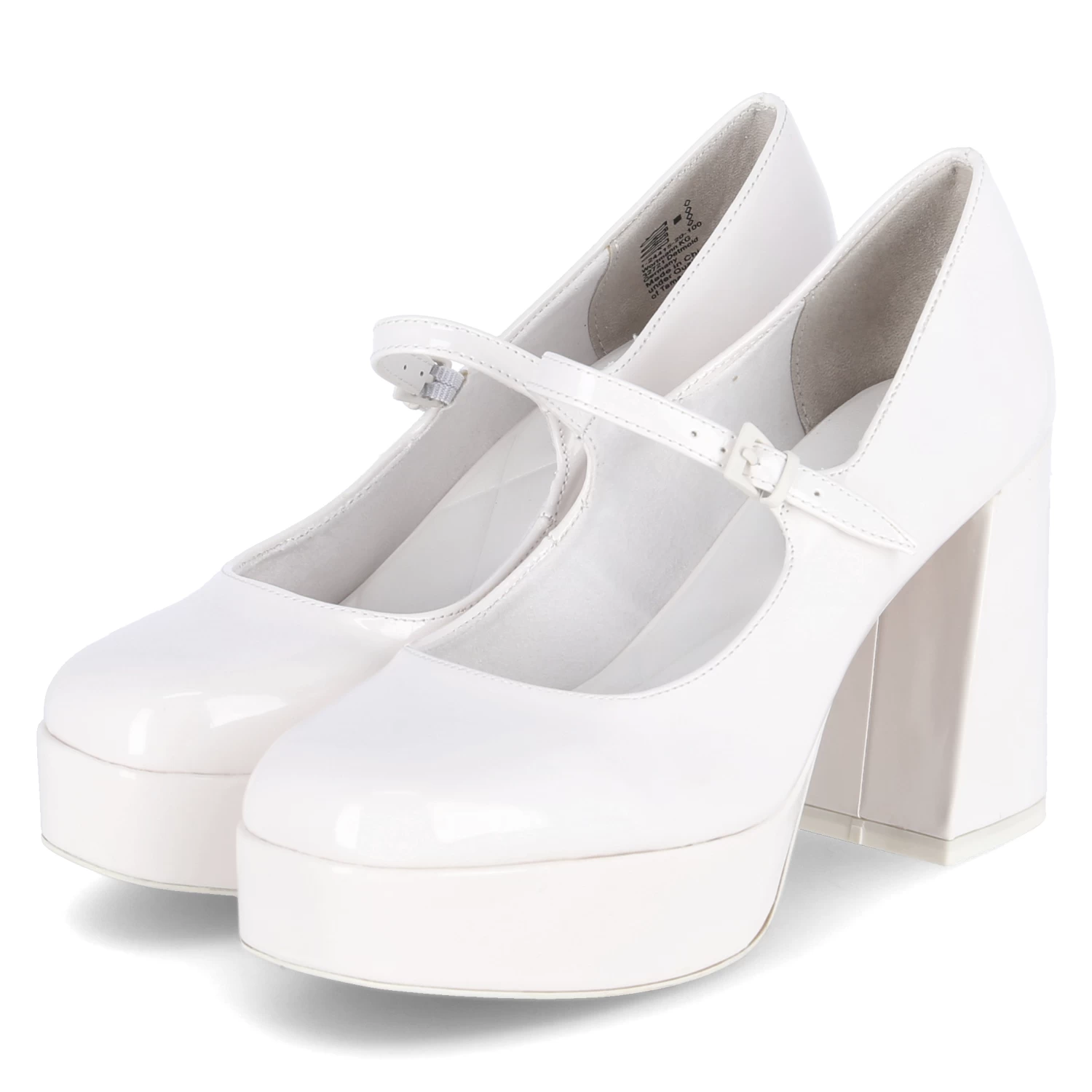 Tamaris Damen Plateau-Pumps/ Mary Janes WeiĂź Synthetik – Lackoberfläche – vegan – ca. 10 cm hoher Chunky Heel – Plateauhöhe ca. 4 cm – gut gepolstertes FuĂźbett – Riemen mit Schnalle und Elastikeinsatz