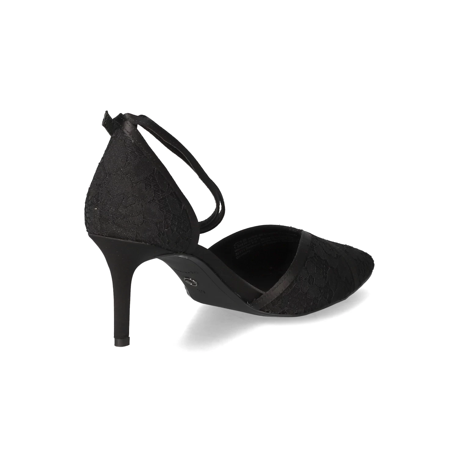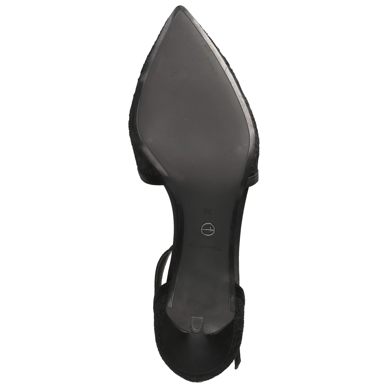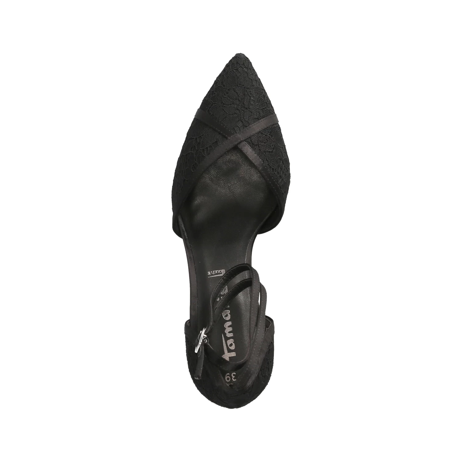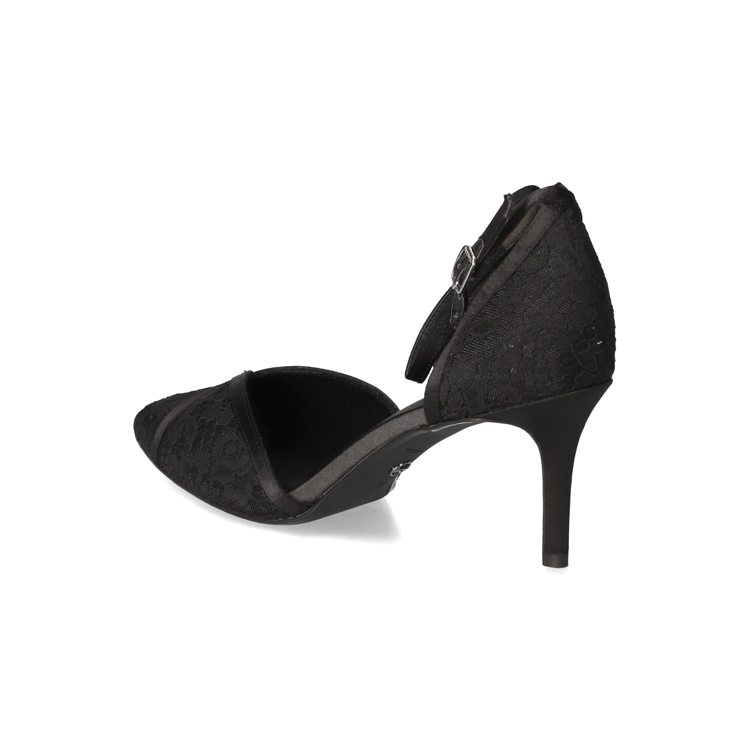 Tamaris Damen Pumps Schwarz Textil – vegane Schuhe – elegantes Spitzendesign – verstärkte Ferse – Knöchelriemen mit Schnalle und Dornverschluss – gepolsterte Decksohle – flexible, rutschhemmende Laufsohle – eleganter Stiletto Absatz