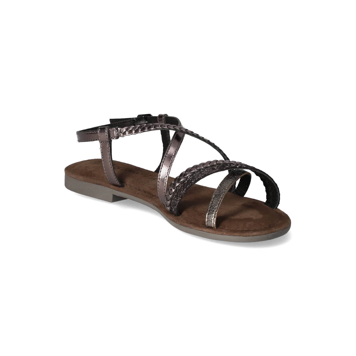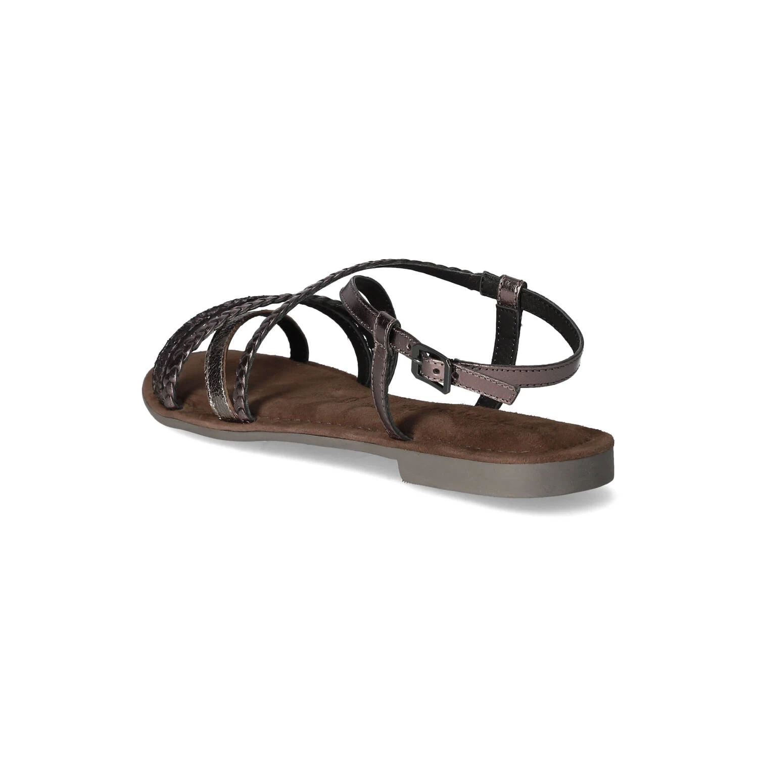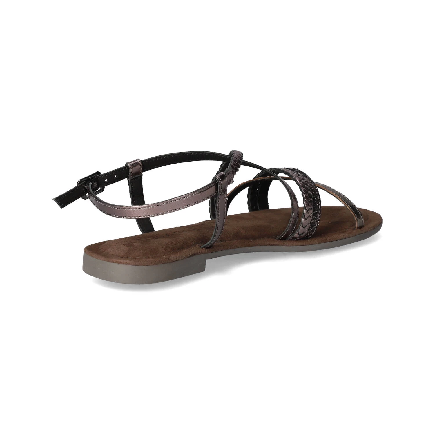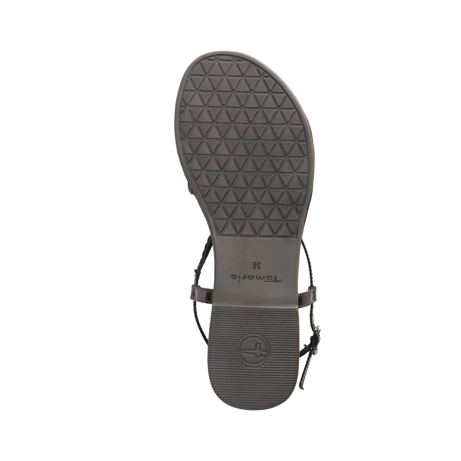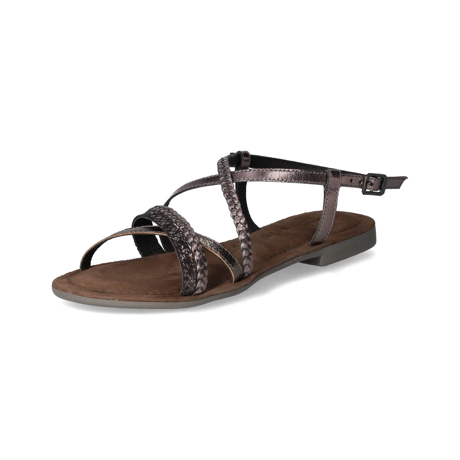 Tamaris Damen Sandalen/ Riemchensandalen Braun Glattleder – teilweise geflochtene Riemen – glänzende Oberfläche – Knöchelriemen mit verstellbarer Schnalle und Elastikeinsatz – gepolsterte Decksohle – flexible, rutschhemmende Laufsohle