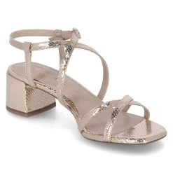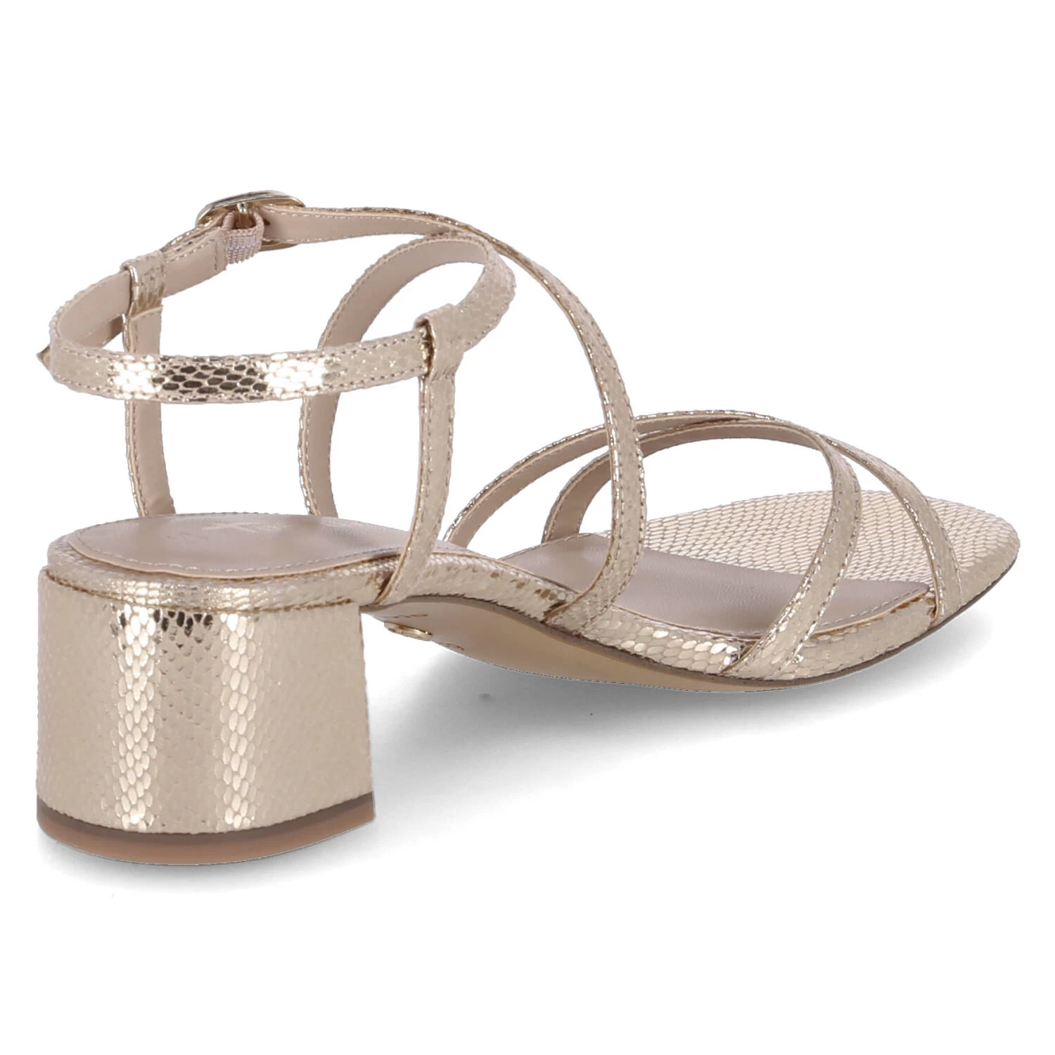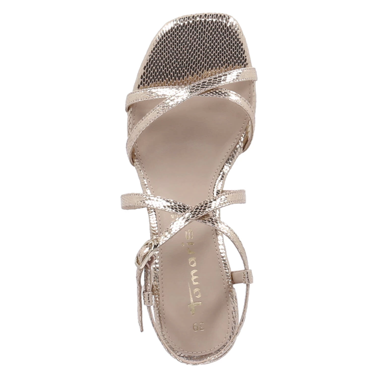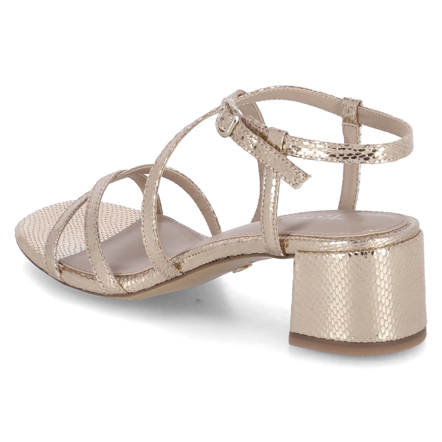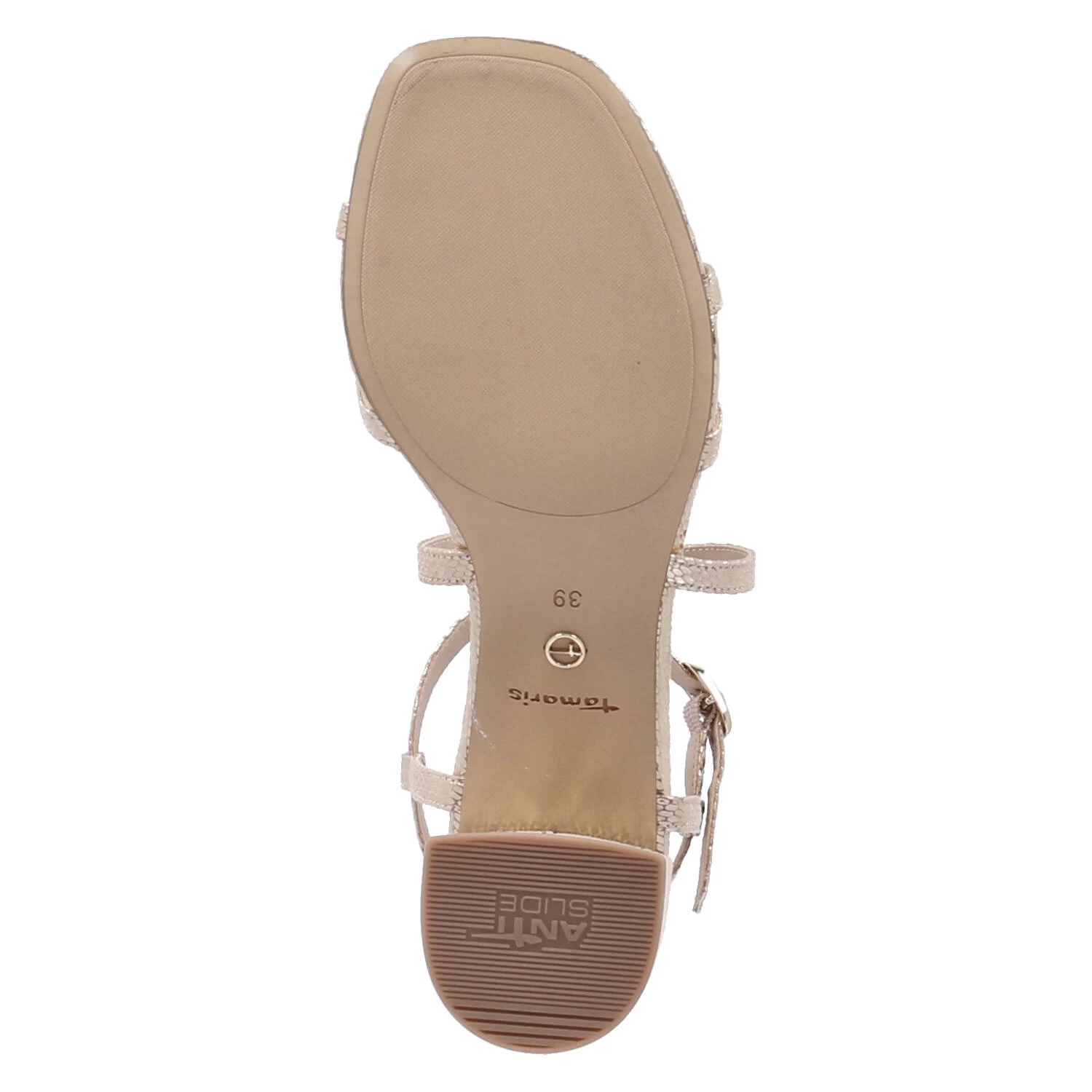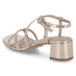 Tamaris Damen Sandalen/ Sandaletten Gold Textil – vegan – Schnalle mit Elastikeinsatz – schmale Riemchen – gepolsterte Decksohle – rutschhemmende Laufsohle – fein strukturierter Print – stabiler Blockabsatz