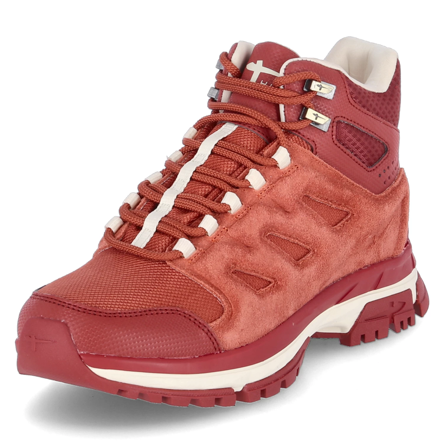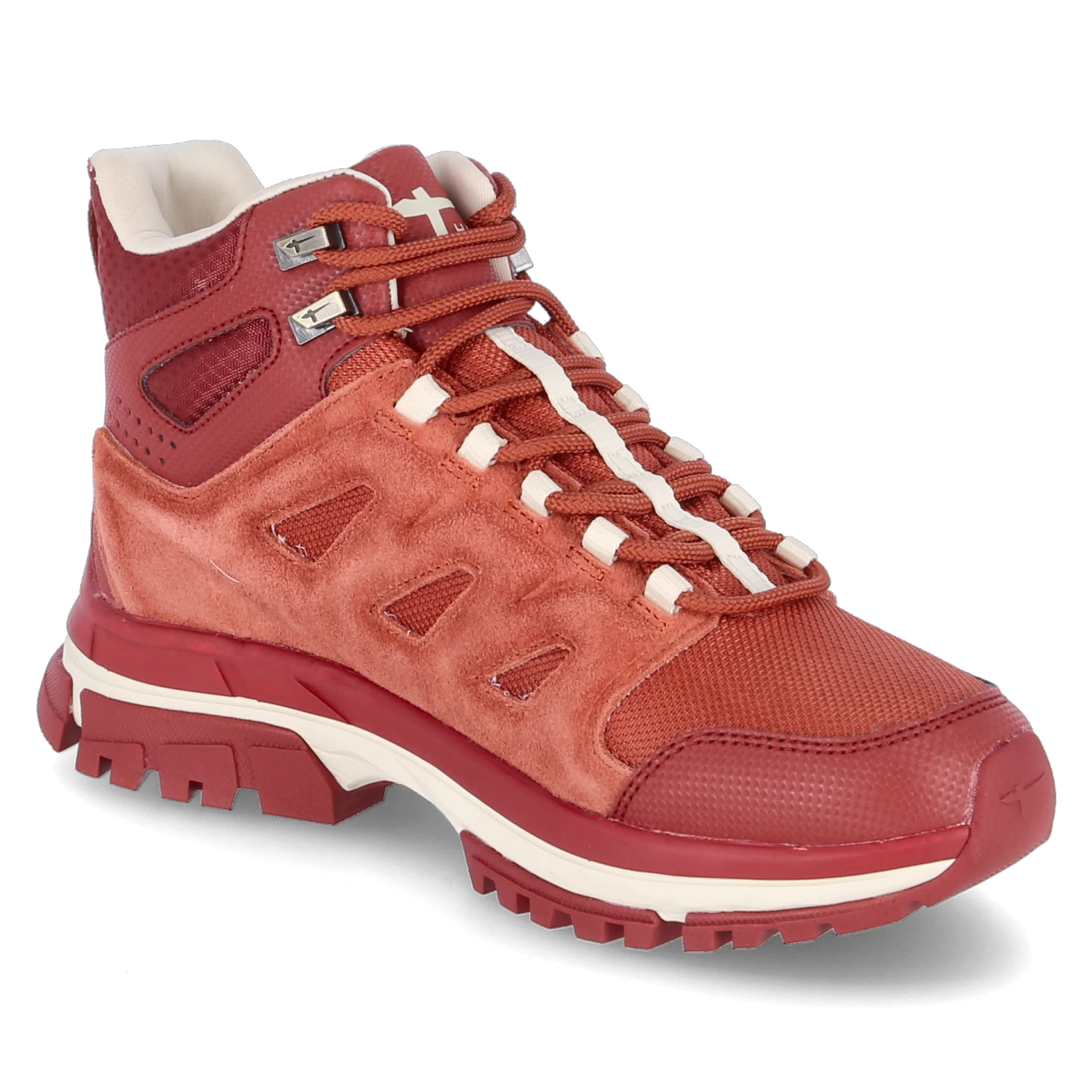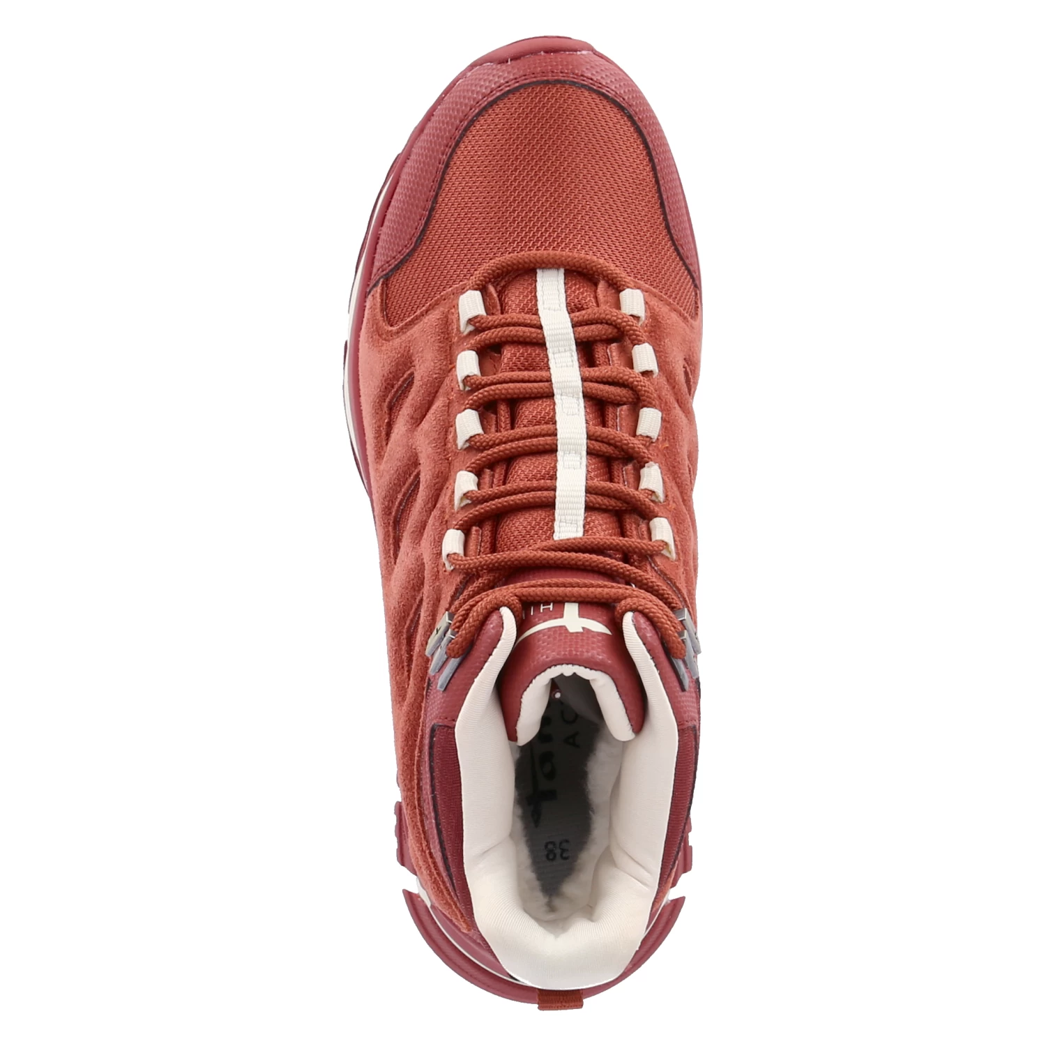 Tamaris Damen Outdoor High Sneaker/ Trekking-Boots Rot-Orange Leder-Textil-Synthetik-Mix – wasserfest, atmungsaktiv (GoreTex) – gepolsterter Einstieg – klassische SchnĂĽrung – warmes Textilfutter – gepolsterte Decksohle – verstärkter FuĂźrahmen – Anziehlasche – robuste und rutschhemmende Profillaufsohle
